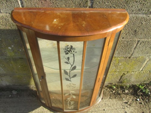 THIS IS A WALNUT VENEERED DISPLAY CABINET FROM THE 1930s / 40s. AN ELEGANT PIECE WITH GLAZED DOOR IN THE FRONT. IT STANDS ON CABRIOLET LEGS.