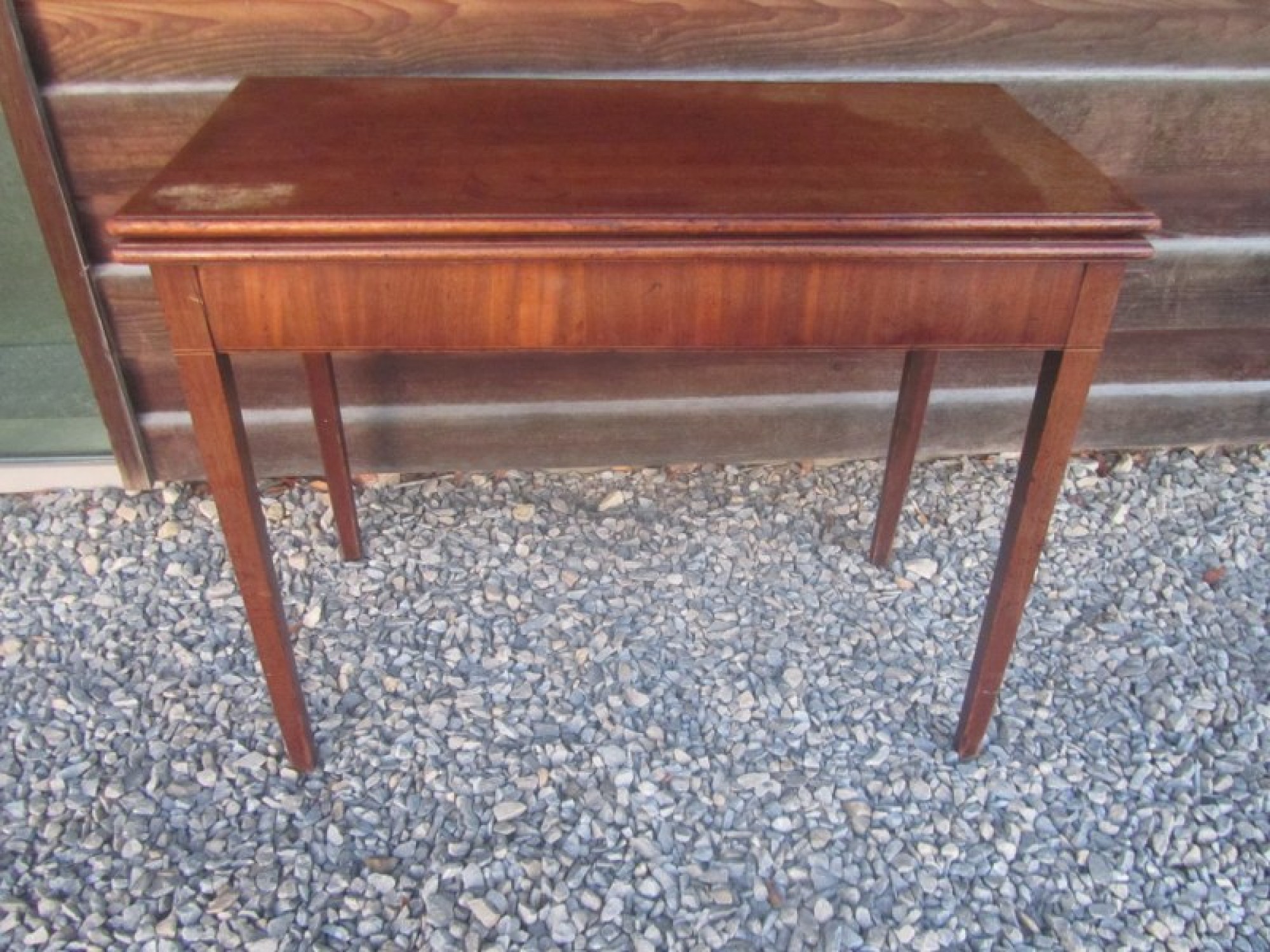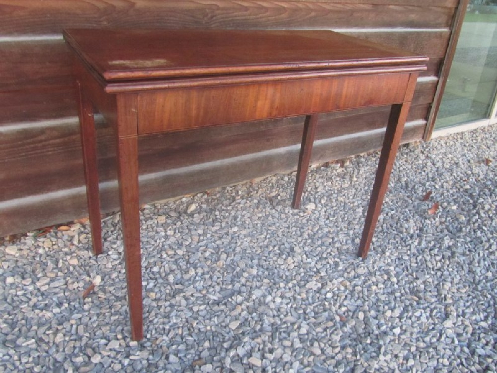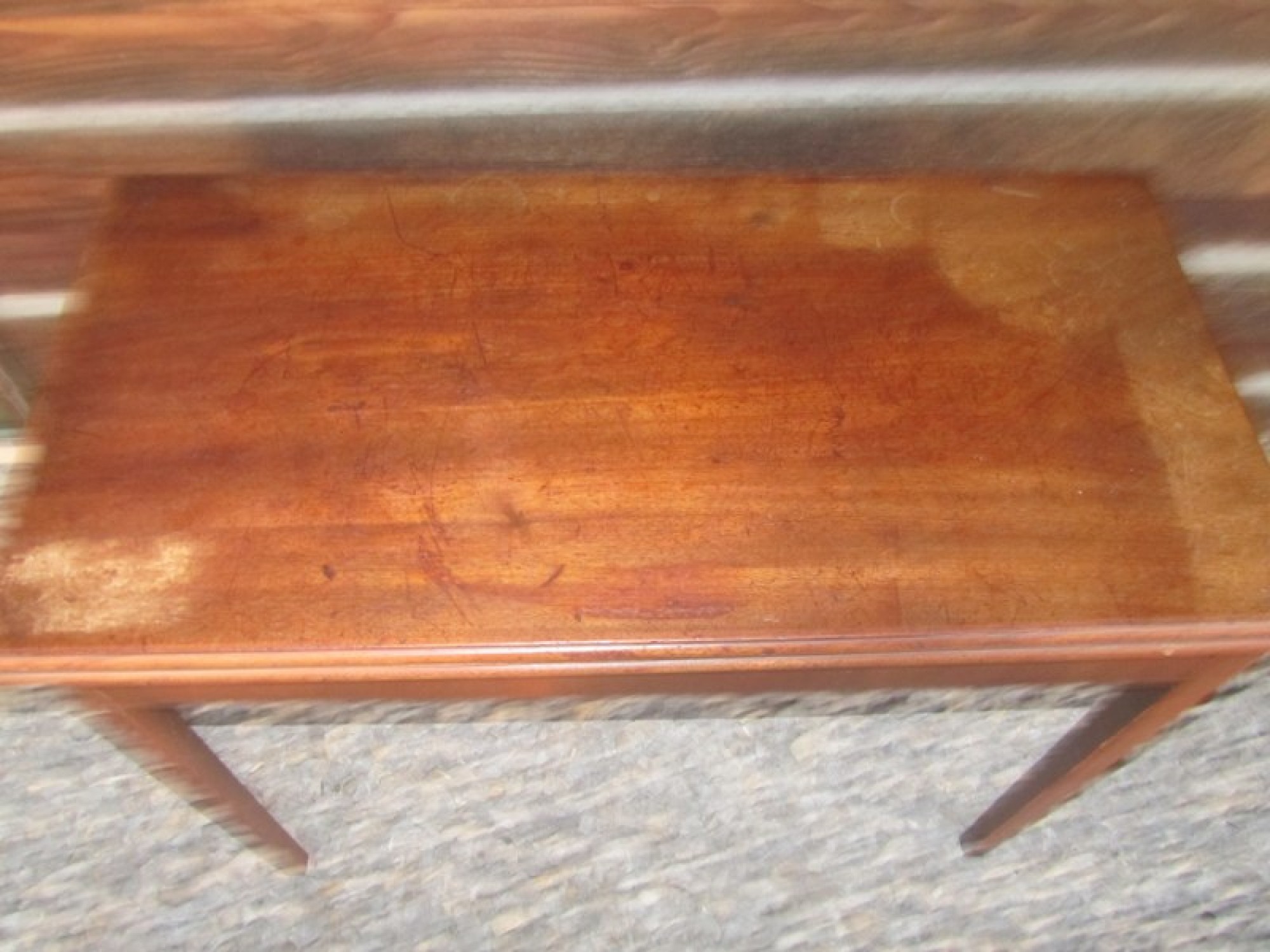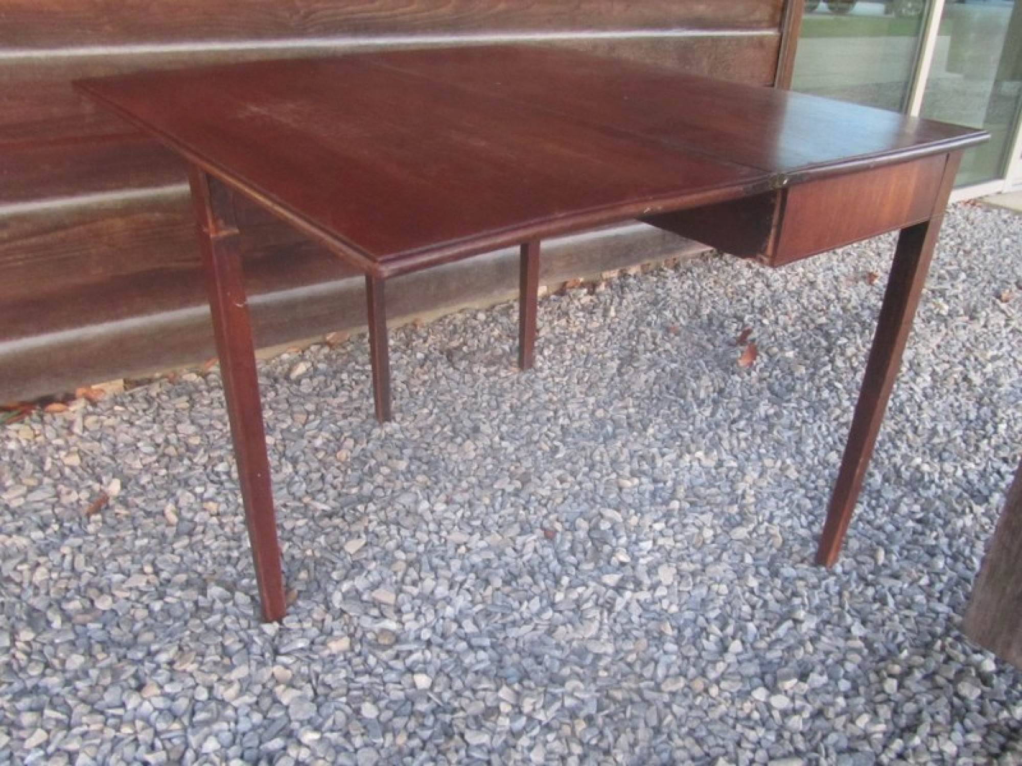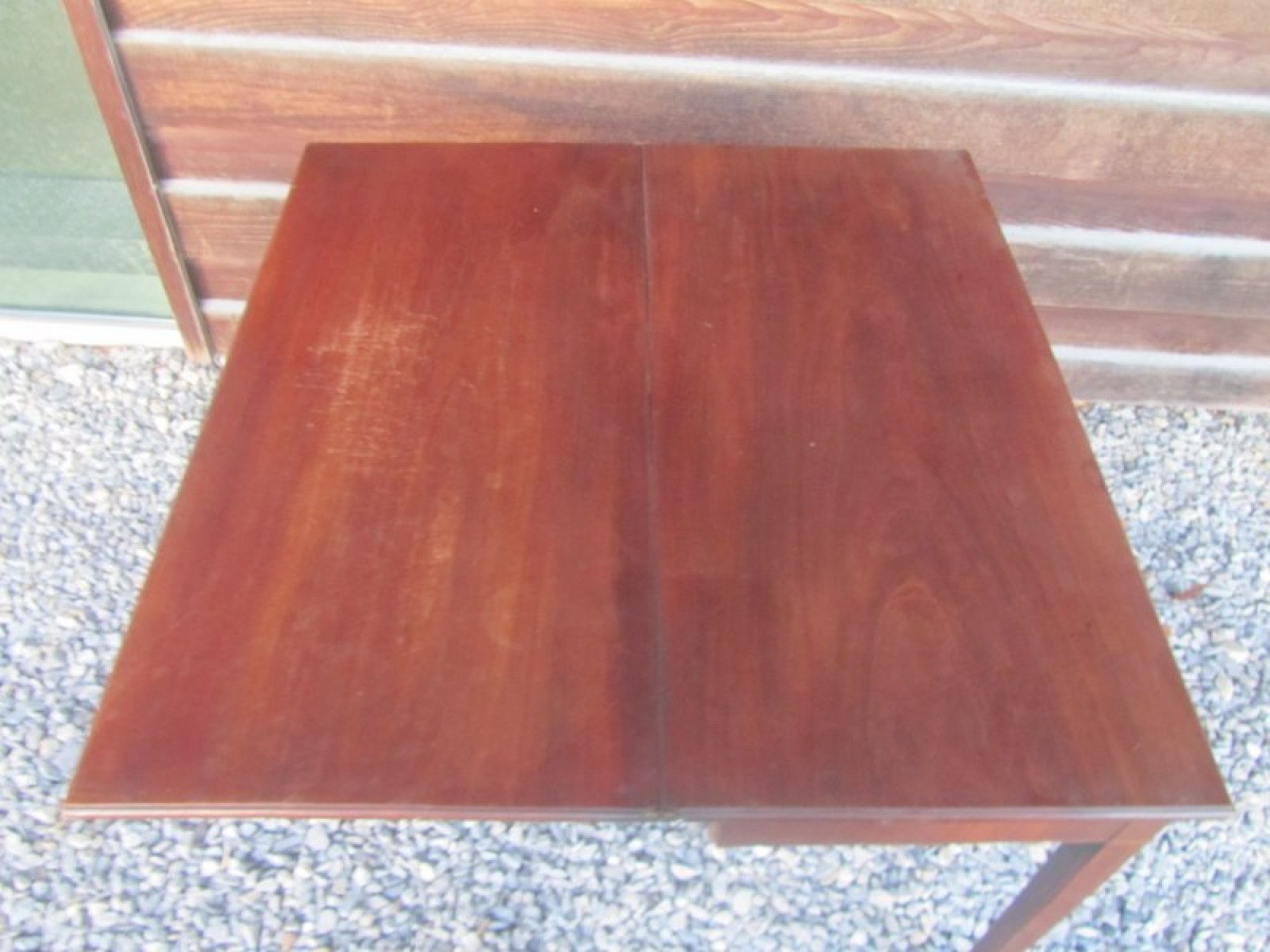 MAHOGANY TABLE TOP, IT FOLDS OUT TO MAKE A LARGE SQUARE TABLE TOP. A PRACTICAL AND STYLISH TABLE. IN AVERAGE CONDITION, SOME WEAR.