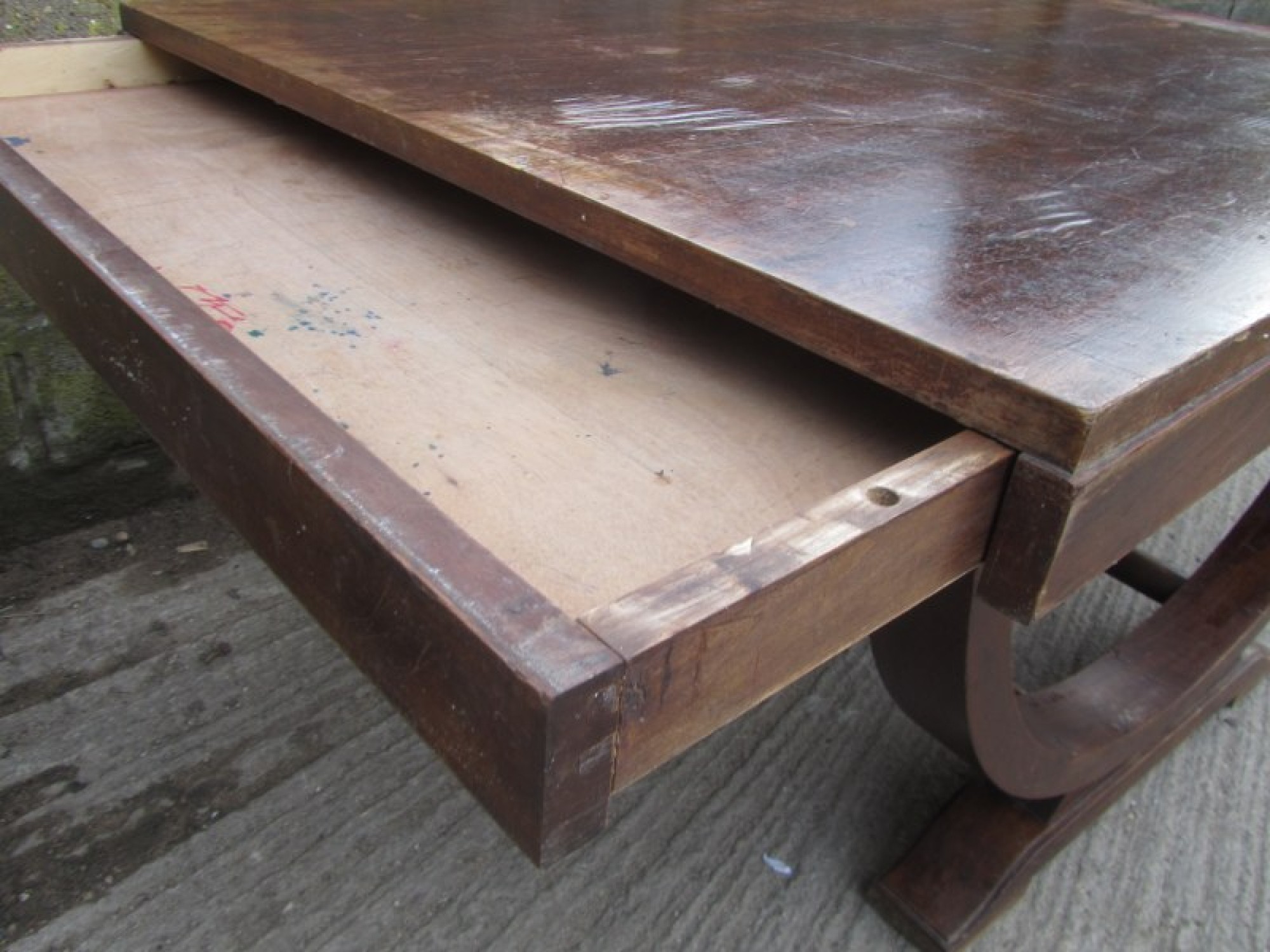 THIS IS AN ART DECO STYLE DINING TABLE. IT PROBABLY DATES FROM THE 1940s/50s. THE TABLE HAS A STYLISH ART DECO BASE, THE TOP IS WOOD VENEER. IT IS FADED, SOME MARKS AND 'WRINKLES' TO THE VENEER. IT SEATS 4 DINERS.