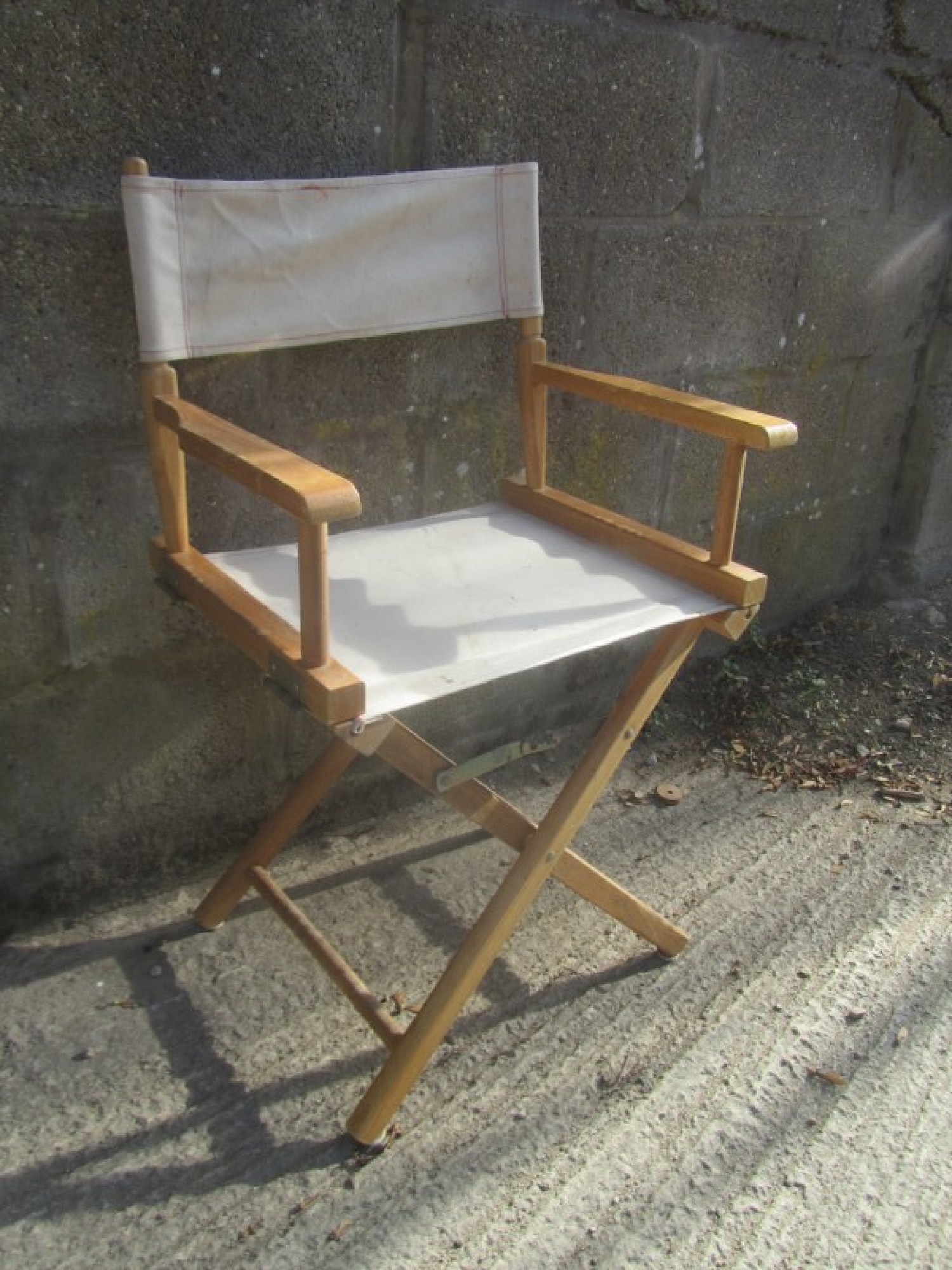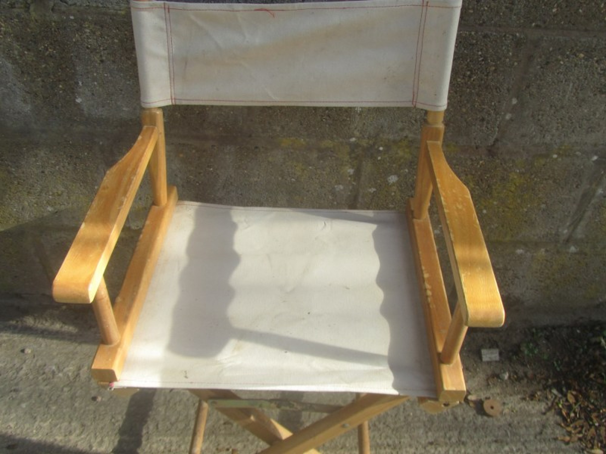 A DIRECTORS CHAIR WITH FOLD UP SOLID BEECH FRAME AND CANVAS MATERIAL. SEAT HEIGHT - 46cm.
