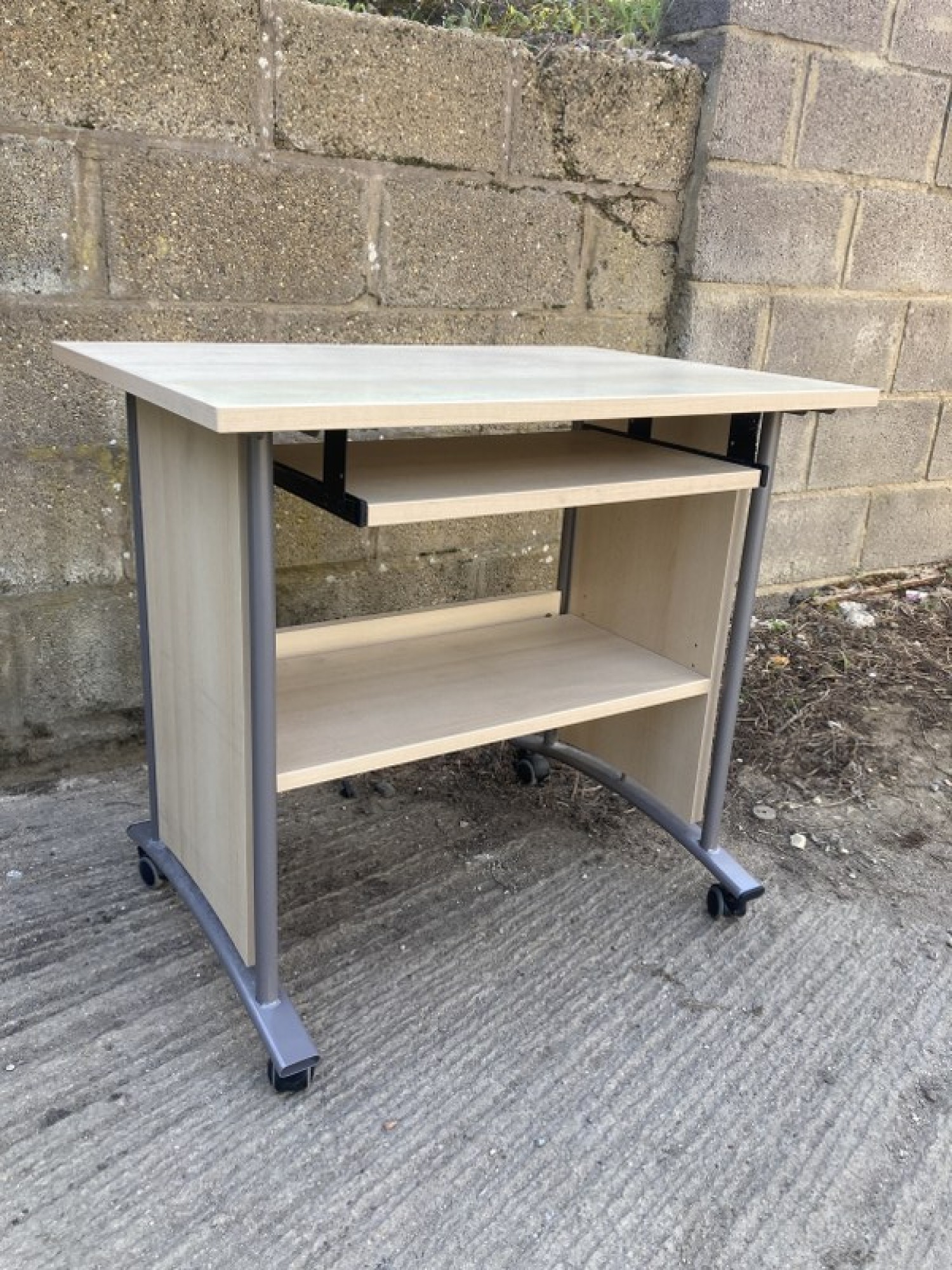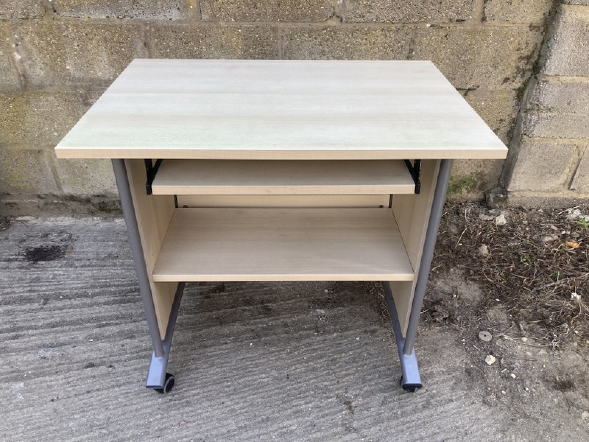 A BEECH EFFECT DESK ON A METAL FRAME. IT HAS A SLIDE OUT KEYBOARD SHELF AND STORAGE BELOW. THE TOP IS FADED.