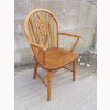 THIS IS A BEECH CARVER CHAIR FOR THE KITCHEN OR DINING ROOM. IN A TRADITIONAL FARMHOUSE STYLE WITH A WHEEL BACK. SEAT HEIGHT IS 47cm. IN GOOD CONDITION, SOME WEAR.