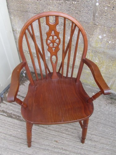 THIS IS A BEECH CARVER CHAIR FOR THE KITCHEN OR DINING ROOM. IN A TRADITIONAL FARMHOUSE STYLE WITH A WHEEL BACK. SEAT HEIGHT IS 47cm. IN GOOD CONDITION, SOME WEAR.