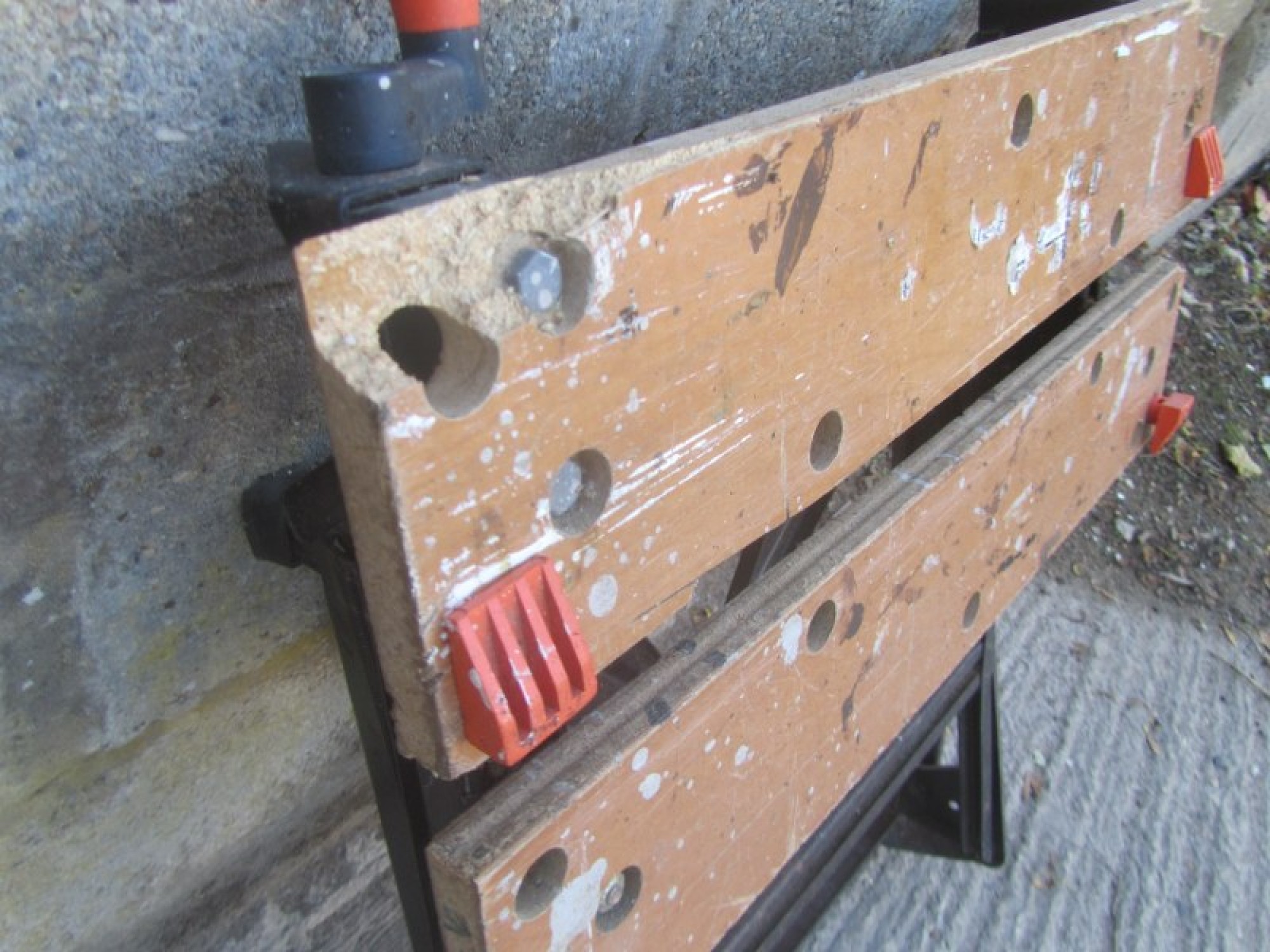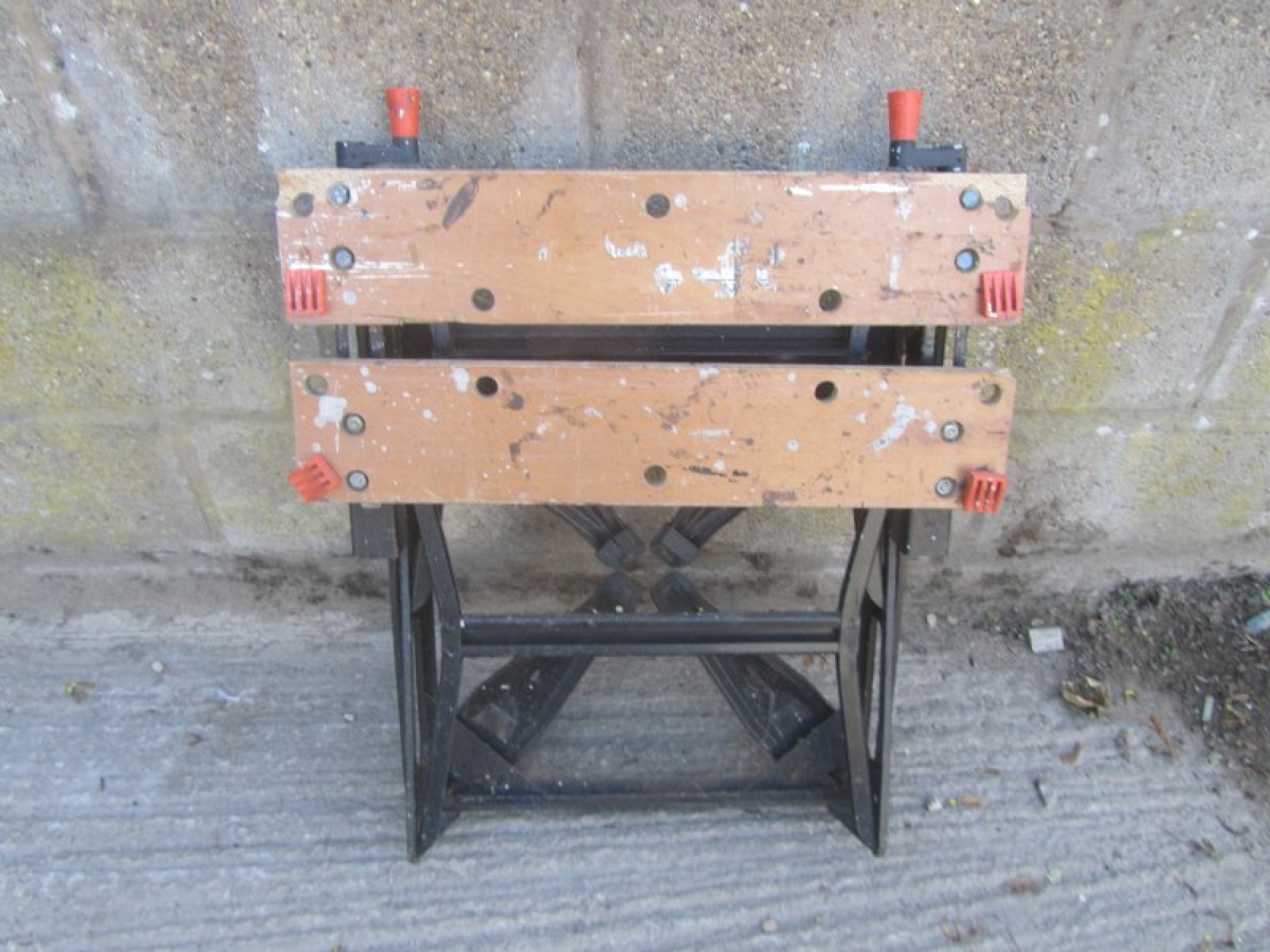 A STRONG AND STURDY WORK BENCH ON A METAL FRAME WITH ADJUSTABLE TOP. IT FOLDS FLAT FOR STORAGE. SOME WEAR AND TEAR FROM USE. OLD AND RUSTY.