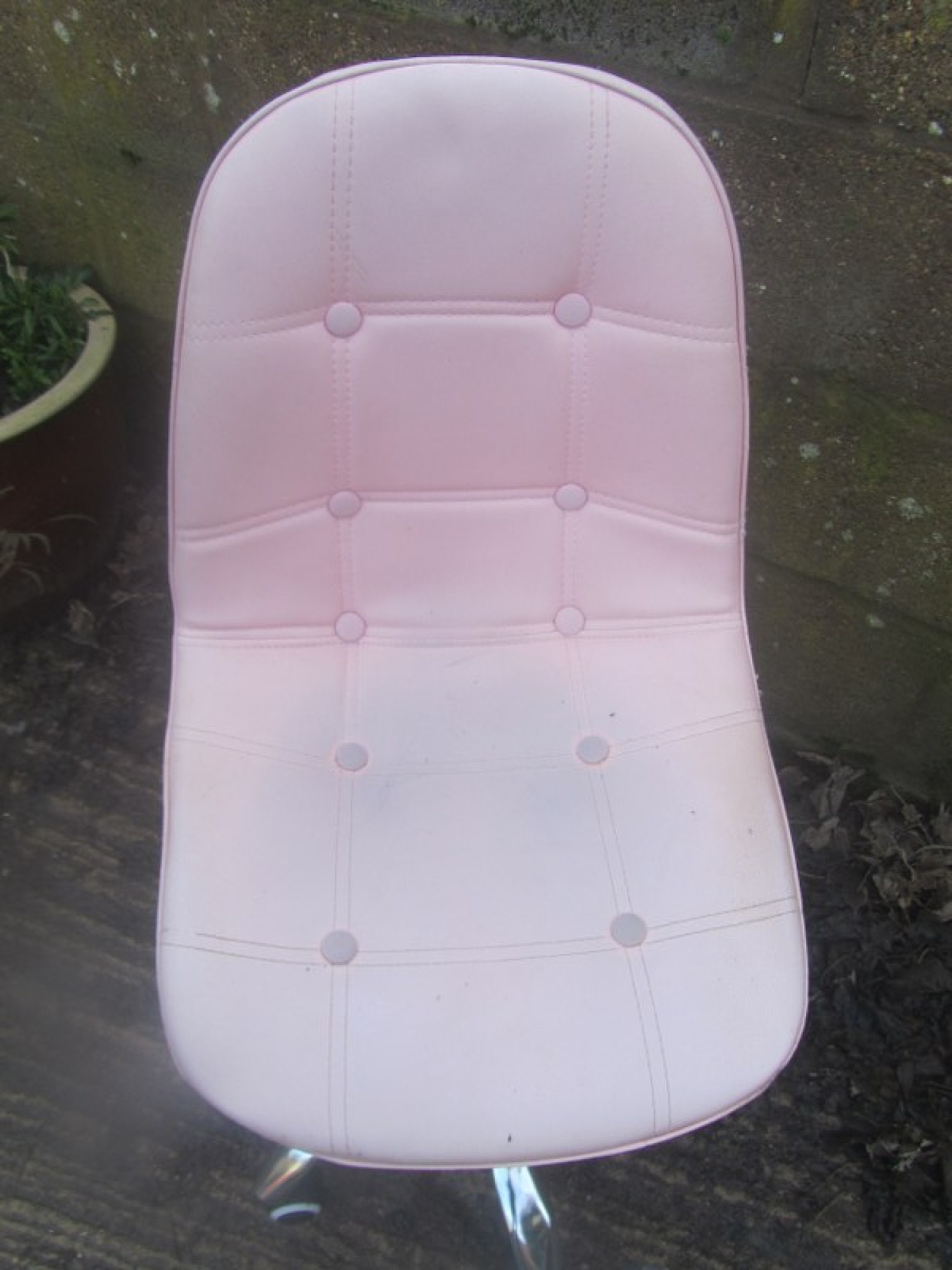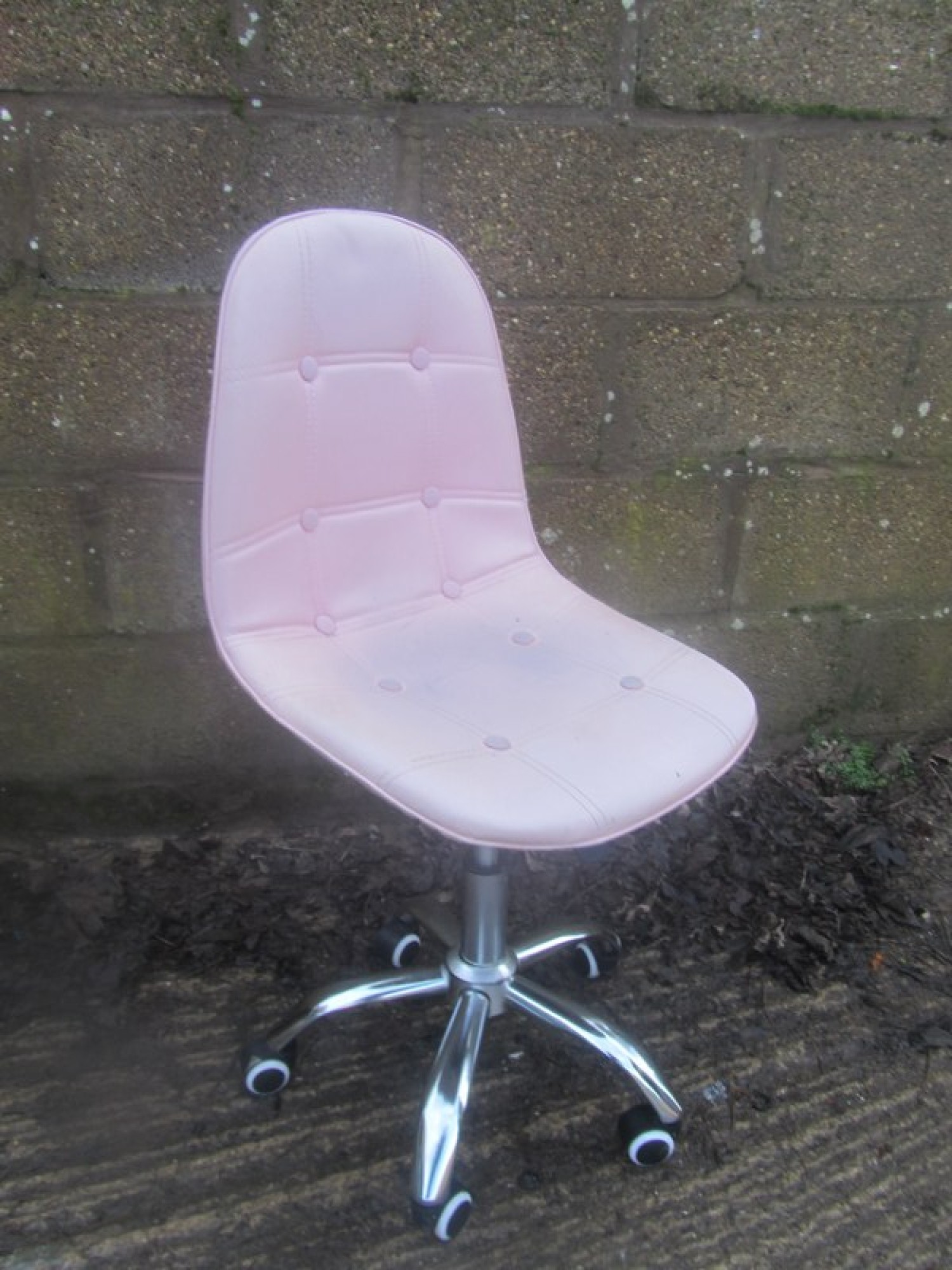 A MODERN OFFICE SWIVEL CHAIR, IT STANDS ON 5 CASTORS. IT IS UPHOLSTERED IN WORN PINK LEATHER EFFECT MATERIAL. THERE IS GAS LIFT HEIGHT ADJUSTMENT. THE COVERING HAS WEAR AND MARKS, FADED AND WORN. STAINED FROM THE DYE IN BLUE DENIM. IT IS SCUFFED ON THE BACK REST. SEAT HEIGHT IS 35 - 48 cm.