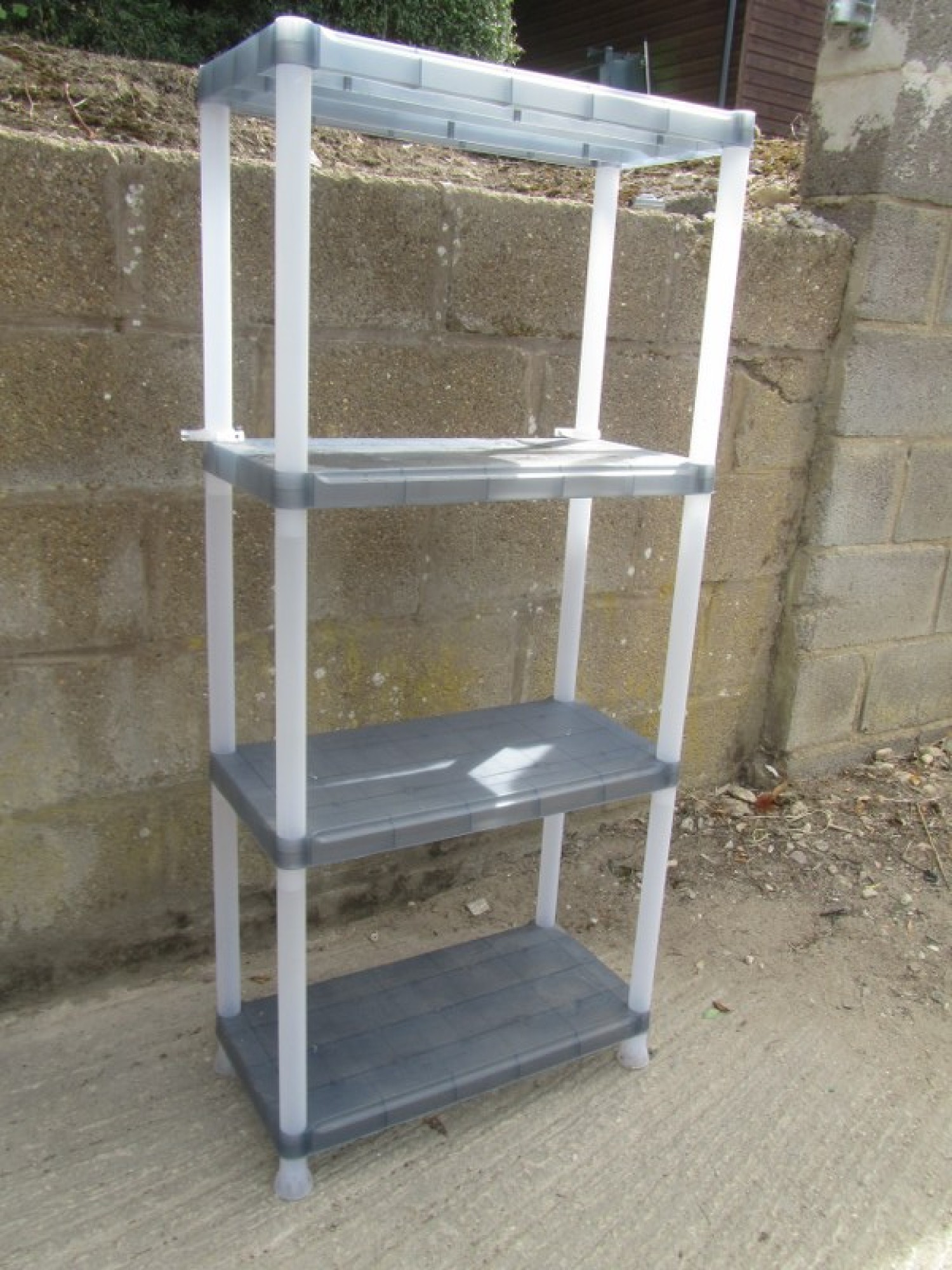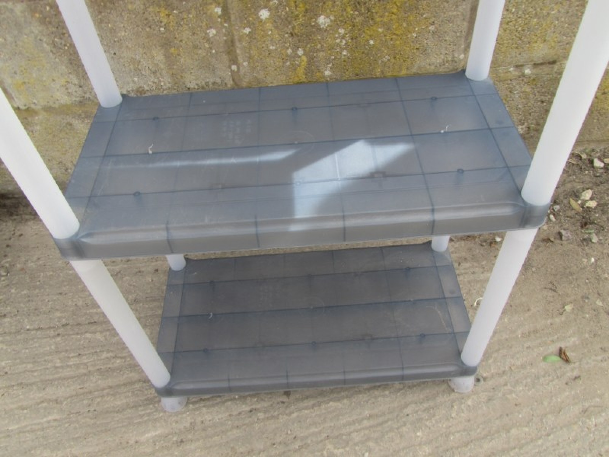 A LIGHTWEIGHT SET OF SHELVES IN PLASTIC, SOME WEAR AND MARKS. IDEAL STORAGE.
