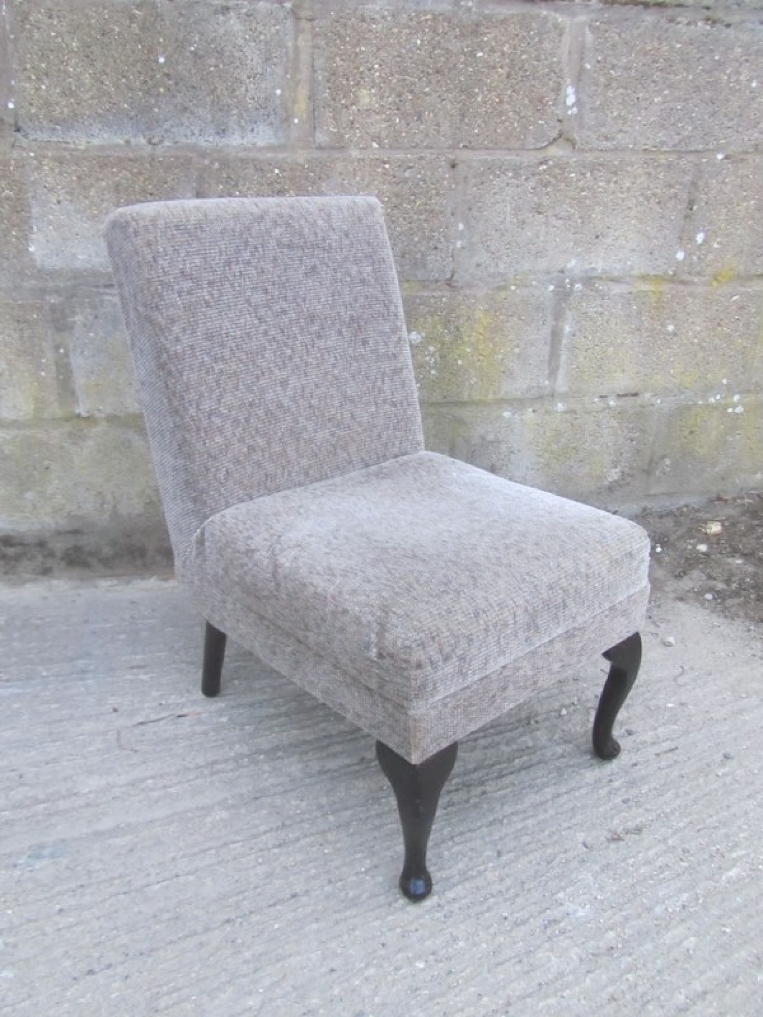 THIS IS A LOW BEDROOM CHAIR. A STURDY SIMPLE CHAIR. MATERIAL SEAT. A GREAT PIECE FOR ANYWHERE IN THE HOME. IN GOOD CONDITION, SOME LIGHT MARKS.