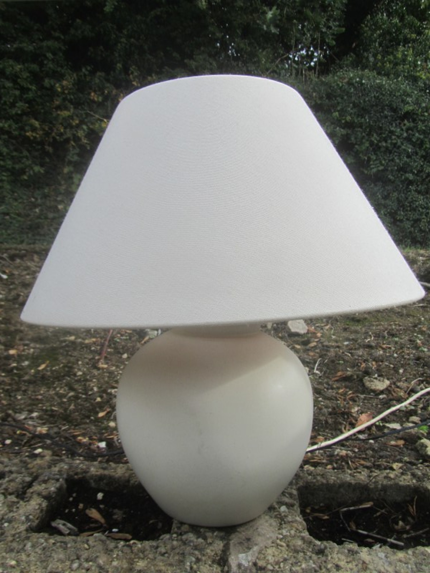 A POT TABLE LAMP IN A CREAM COLOUR.