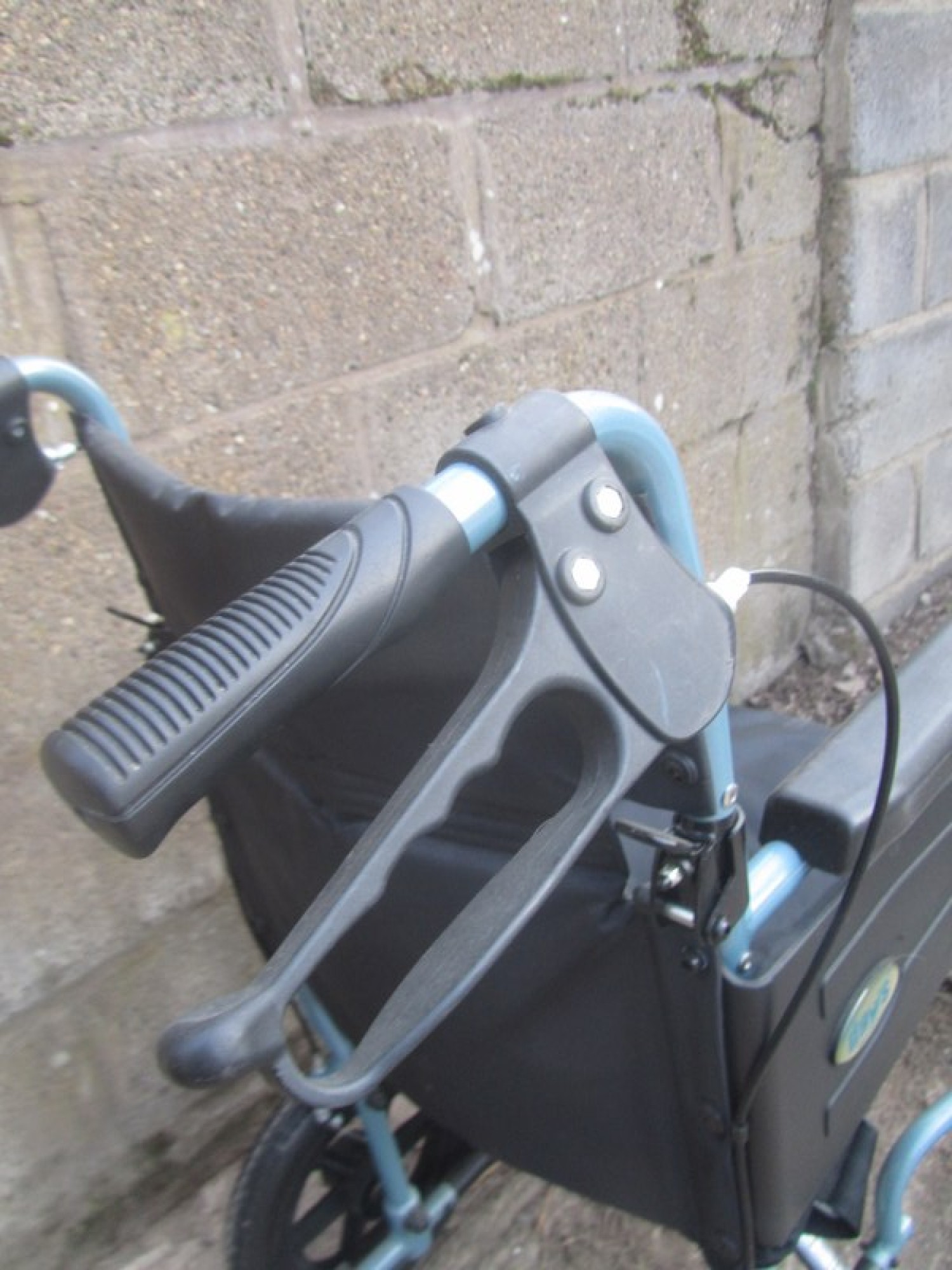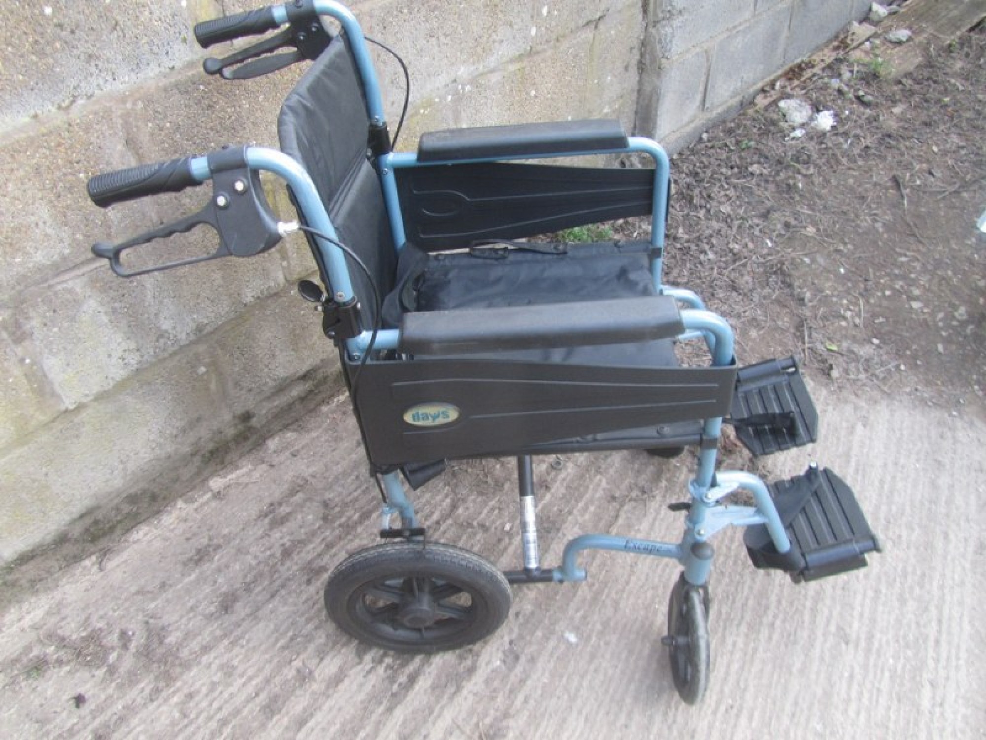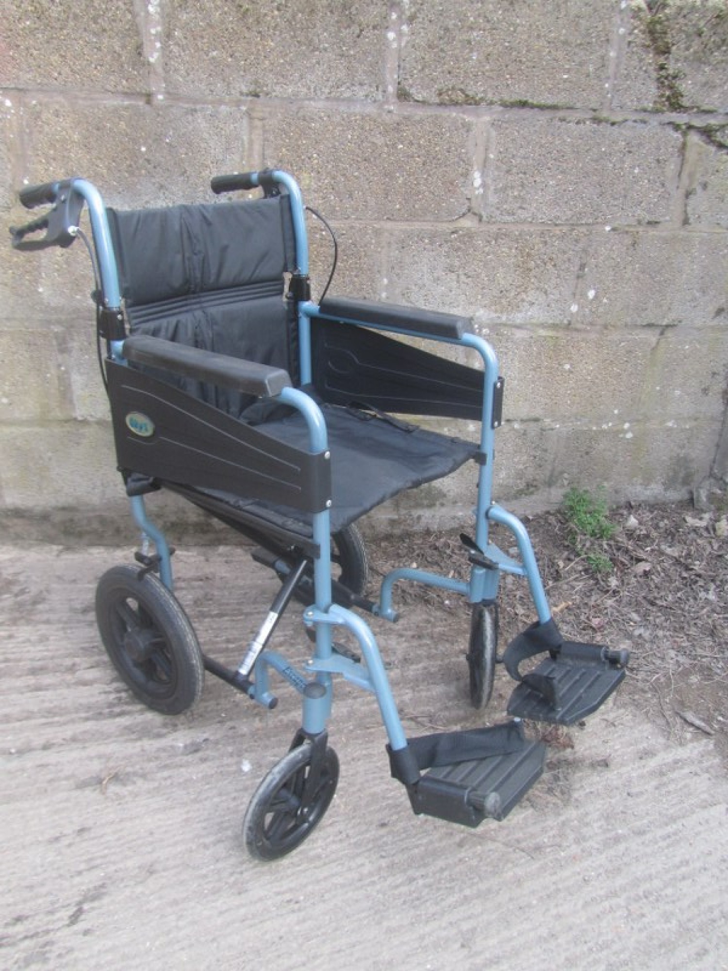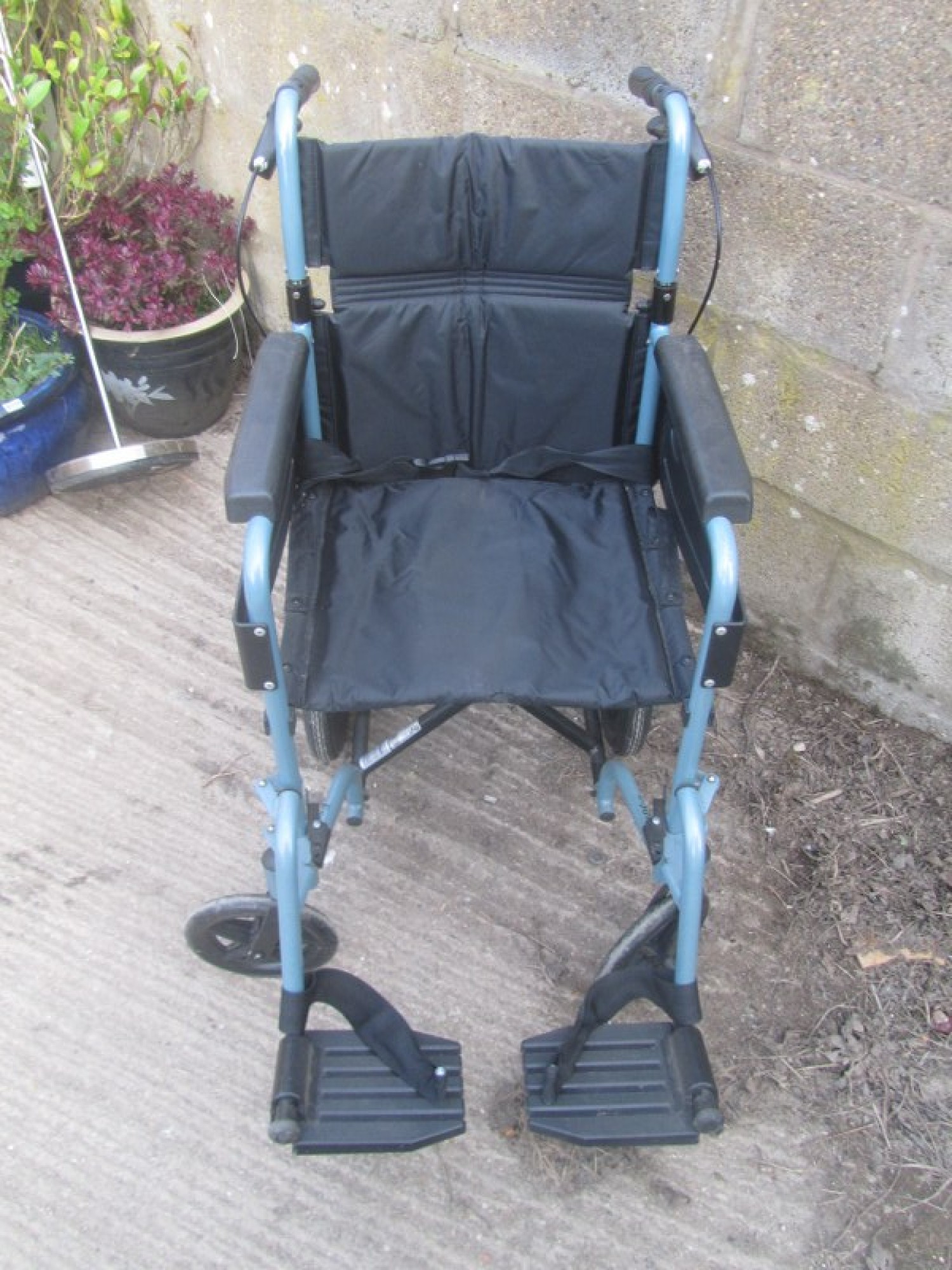 A MODERN COLLAPSABLE WHEEL CHAIR WITH FOOT RESTS. IN GOOD CONDITION. EASILY FOLDS FLAT TO FIT IN A CAR. SOME WEAR. THE FOOT SUPPORTS WILL LIFT OFF.