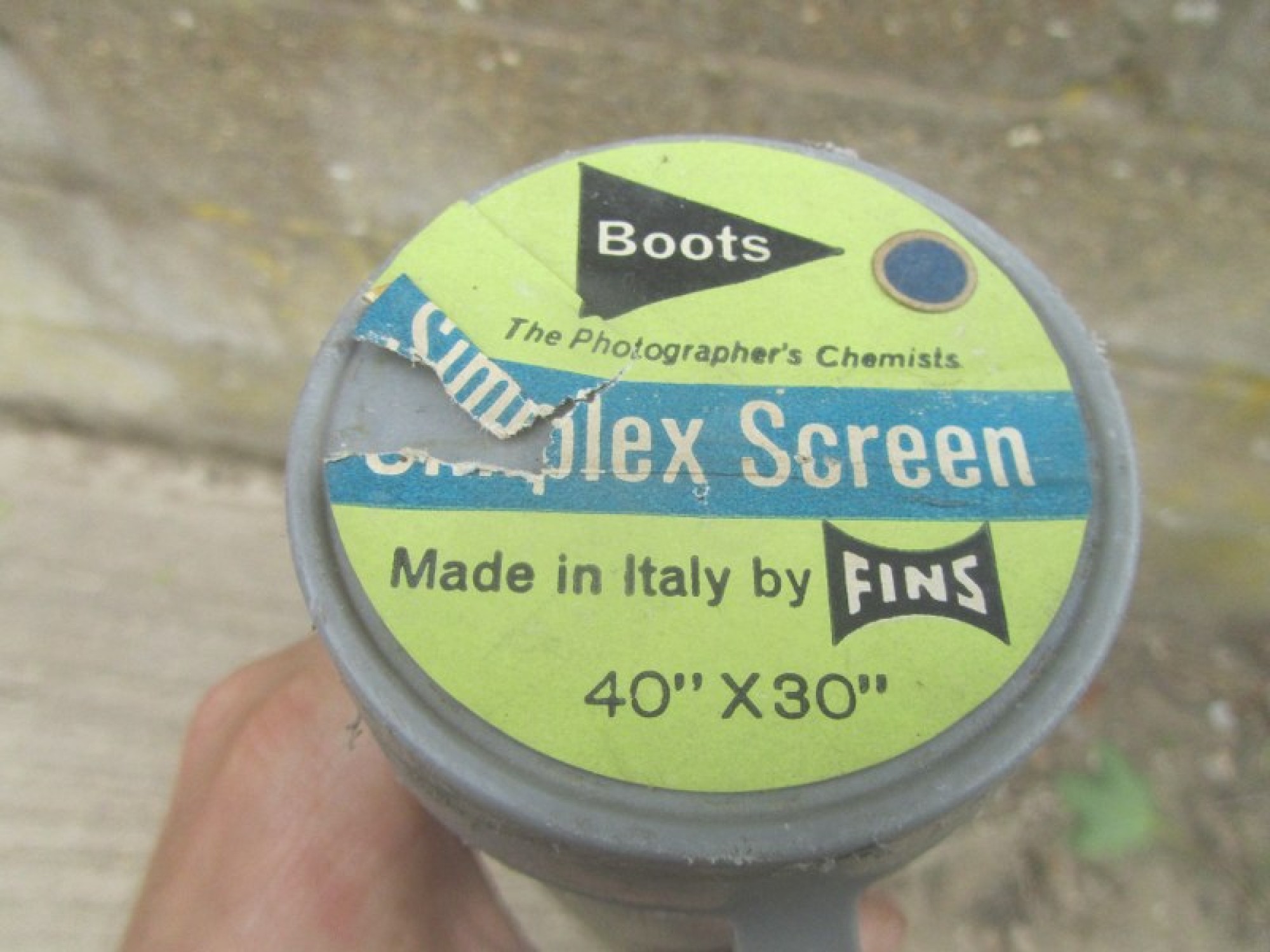 A VINTAGE PROJECTOR SCREEN, ORIGINALLY FOR SLIDE PROJECTORS, BUT CAN ALSO BE USED FOR POWERPOINT PRESENTATIONS. IT HAS A COATED MATERIAL SCREEN. THE SCREEN ROLLS UP WHEN NOT IN USE. NO STAND.