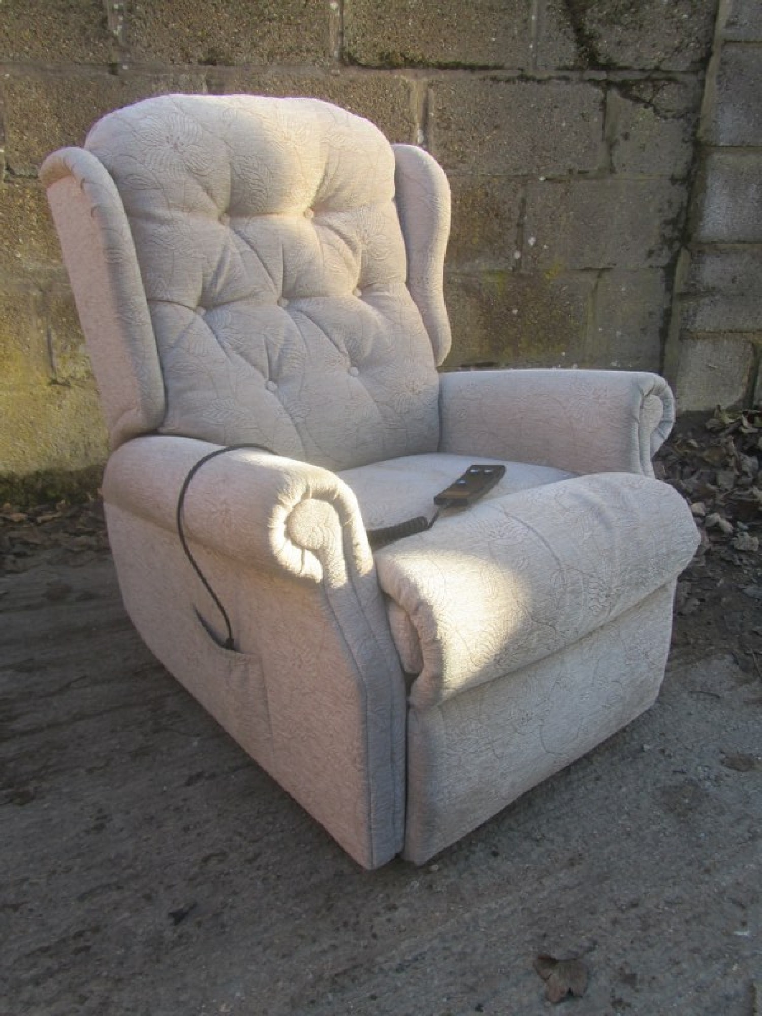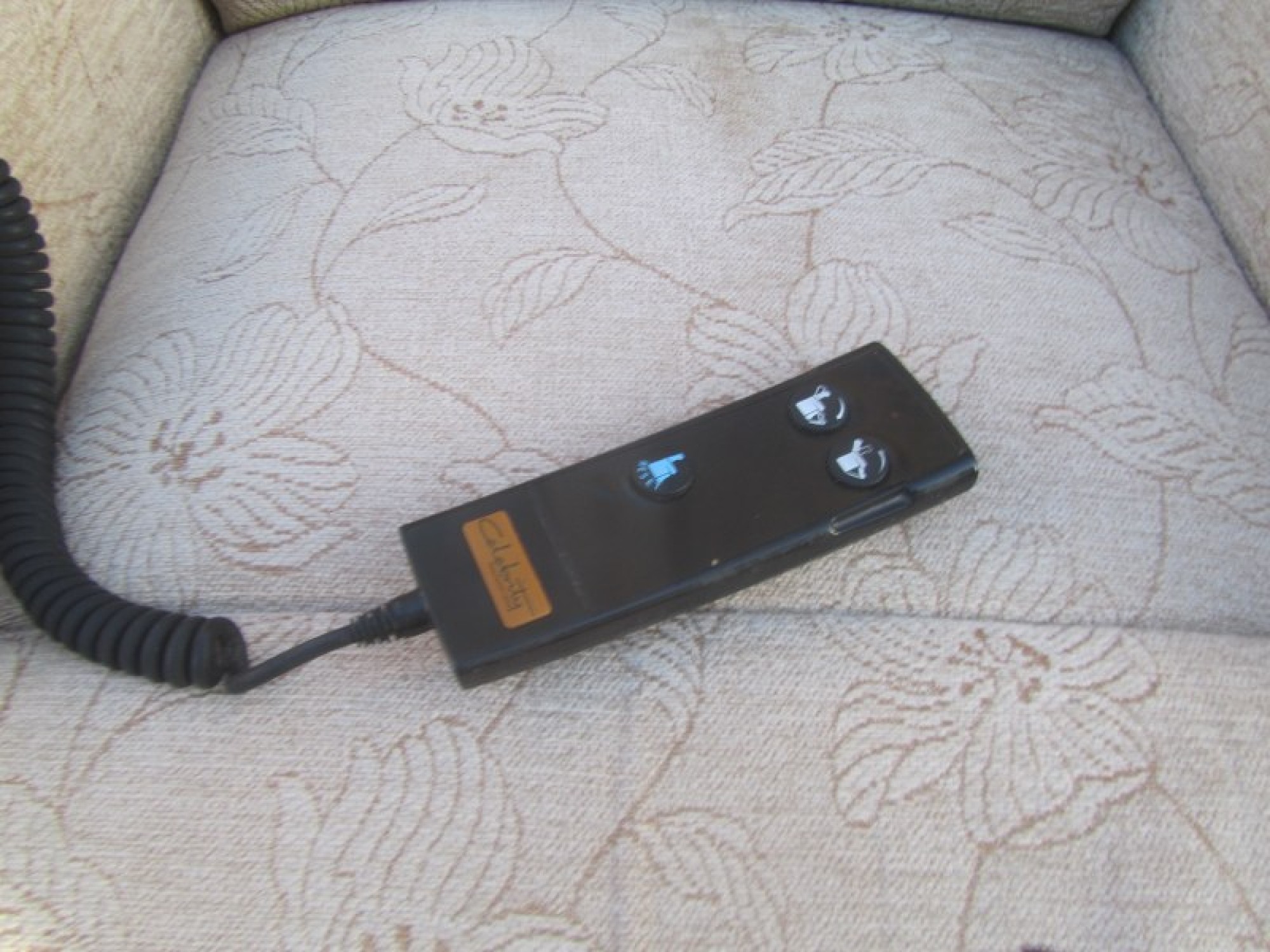 THE ARMCHAIR HAS A HAND HELD CONTROL. THE BACK REST WILL RECLINE, AND THE FOOT REST LIFTS UP INTO A RELAXING RECLINED POSITION. THE MECHANISM ALL WORKS WELL. IT COMES WITH POWER LEAD & CONTROLLER. FROM A SMOKE & PET FREE HOME. SEAT HEIGHT IS 47cm.
