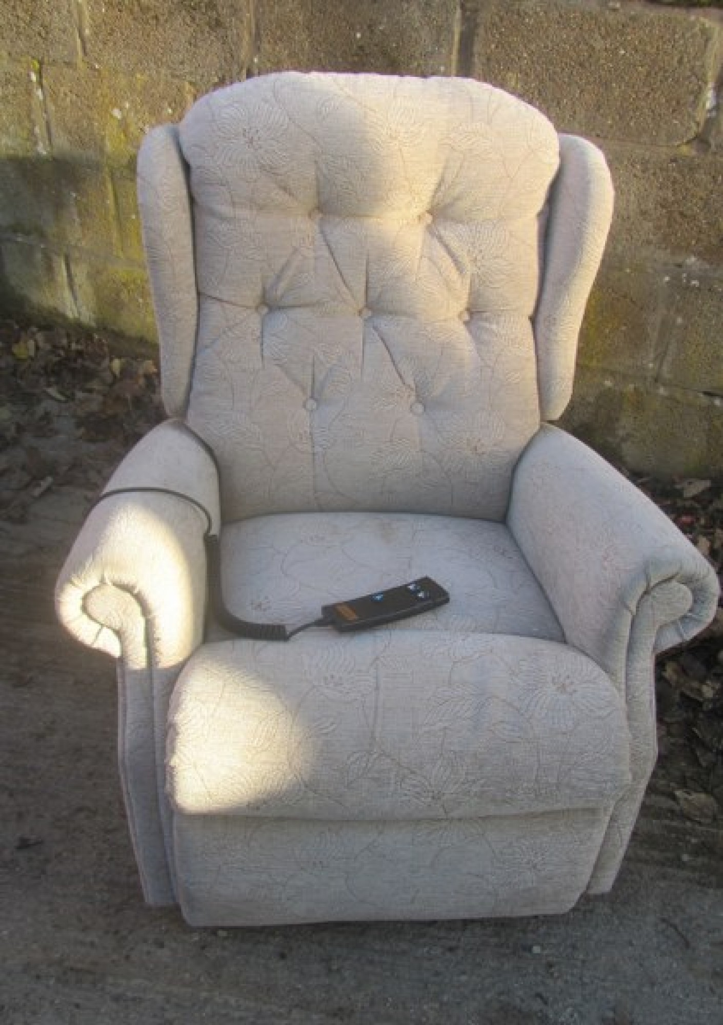 THIS IS AN ELECTRIC RECLINING ARMCHAIR. AVERAGE CONDITION. SOME LIGHT WEAR AND FADING.