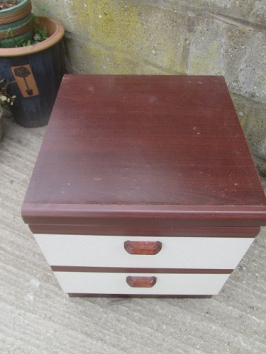A BEDSIDE CABINET IN A DARK WOOD EFFECT & CREAM FINISH. SIMPLE CONSTRUCTION.