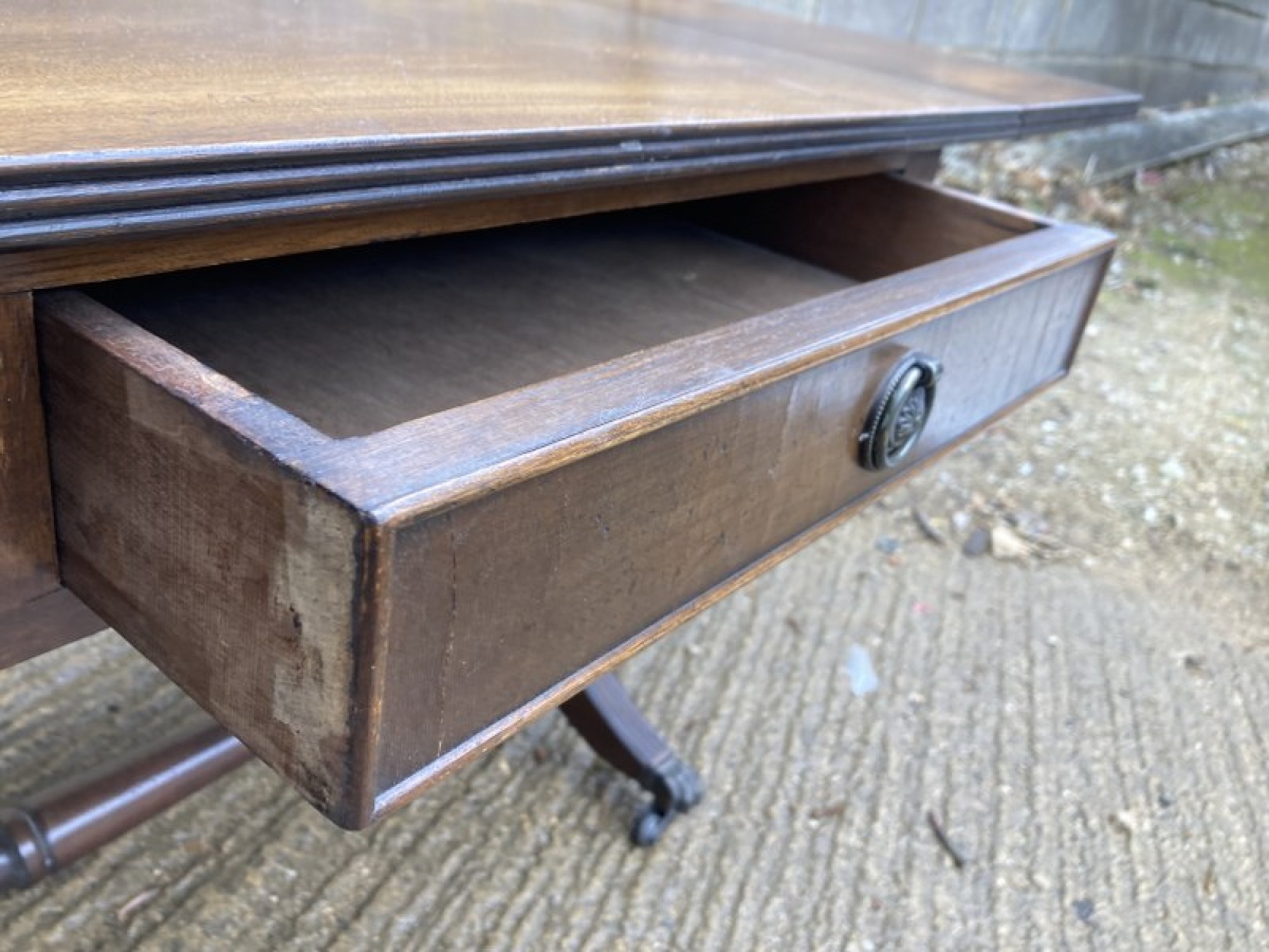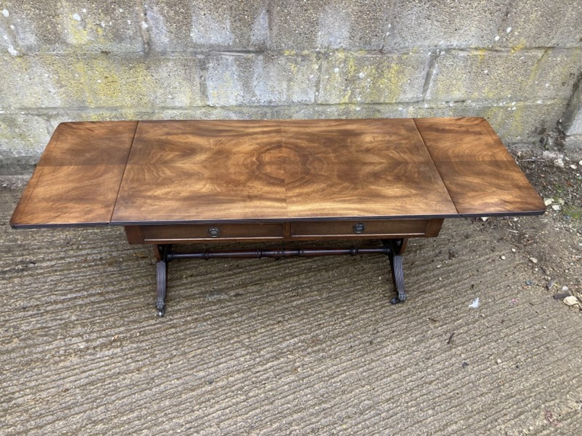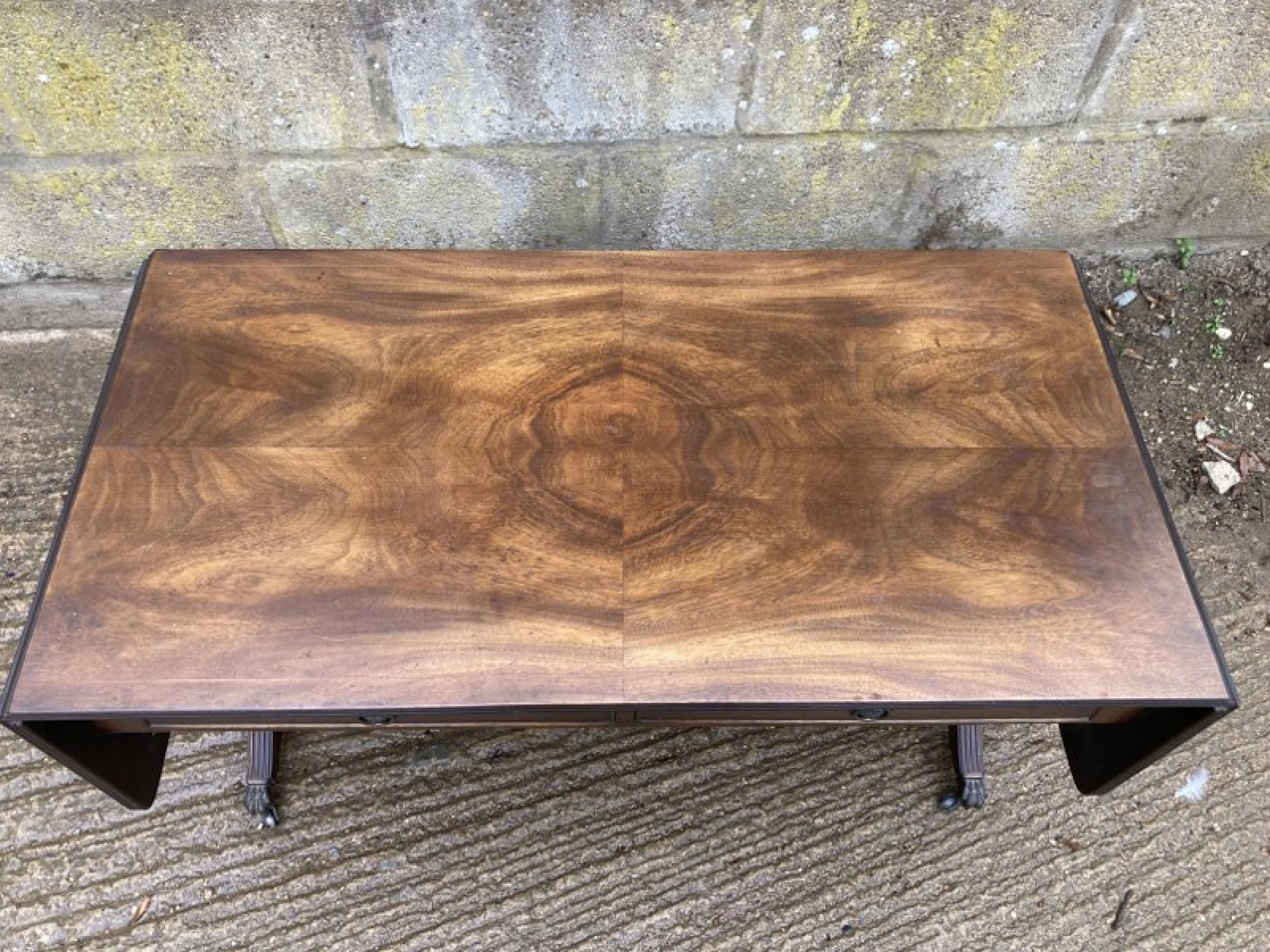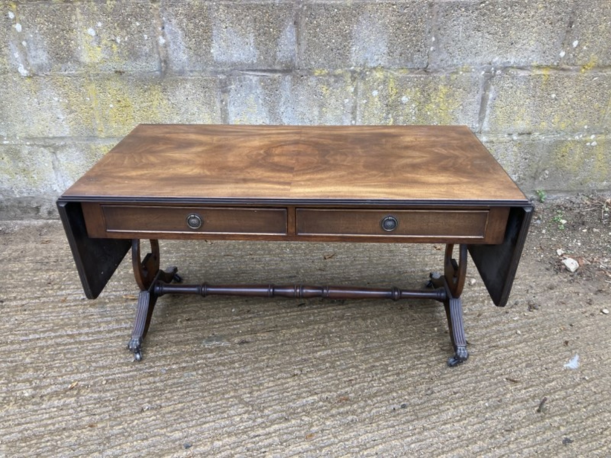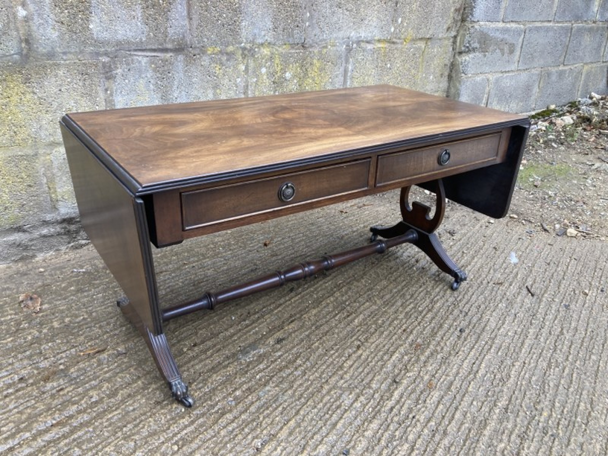 THIS IS A COFFEE TABLE IN A GEORGIAN REGENCY STYLE. IN A MAHOGANY VENEER, THE FRAME IS STRONG AND STURDY. GOOD QUALITY.