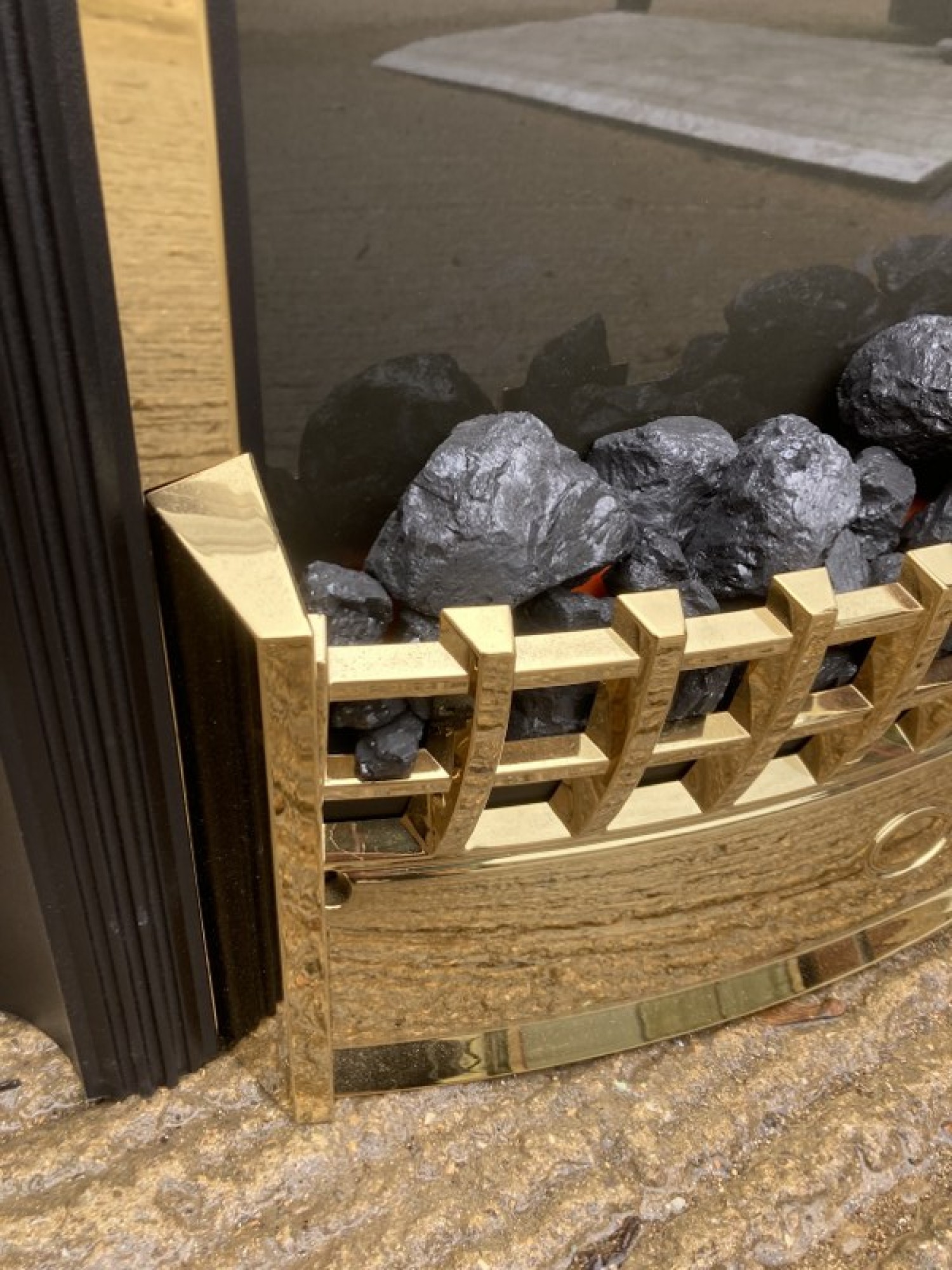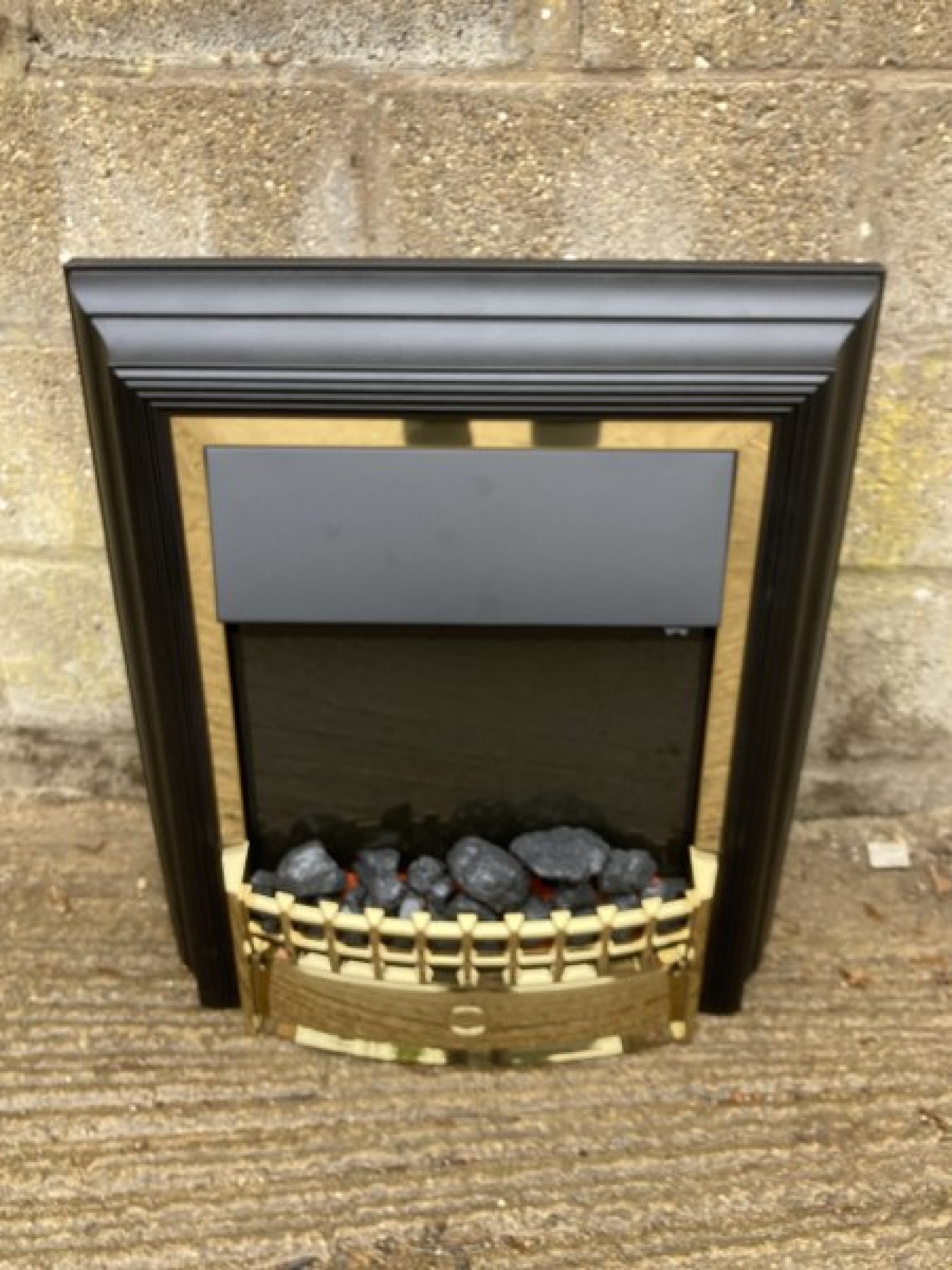 A MODERN ELECTRIC FIRE WITH A COAL EFFECT FRONT AND A FLAME EFFECT AT THE BACK. IT HAS A 2kw FAN HEATER WITH 2 HEAT SETTINGS. IT IS SET IN A BRASS SURROUND. INCLUDES COALS. A STYLISH FIRE. IT SIMPLY SITS IN FRONT OF A FIREPLACE.