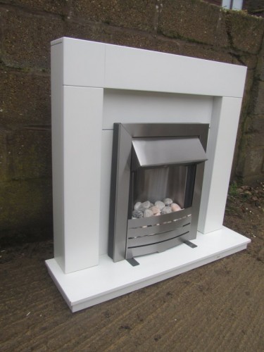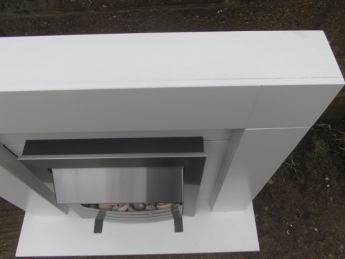 A MODERN ELECTRIC HEATER WITH A FLAME EFFECT FIRE. IT HAS A FAN HEATER. IT IS SET IN A WHITE SURROUND. A STYLISH MODERN FIRE PLACE AND ELECTRIC FIRE. GOOD CONDITION.