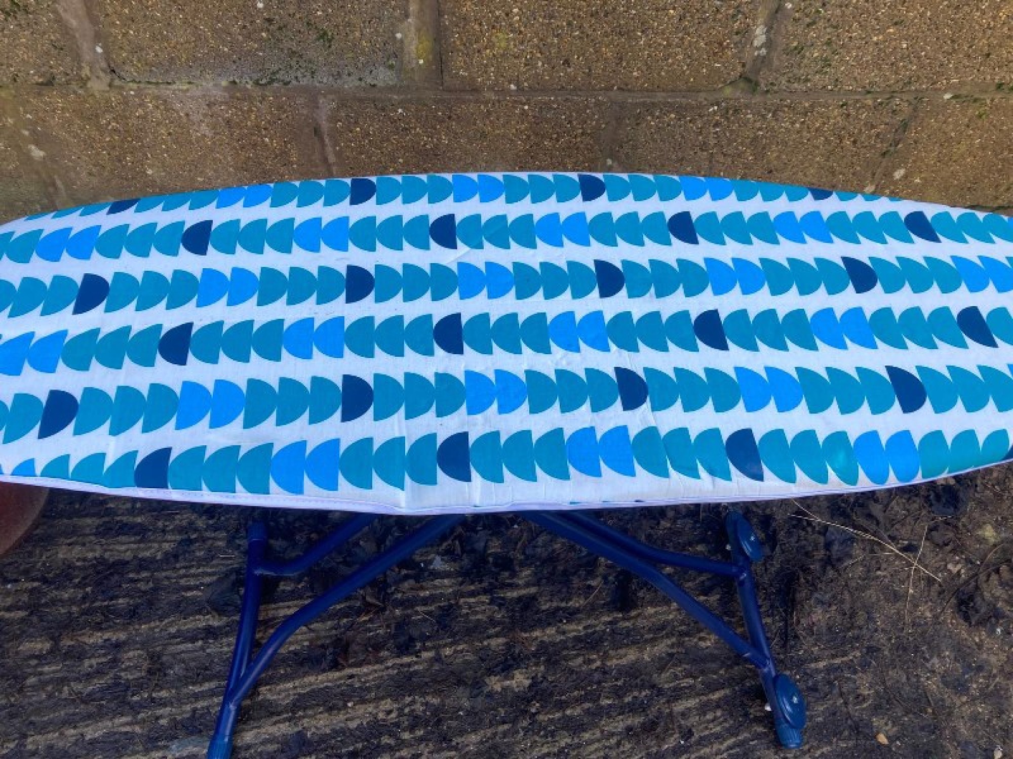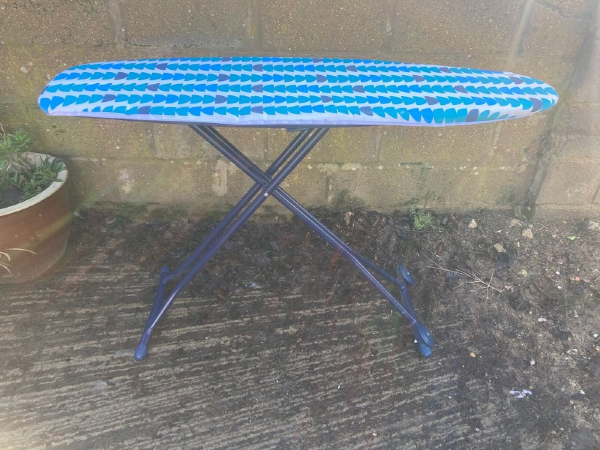 A SIMPLE IRONING BOARD, IT FOLDS FLAT WHEN NOT IN USE. WHEN UP THE HEIGHT IS ADJUSTABLE. COMES COMPLETE WITH A COVER. SMALL TEAR TO THE COVER.