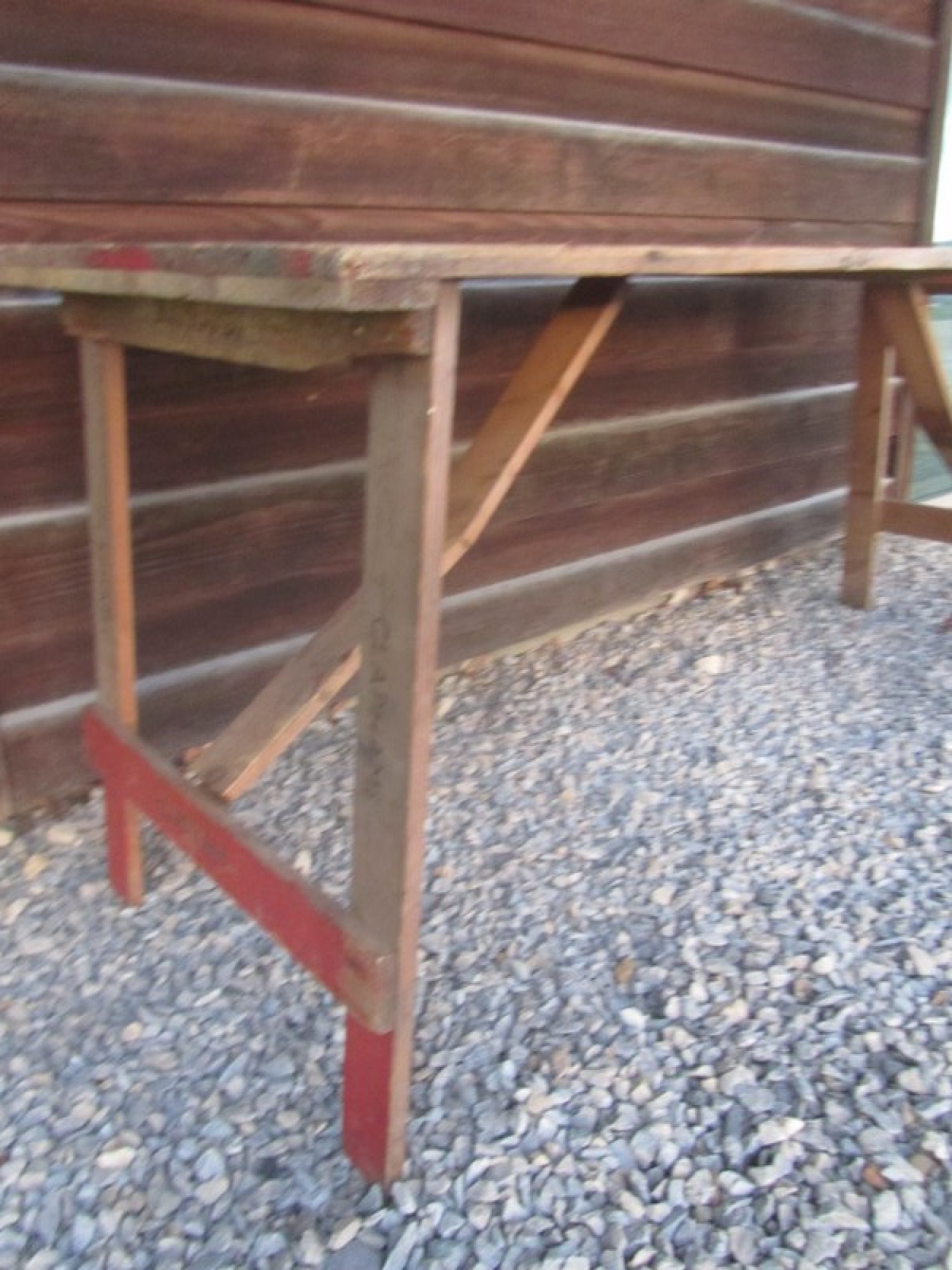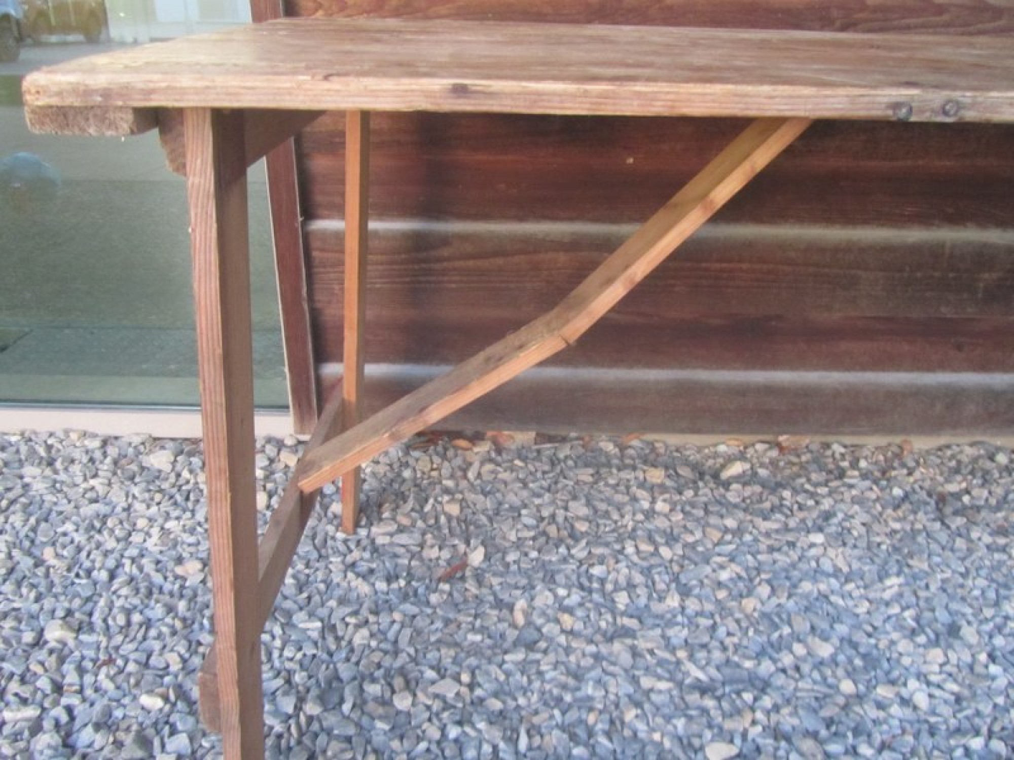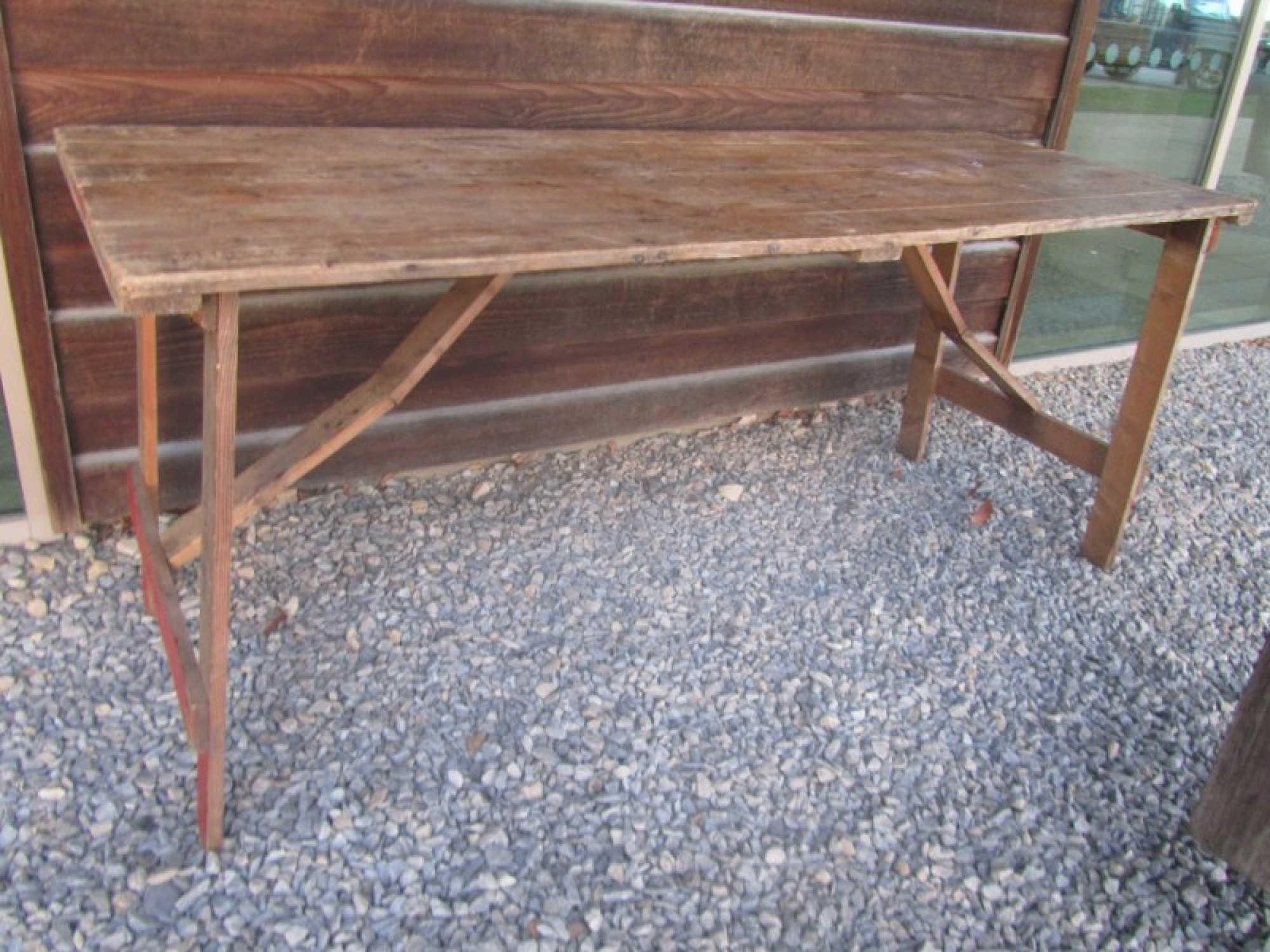 A SOLID PINE FOLD UP TABLE. IT HAS BEEN STORED IN AN OUTBUILDING, GENERAL WEAR AND TEAR. IT HAS THE ORIGINAL OWNERS NAME STAMPED/IMPRESSED IN TO THE WOOD.