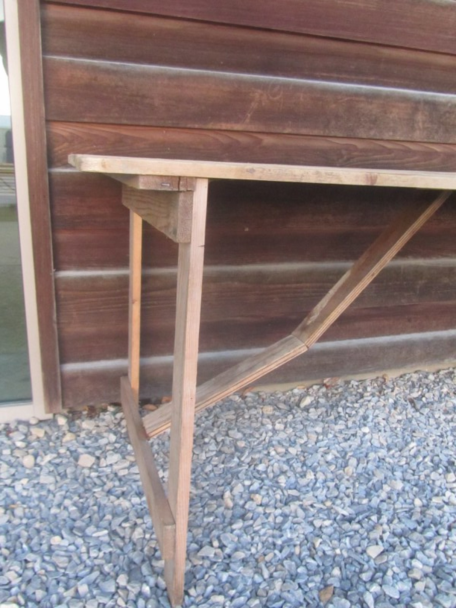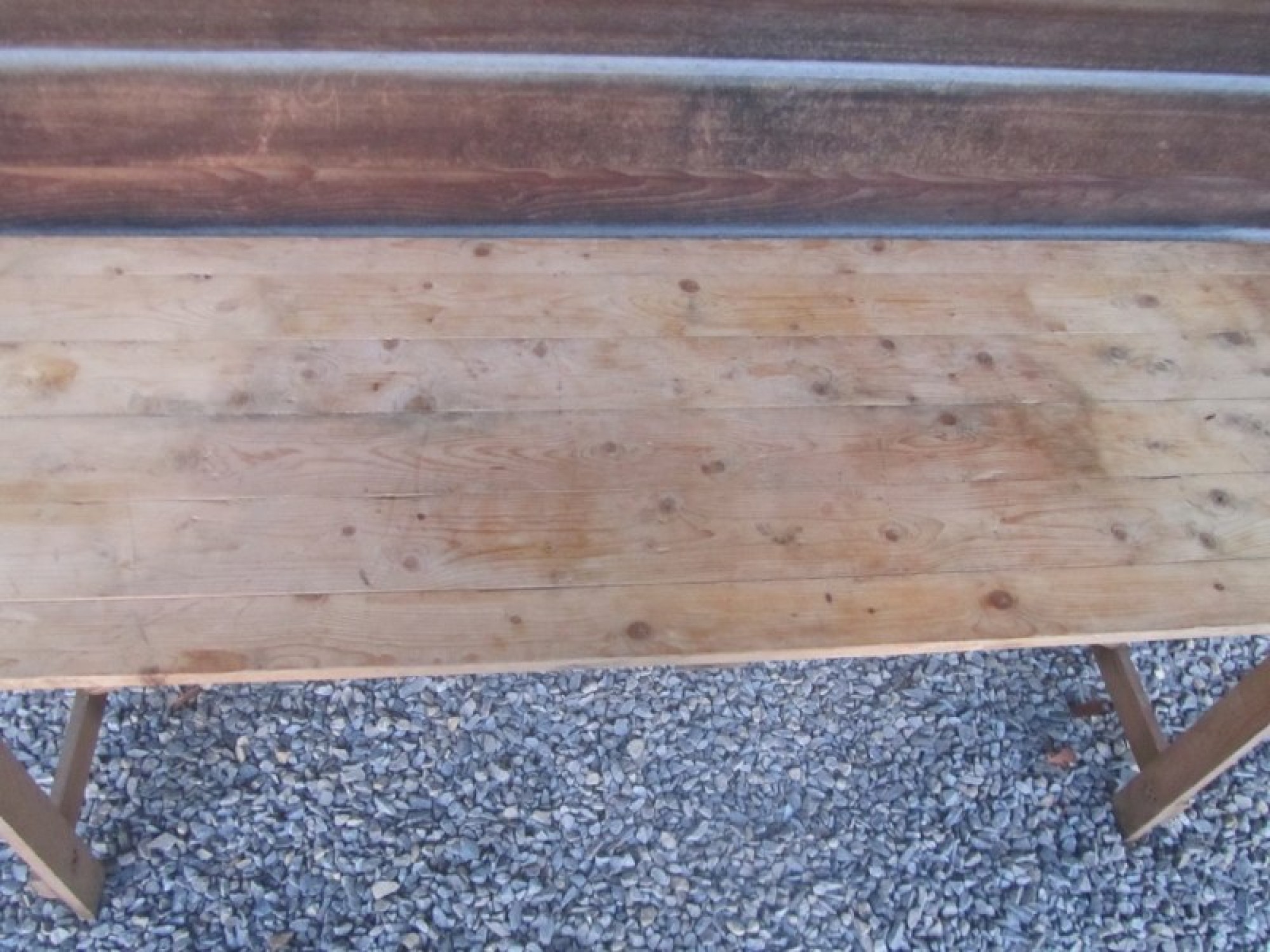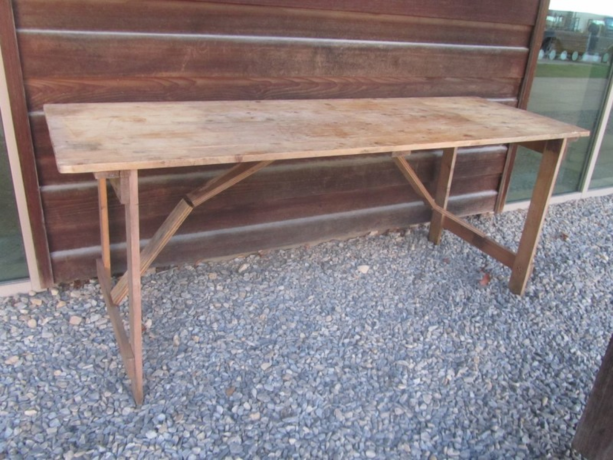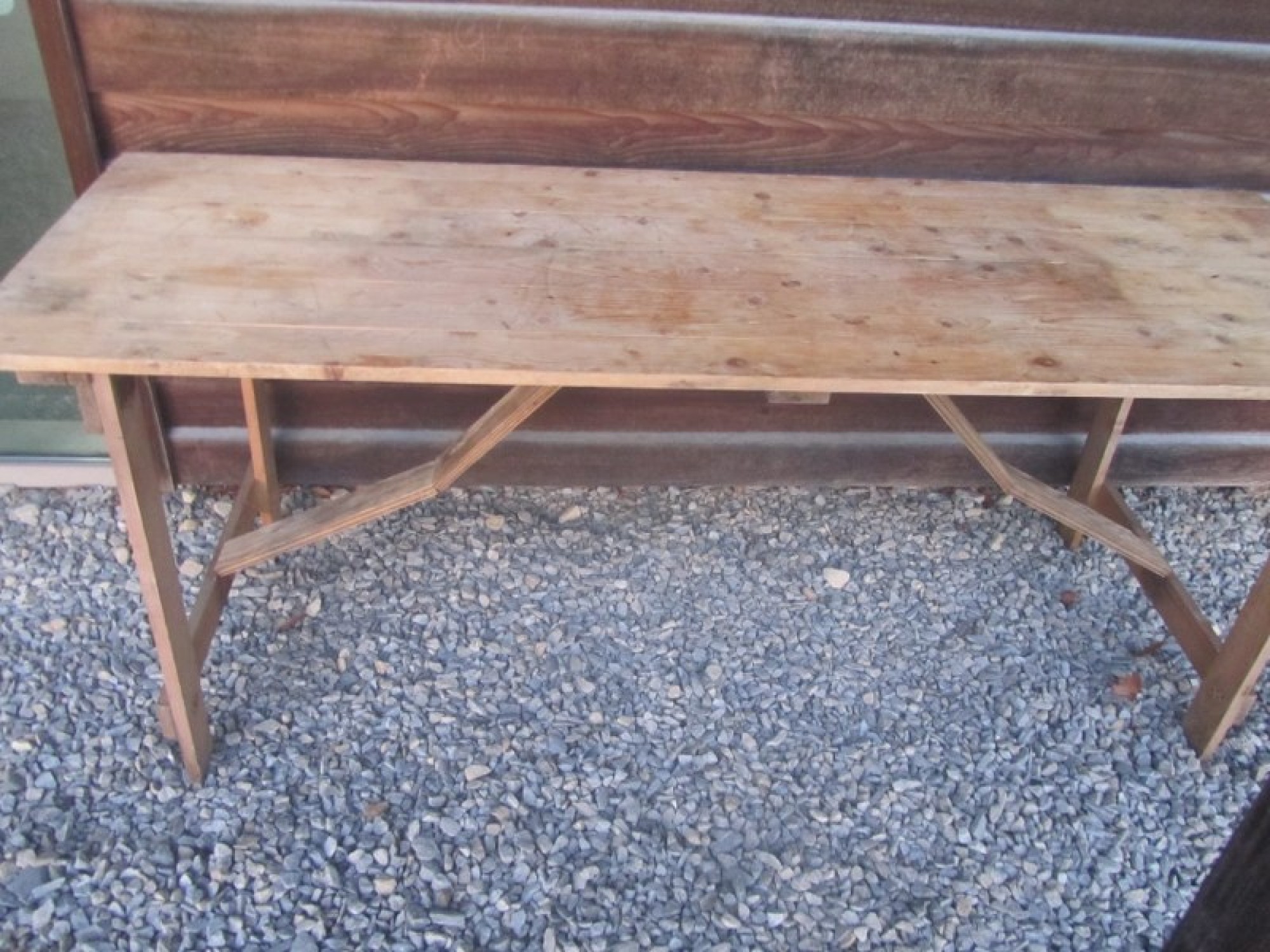 A SOLID PINE FOLD UP TABLE. IT HAS BEEN STORED IN AN OUTBUILDING, GENERAL WEAR AND TEAR.