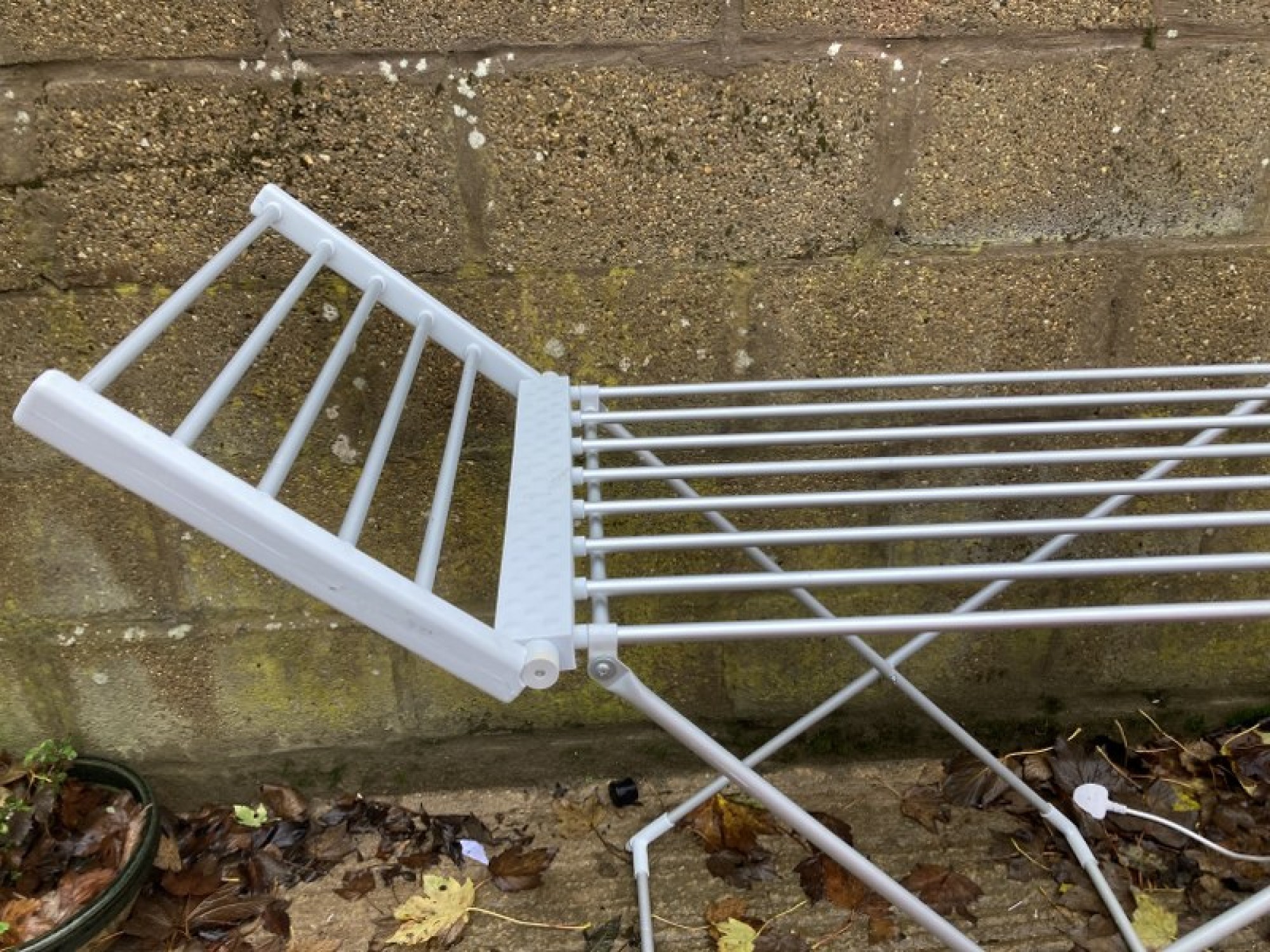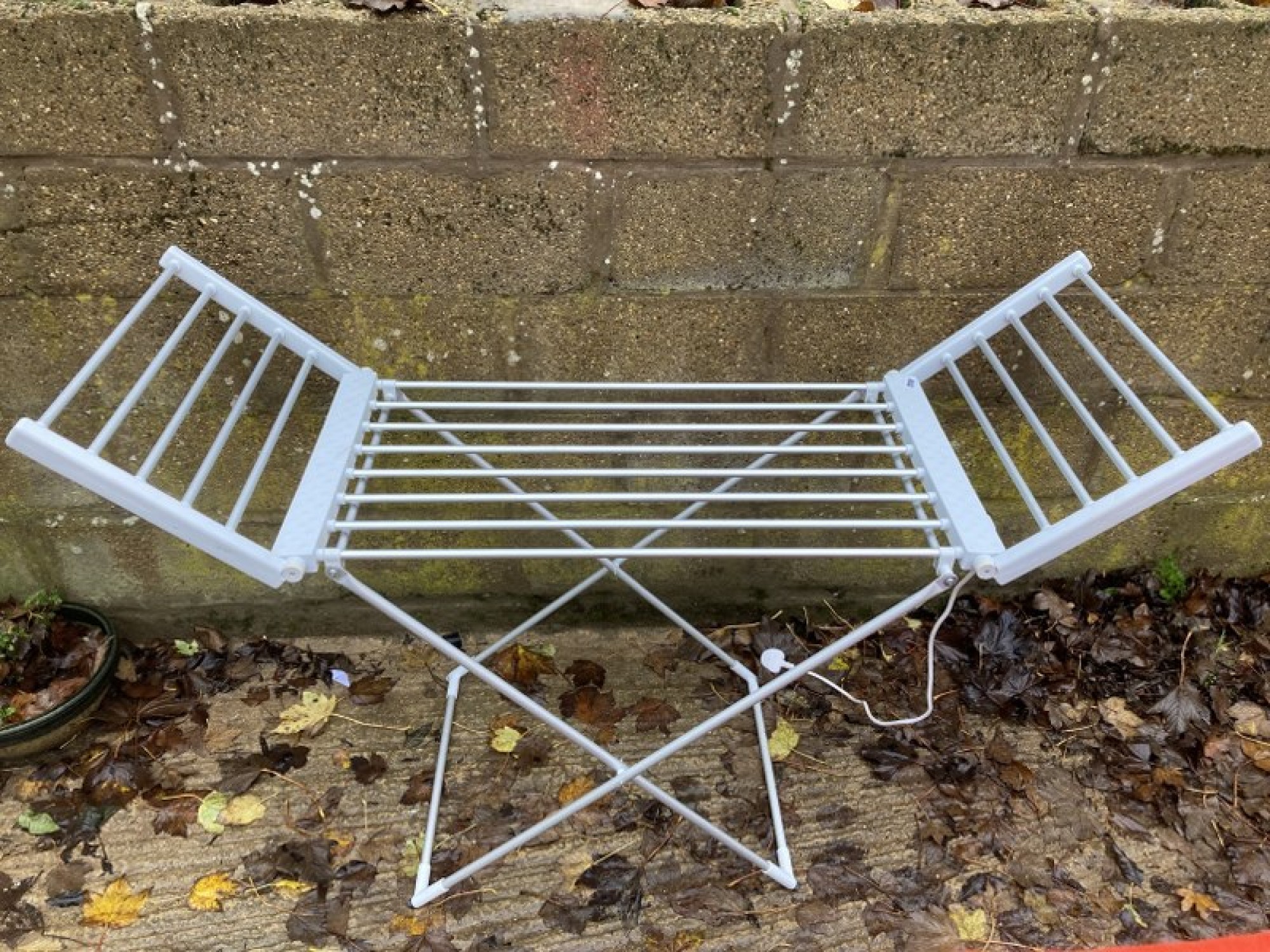 A FREE STANDING HEATED TOWEL RAIL / AIRER IN A SILVER FINISH. IT FOLDS FLAT FOR STORAGE.