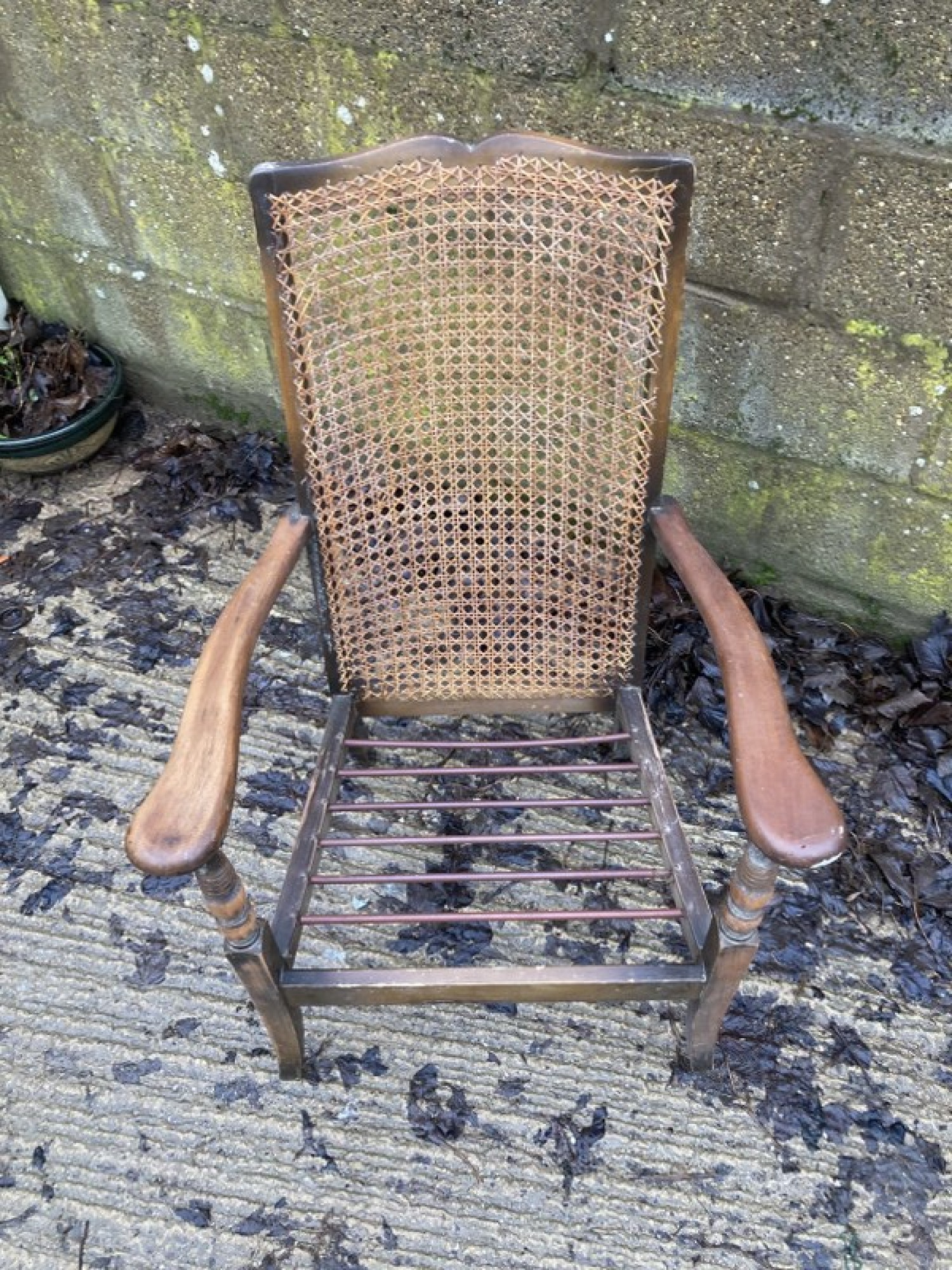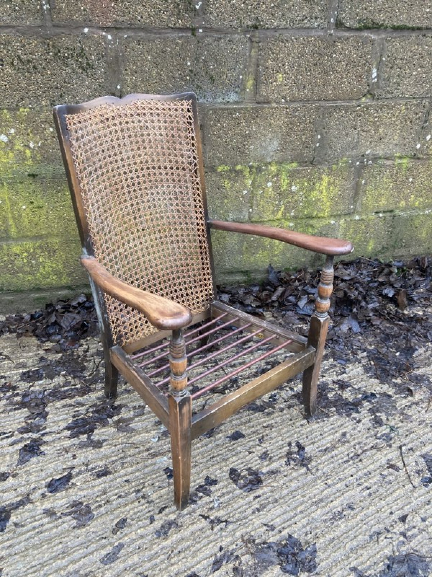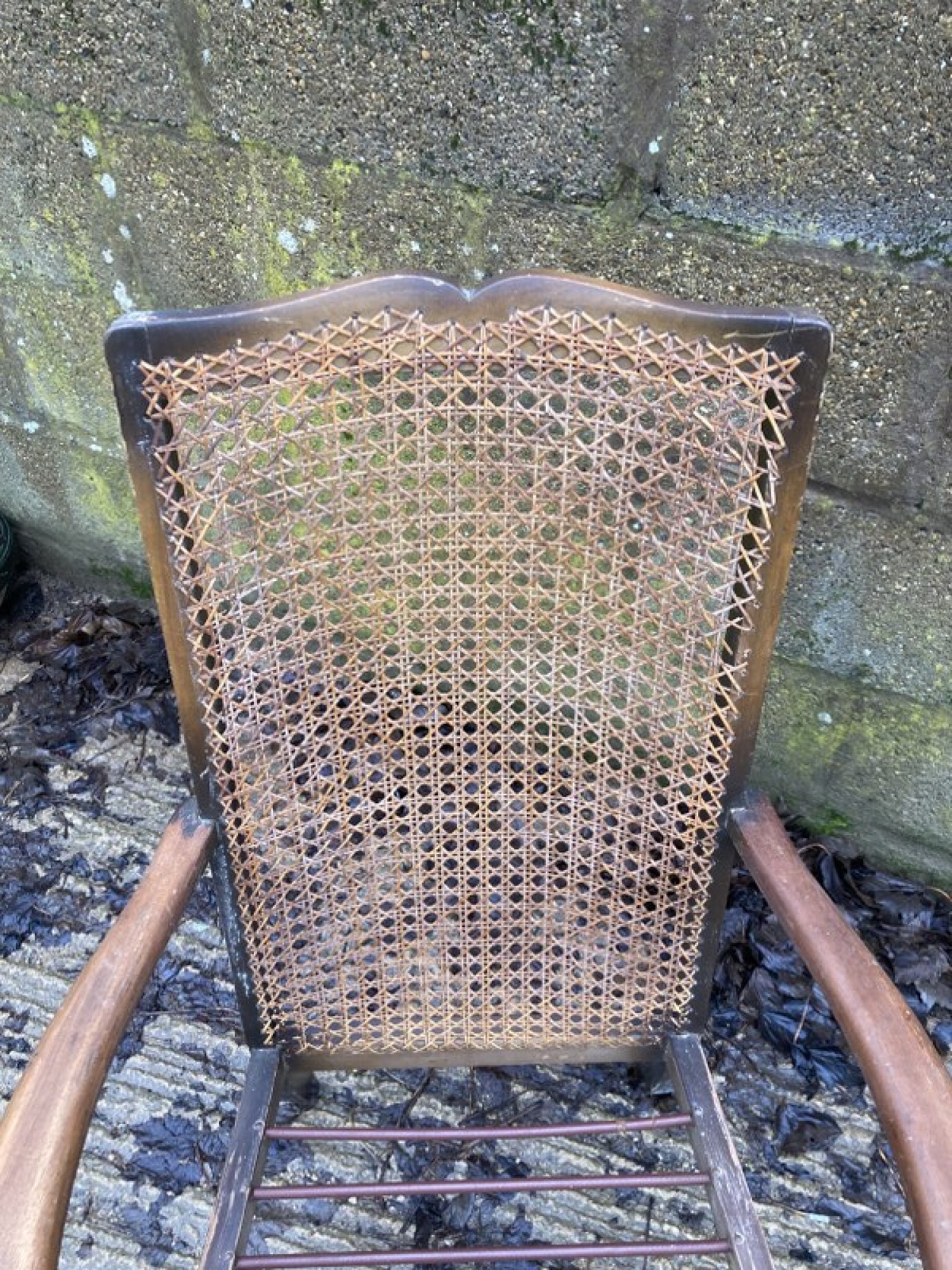 THIS IS A VINTAGE BERGERE CHAIR FROM THE 1940s/50s IN A FRENCH STYLE. THE FRAME IS STURDY, MADE FROM STAINED BEECH WOOD OR SIMILAR. THE BACK REST IS WOVEN CANE, THE CANE IS IN AVERAGE CONDITION, SOME DAMAGE ON THE ONE SIDE. SEAT HEIGHT IS 30cm.