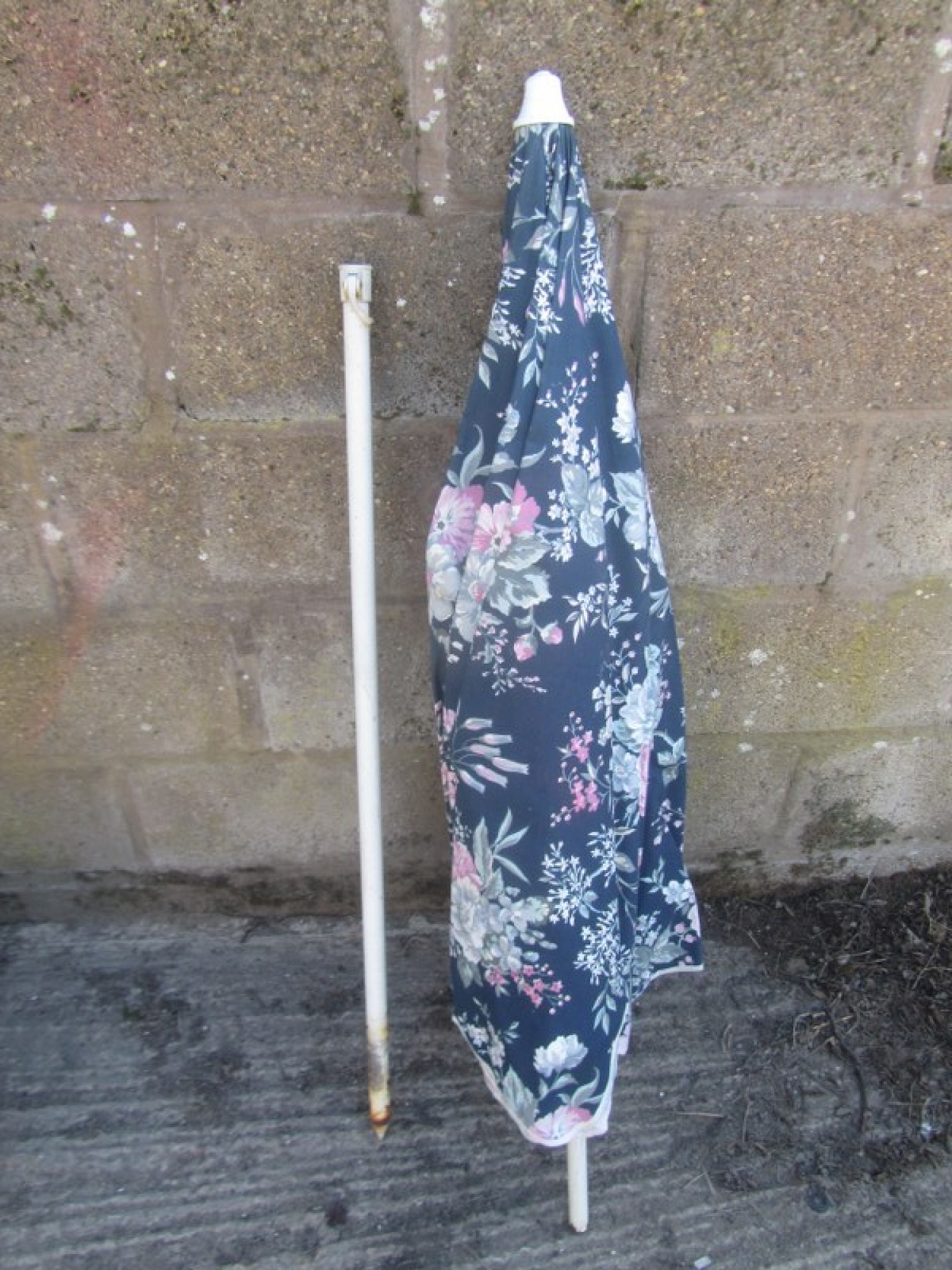 A PARASOL FOR THE GARDEN WITH A RETRO DESIGN. 200cm DIAMETER, IT IS MATERIAL, TO GIVE SHELTER FROM THE SUN AND RAIN. IT NEEDS TO BE USED WITH A TABLE & BASE TO GIVE SUPPORT.