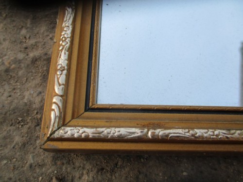 A TALL DRESSING MIRROR WITH GOLD COLOURED DECORATION AROUND THE EDGE, THE MIRROR IS IN GOOD CONDITION.