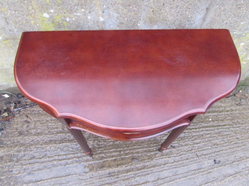A HALF MOON HALL TABLE. IT IS IN A MAHOGANY VENEER.