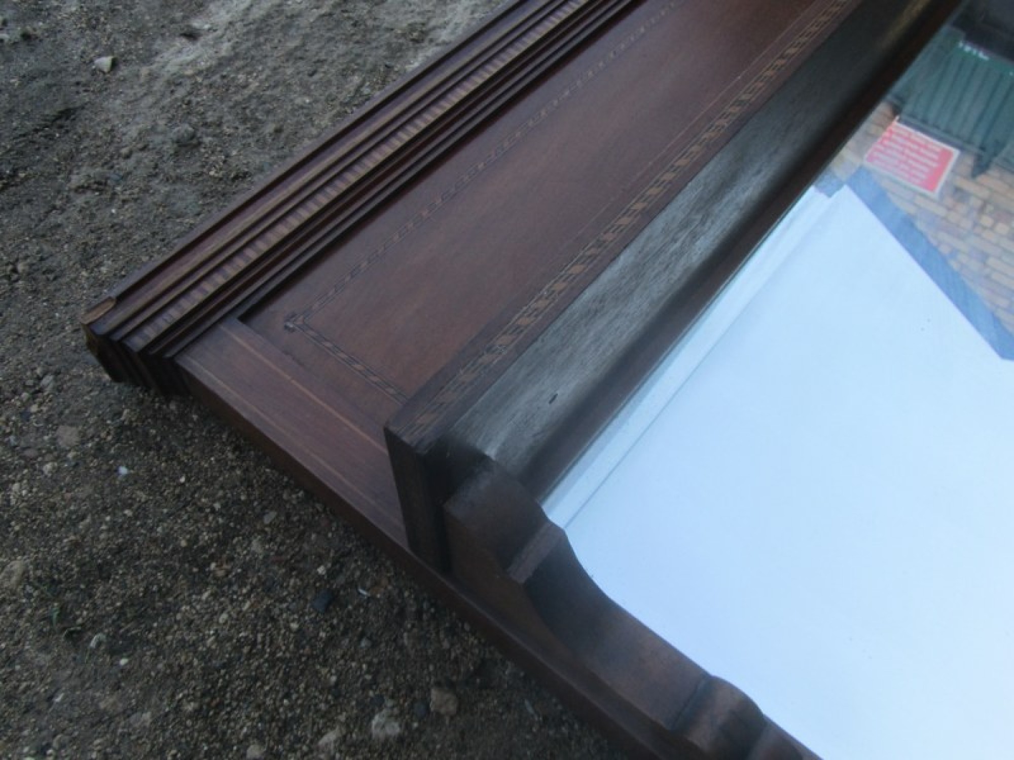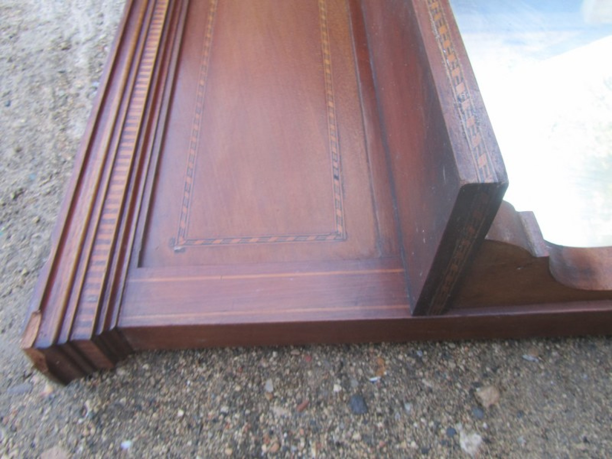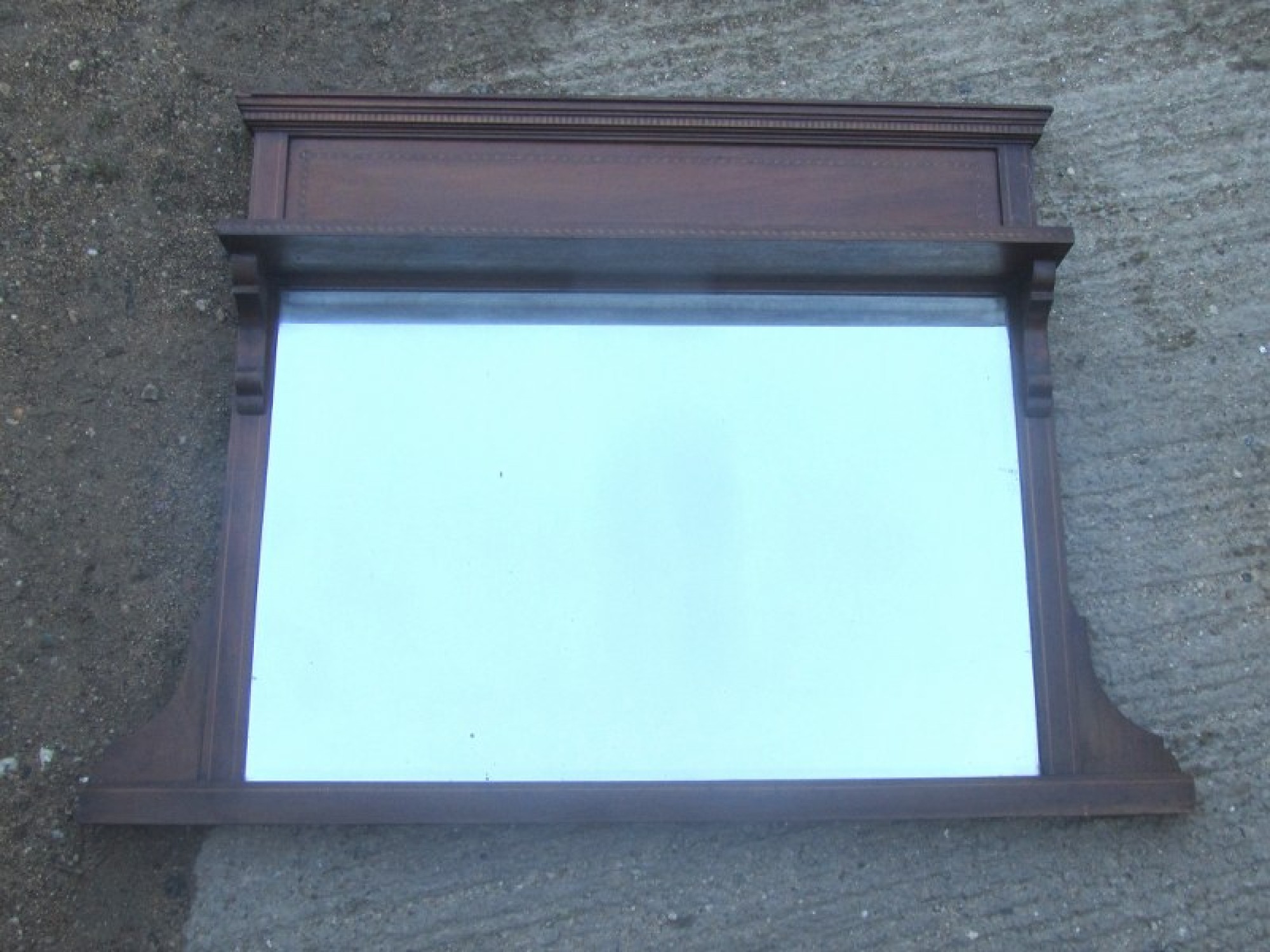 AN OVERMANTLE MIRROR, THE FRAME IS MAHOGANY WITH INLAID DETAIL. WITH SHELF ABOVE.