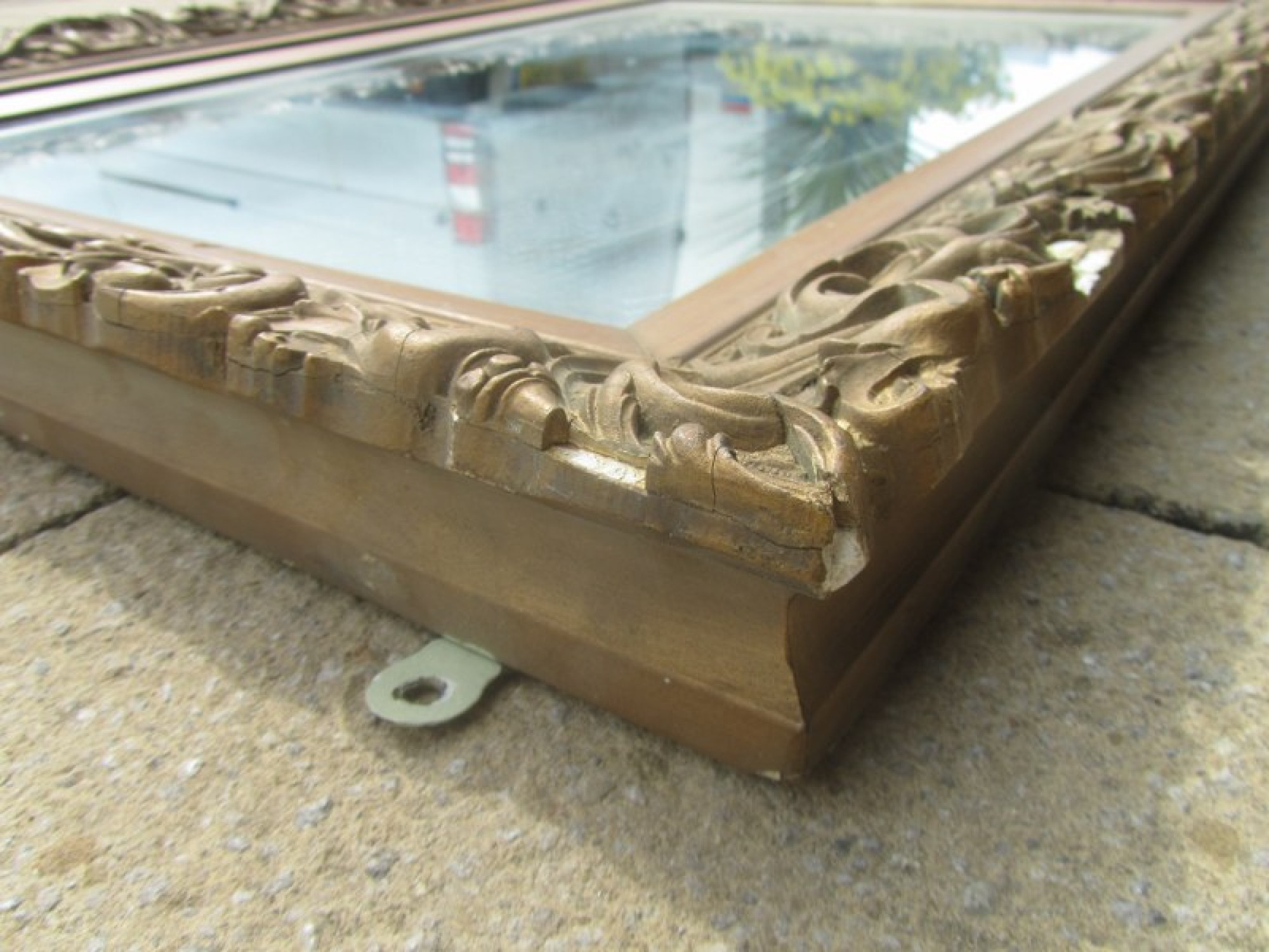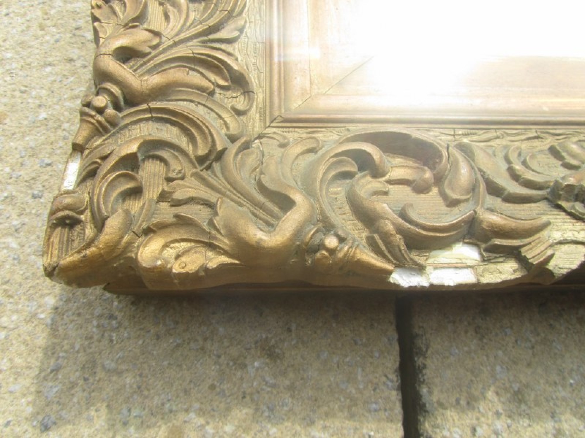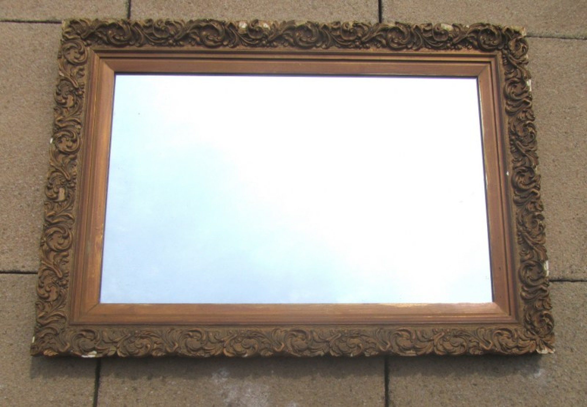 FROM THE LATE VICTORIAN PERIOD. GOLD PAINTED GILT EFFECT FRAME. SOME SMALL CHIPS AND WEAR TO THE FRAME. THE MIRROR IS IN AVERAGE CONDITION, SOME WEAR.
