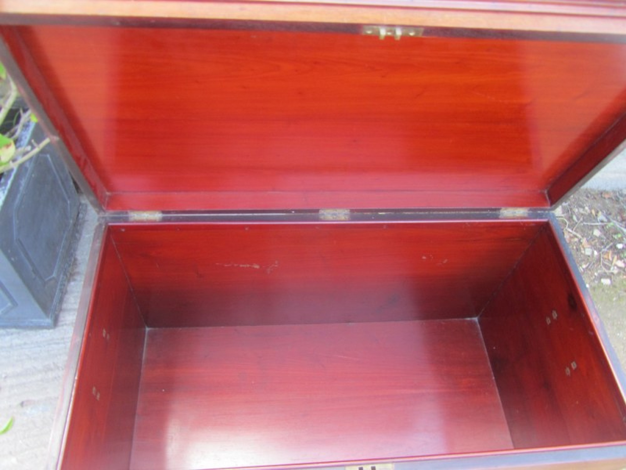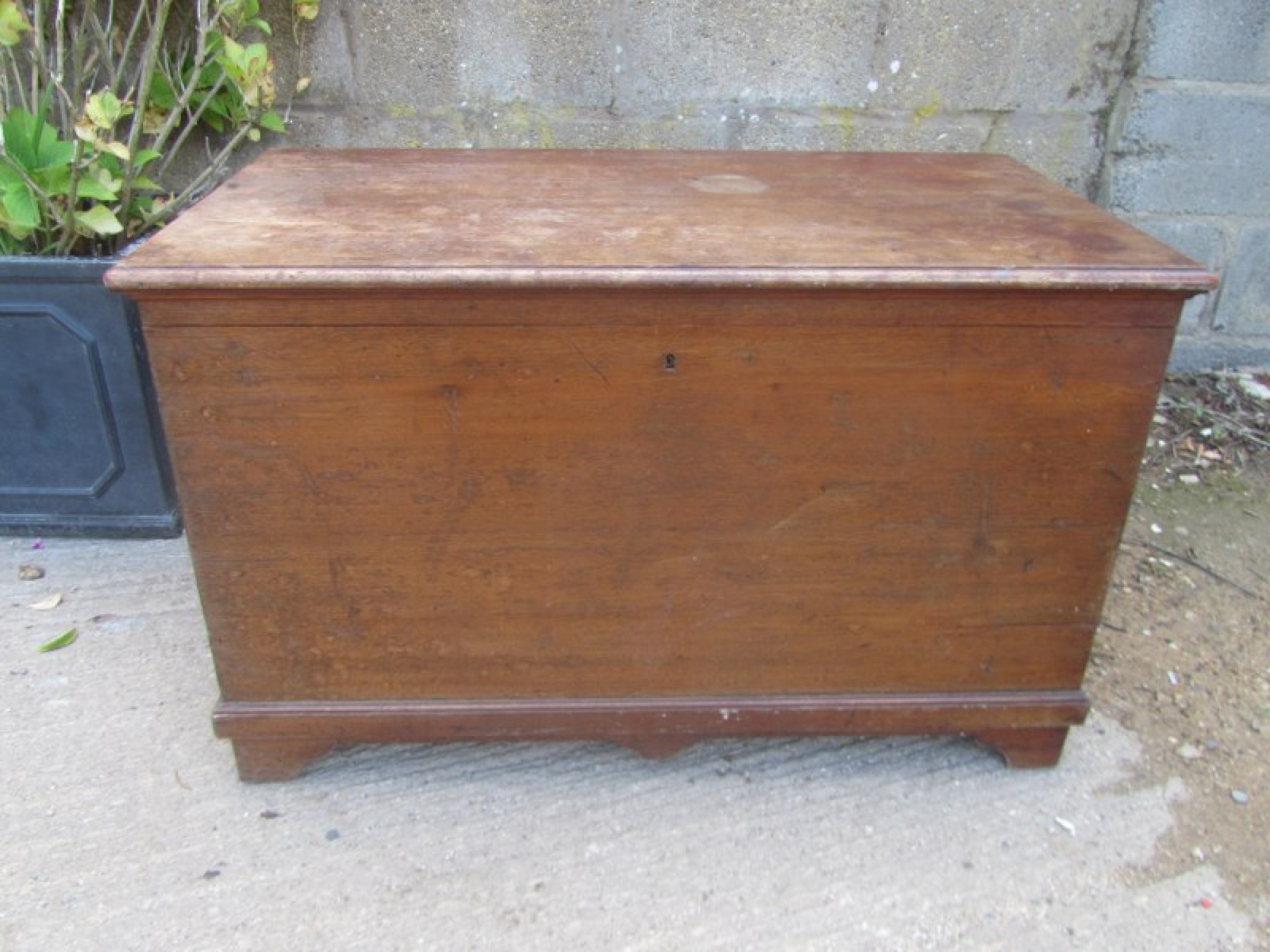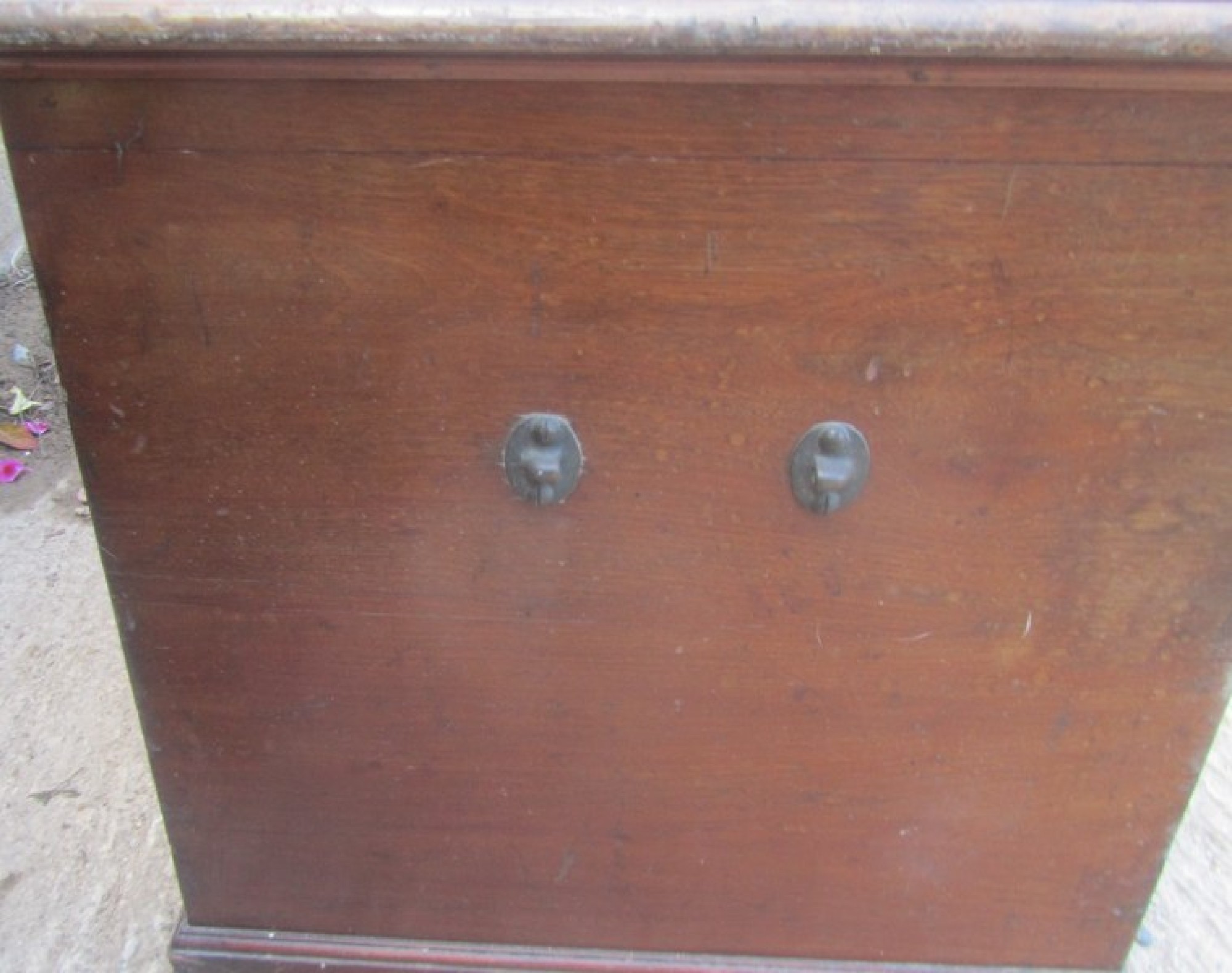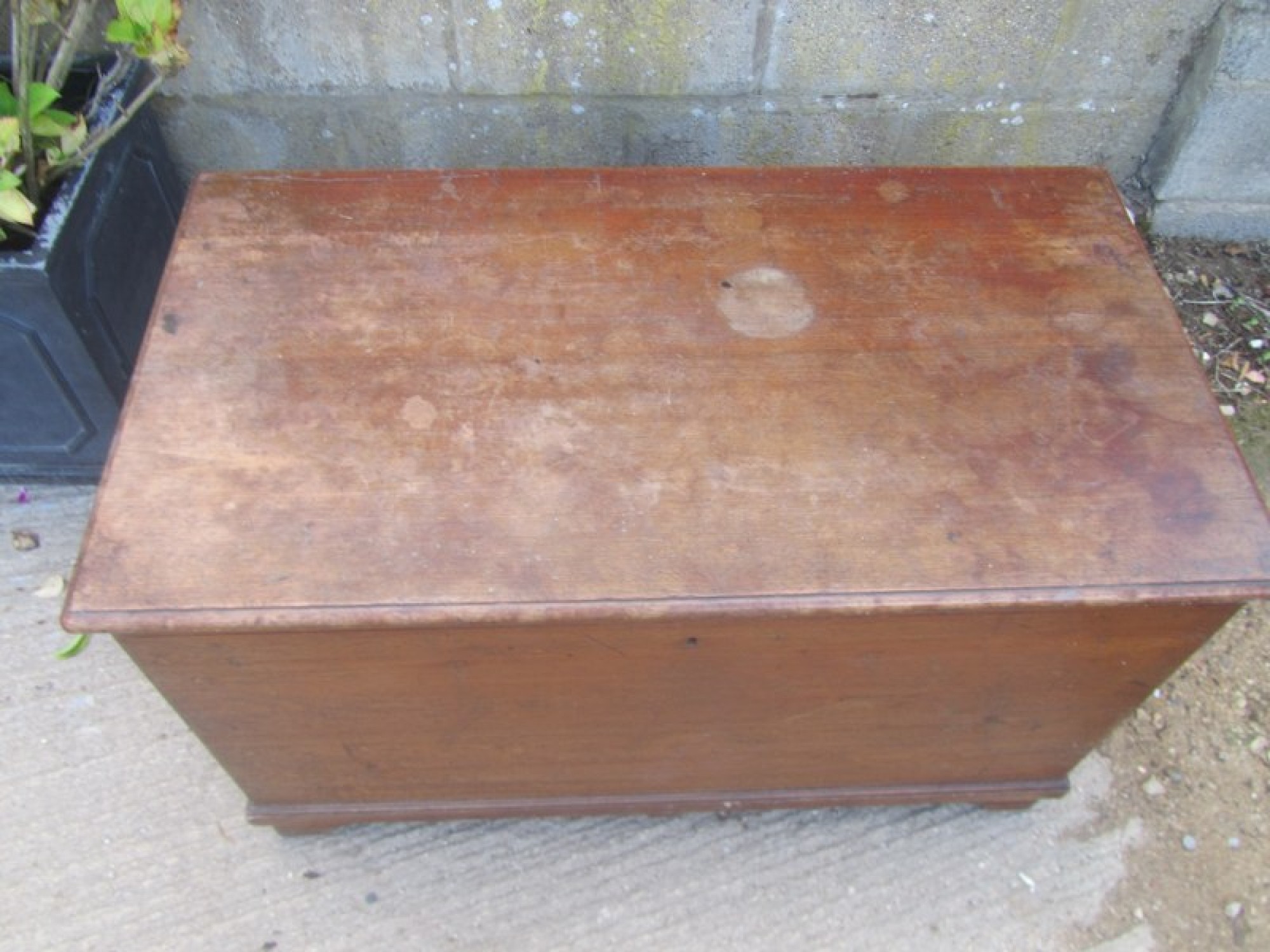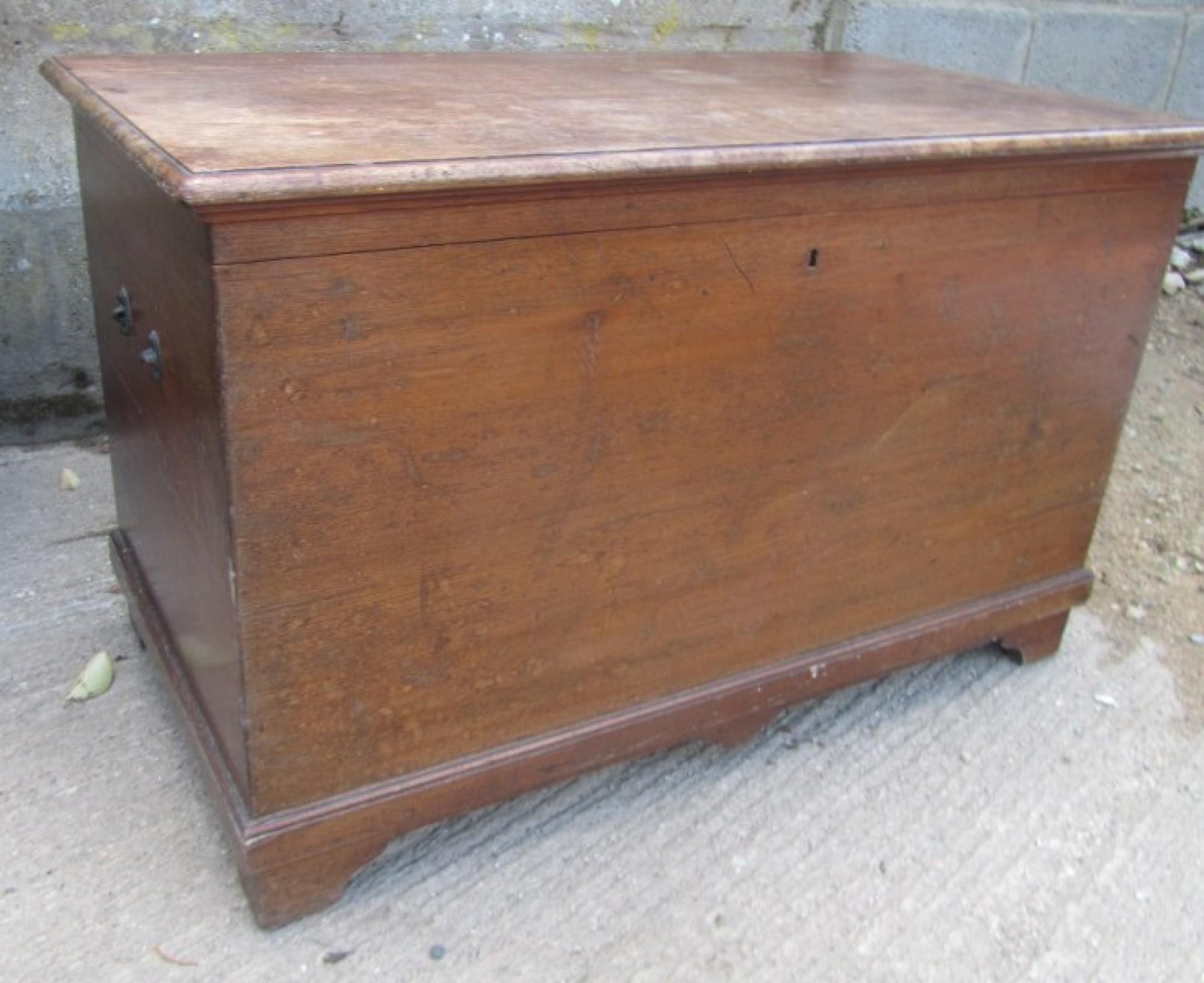 A LARGE ANTIQUE BLANKET BOX. SOLID MAHOGANY, FADED ON THE OUTSIDE. SOME WEAR. THE METAL HANDLES ARE MISSING. STRONG AND STURDY. IDEAL STORAGE OR COFFEE TABLE.