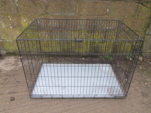 A LARGE METAL DOG CRATE. WITH HANDLE. FOLDS FLAT WHEN NOT IN USE.