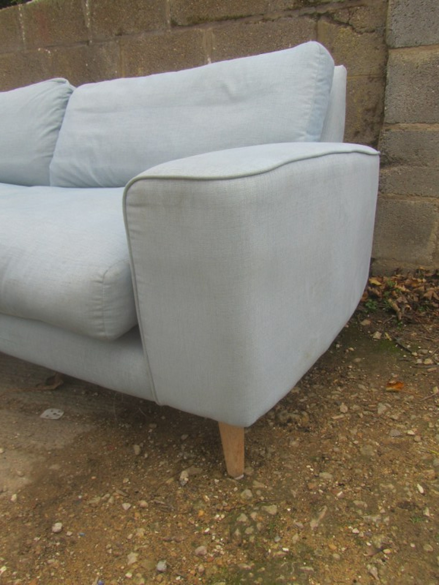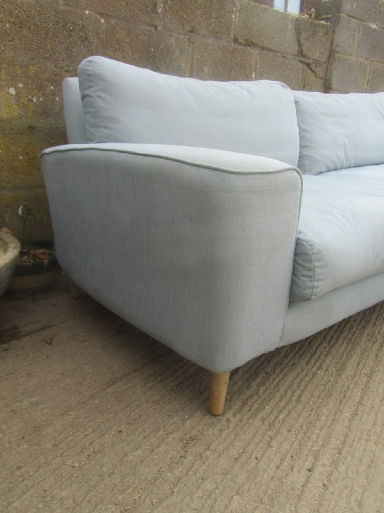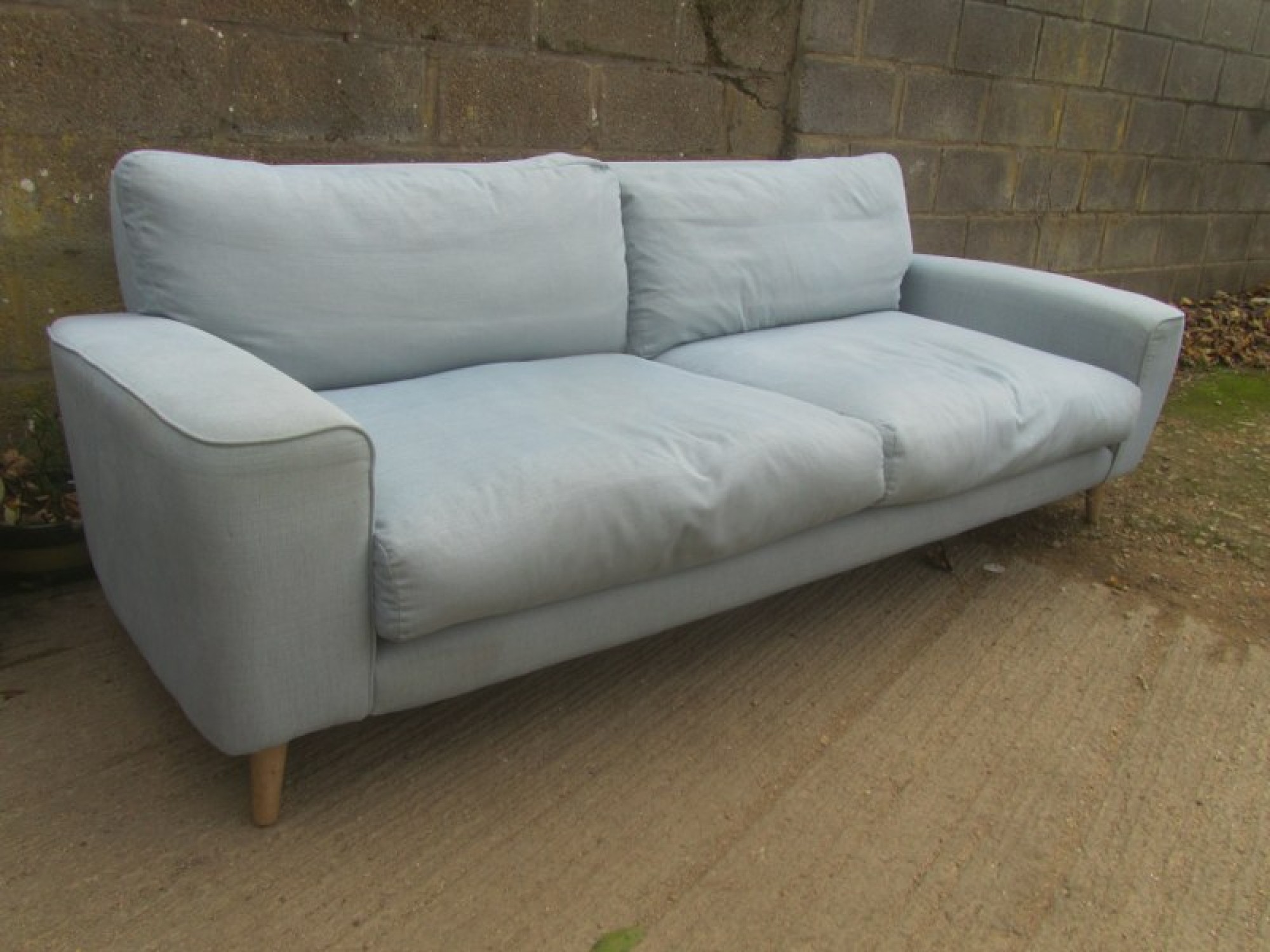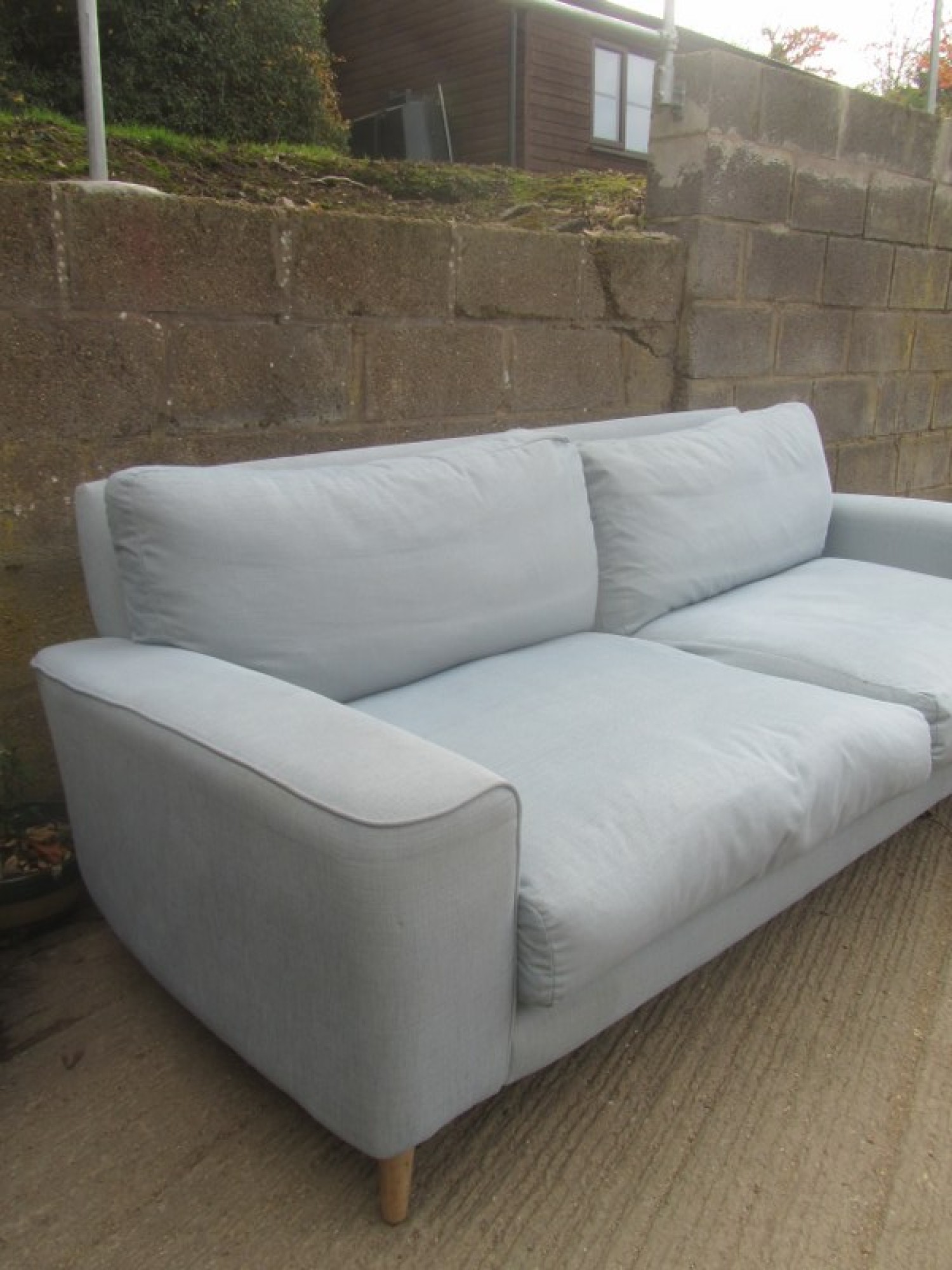 A LARGE 3 / 4 SEATER SOFA, IN A LIGHT BLUE MATERIAL. MADE BY 'LOAF', GOOD QUALITY MAKERS, THIS IS A 'STRUDEL' SOFA. THE FRAME IS STURDY, SPRINGS ARE ALL OK. IT IS LOW AND SOFT, DEEP SEAT. ON WOODEN LEGS.