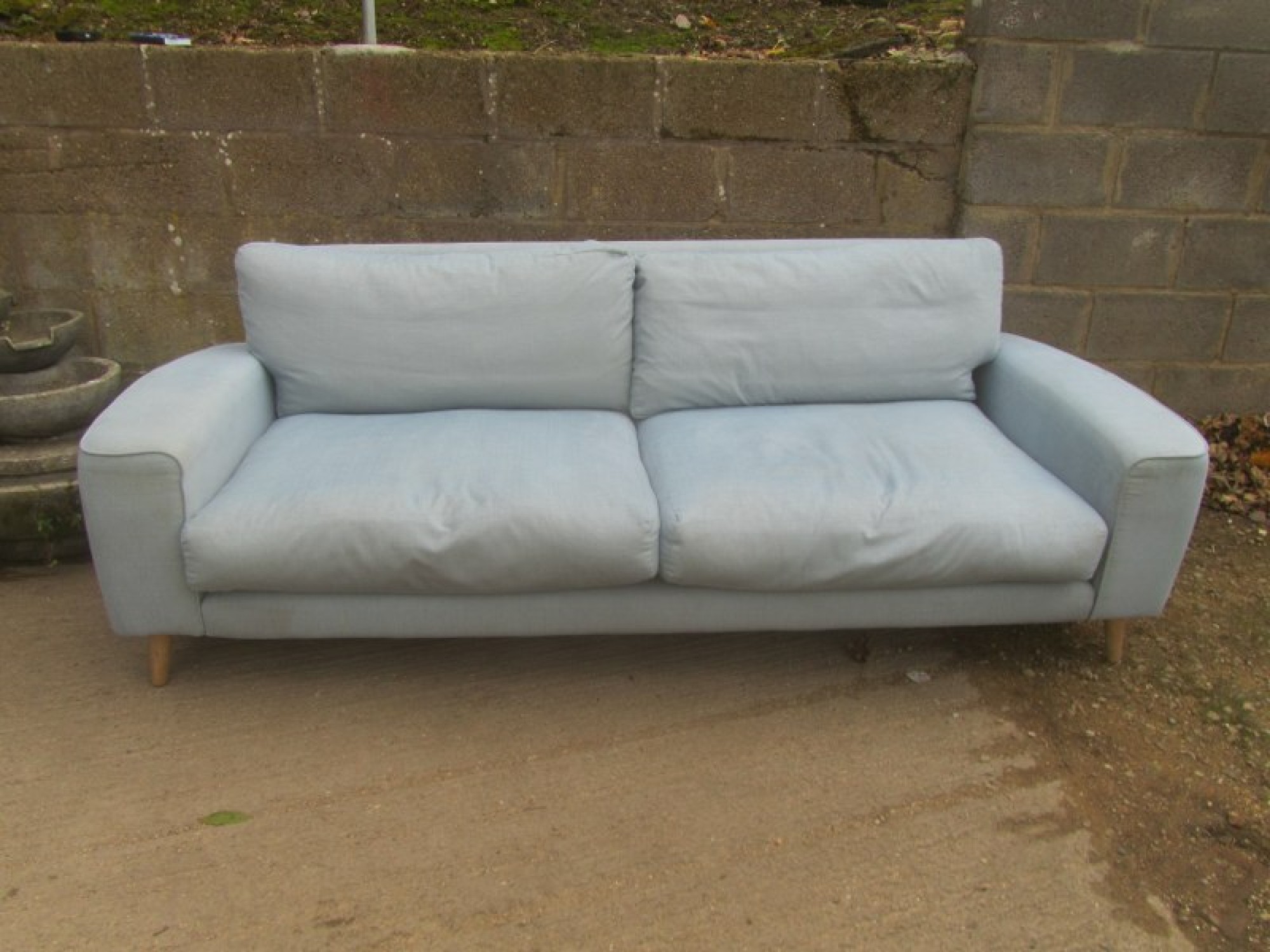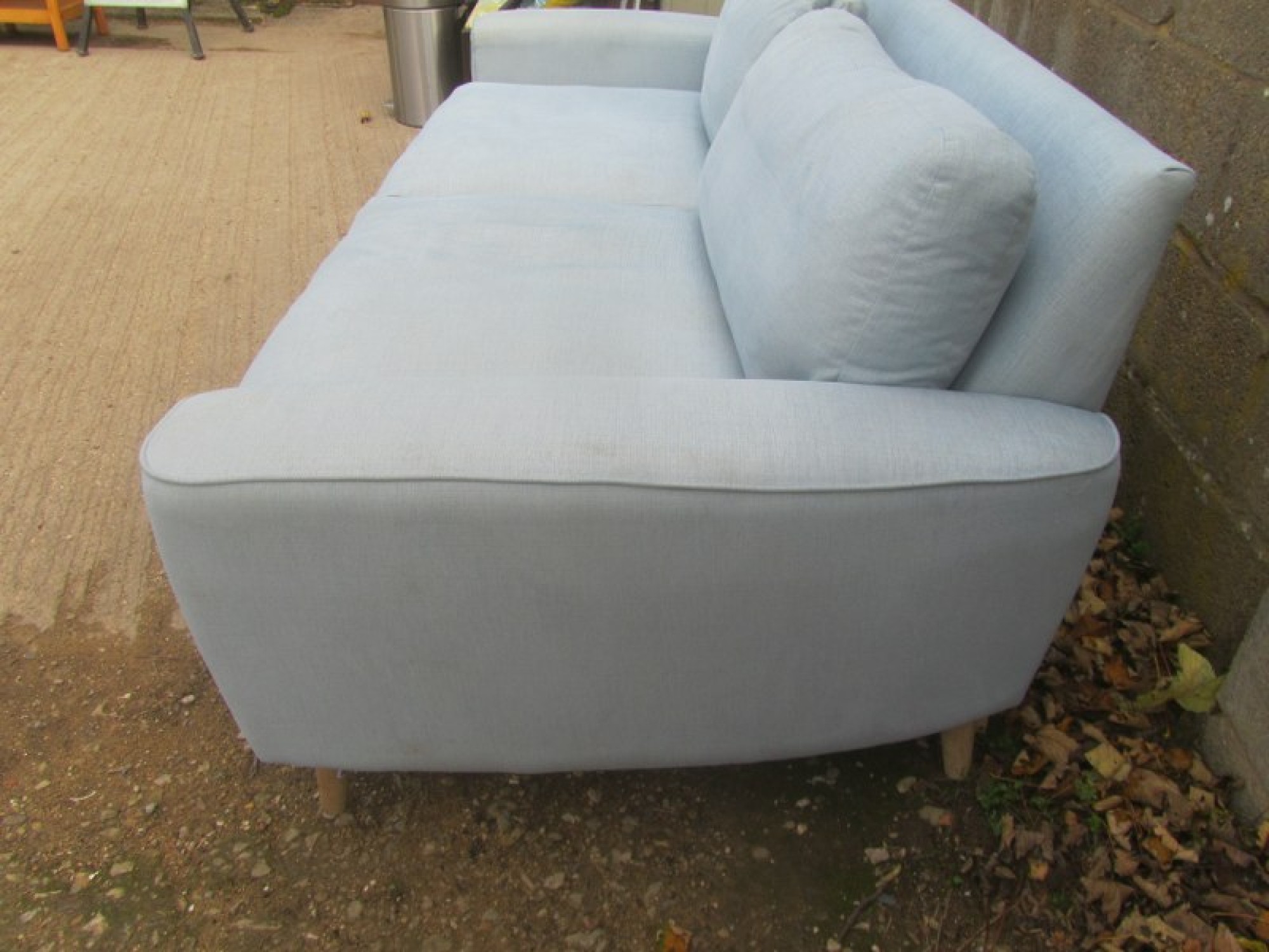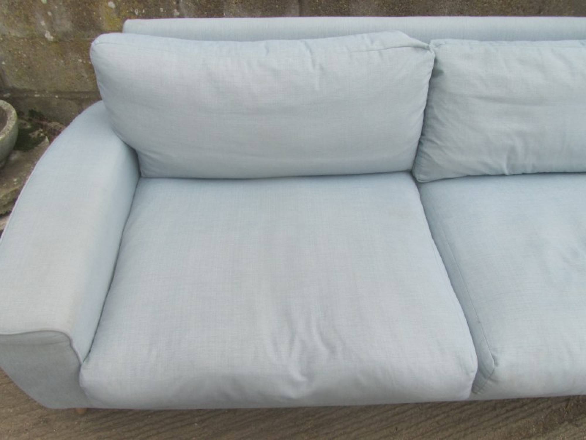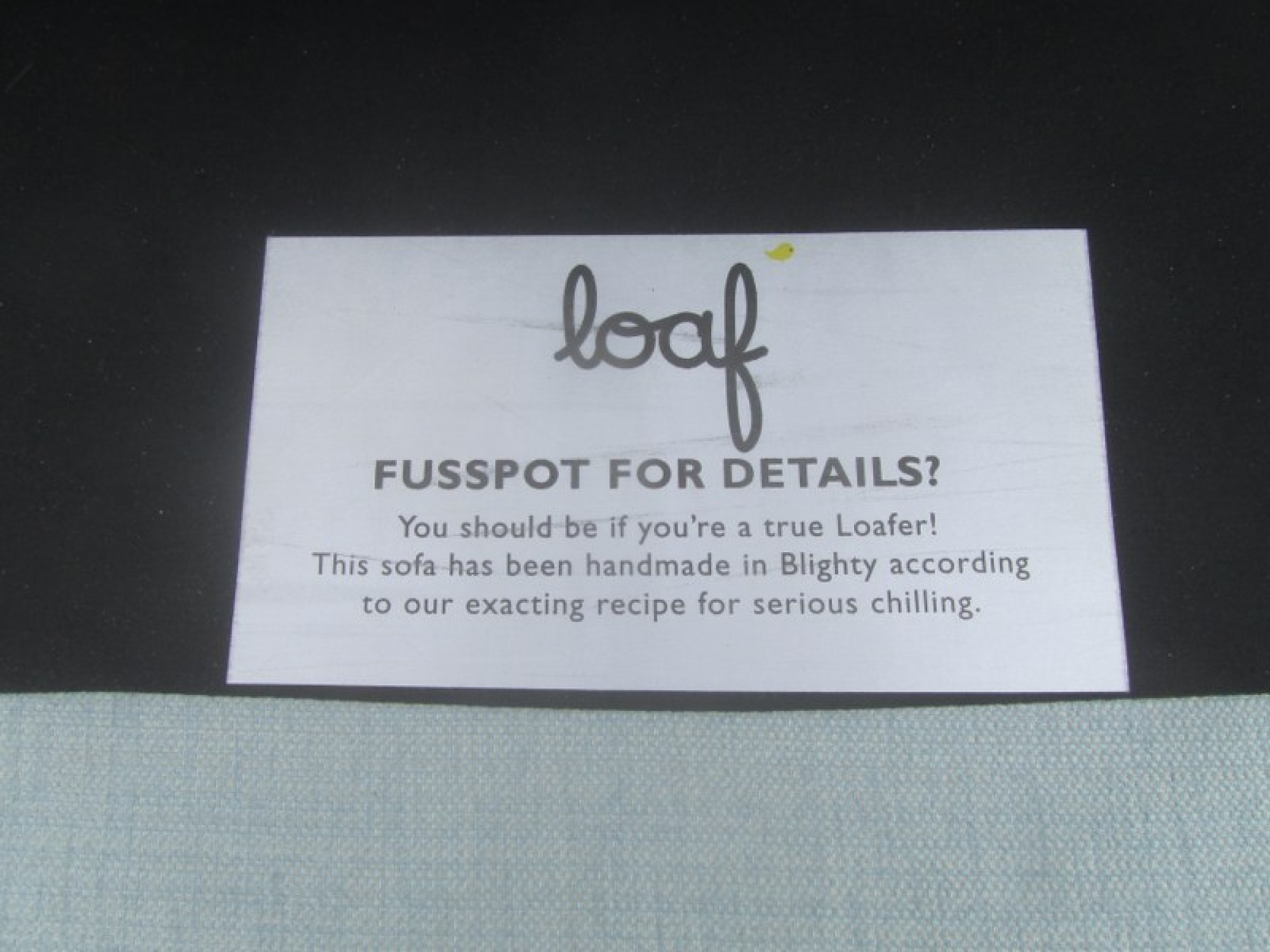 A LARGE 3 / 4 SEATER SOFA, IN A LIGHT BLUE MATERIAL. MADE BY 'LOAF', GOOD QUALITY MAKERS, THIS IS A 'STRUDEL' SOFA. THE FRAME IS STURDY, SPRINGS ARE ALL OK. IT IS LOW AND SOFT, DEEP SEAT. ON WOODEN LEGS.
