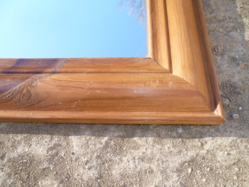 A LARGE RECTANGULAR WALL MIRROR IN A SOLID PINE FRAME.