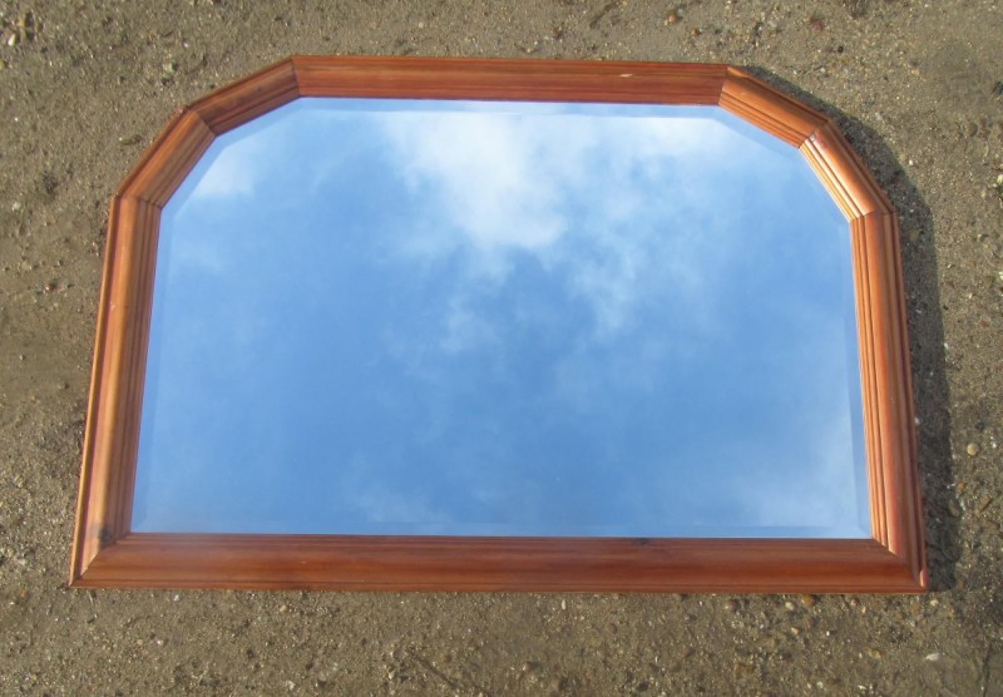 A LARGE WALL MIRROR IN A SOLID PINE FRAME.