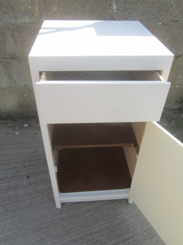 A STURDY CABINET WITH SINGLE DOOR, PLENTY OF STORAGE SPACE. THE CABINET IS PLYWOOD, IT IS PAINTED WHITE.