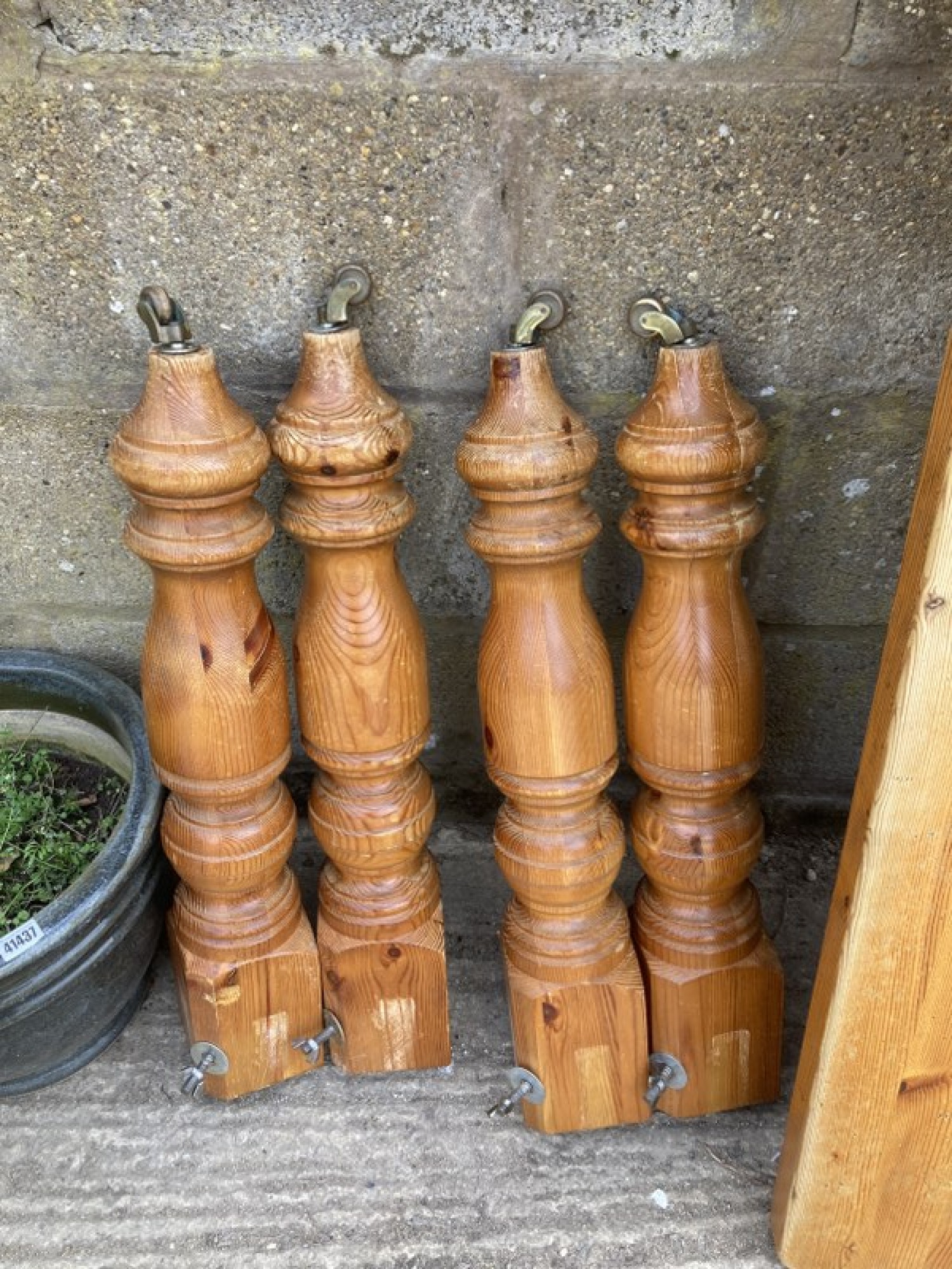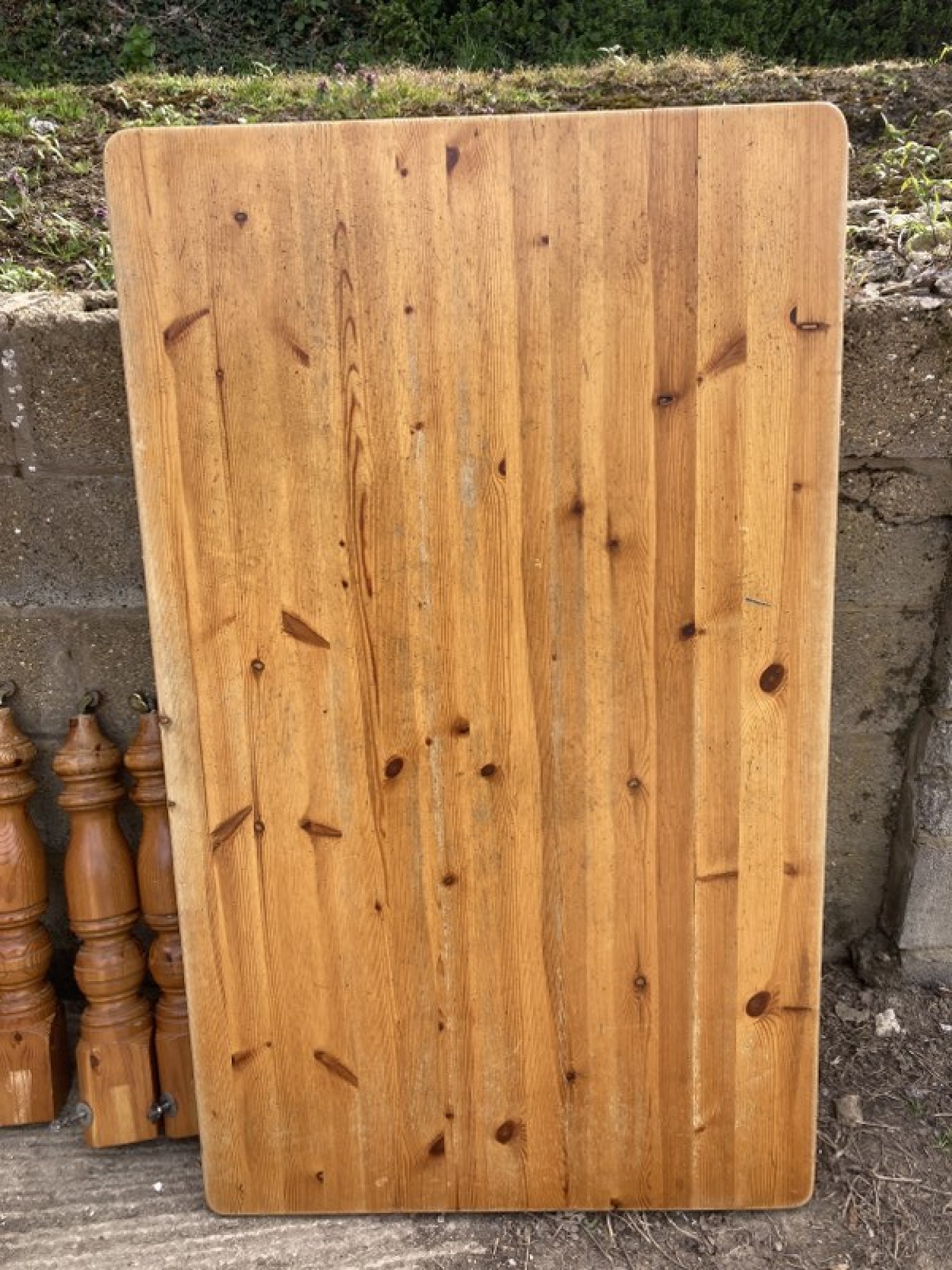 A SOLID PINE DINING TABLE, IN A TRADITIONAL FARMHOUSE STYLE. THE TABLE TOP HAS A RUSTIC LOOK, STRONG AND STURDY. THE LEGS REMOVE FOR TRANSPORT. BRASS CASTORS. THE TOP IS WORN.