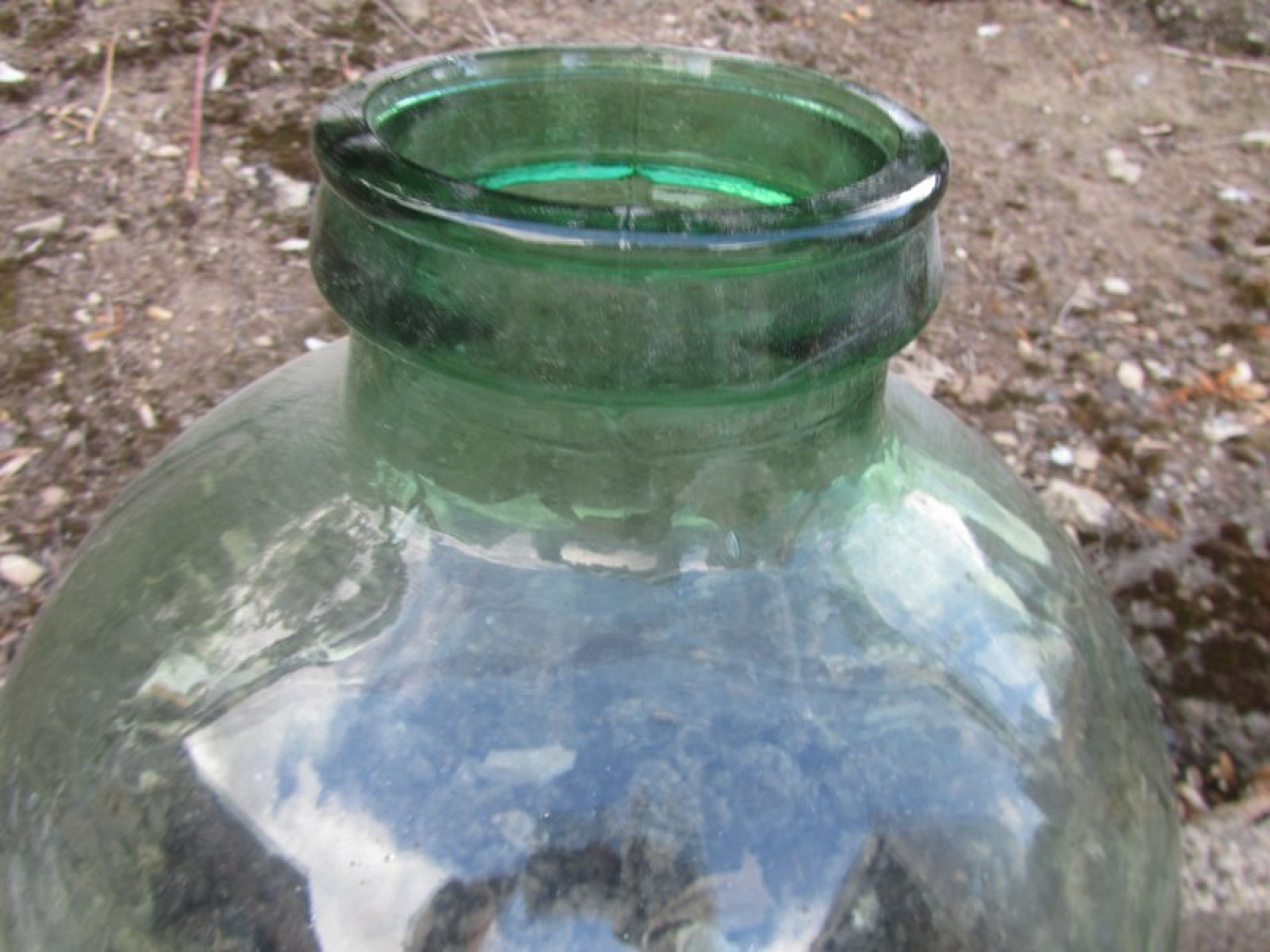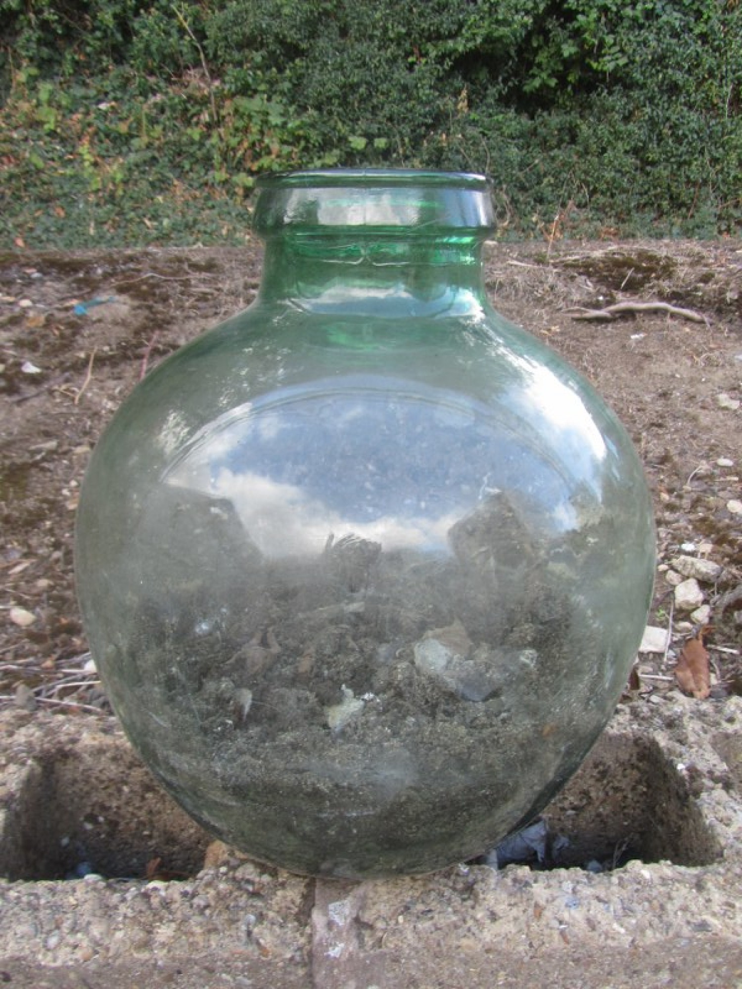 A GLASS BOTTLE, IDEAL FOR GROWING PLANTS IN, OR FOR COLLECTING LOOSE CHANGE, SHELLS, PEBBLES etc. A GREAT DECORATIVE ITEM. IT IS HALF FULL OF SOIL AND NEEDS A CLEAN.