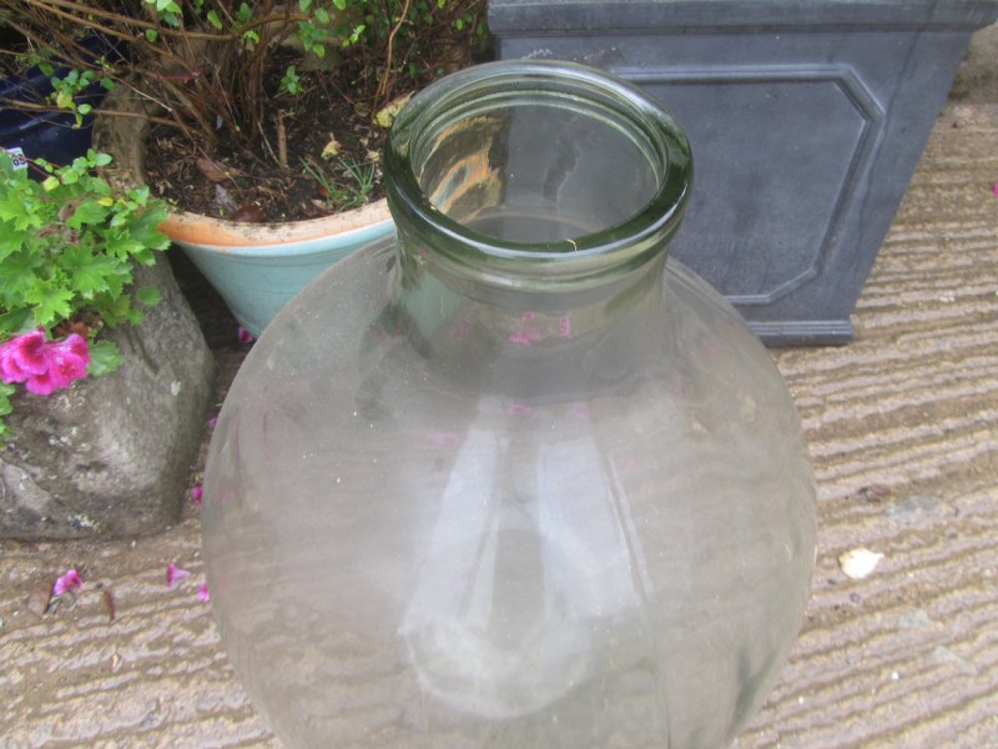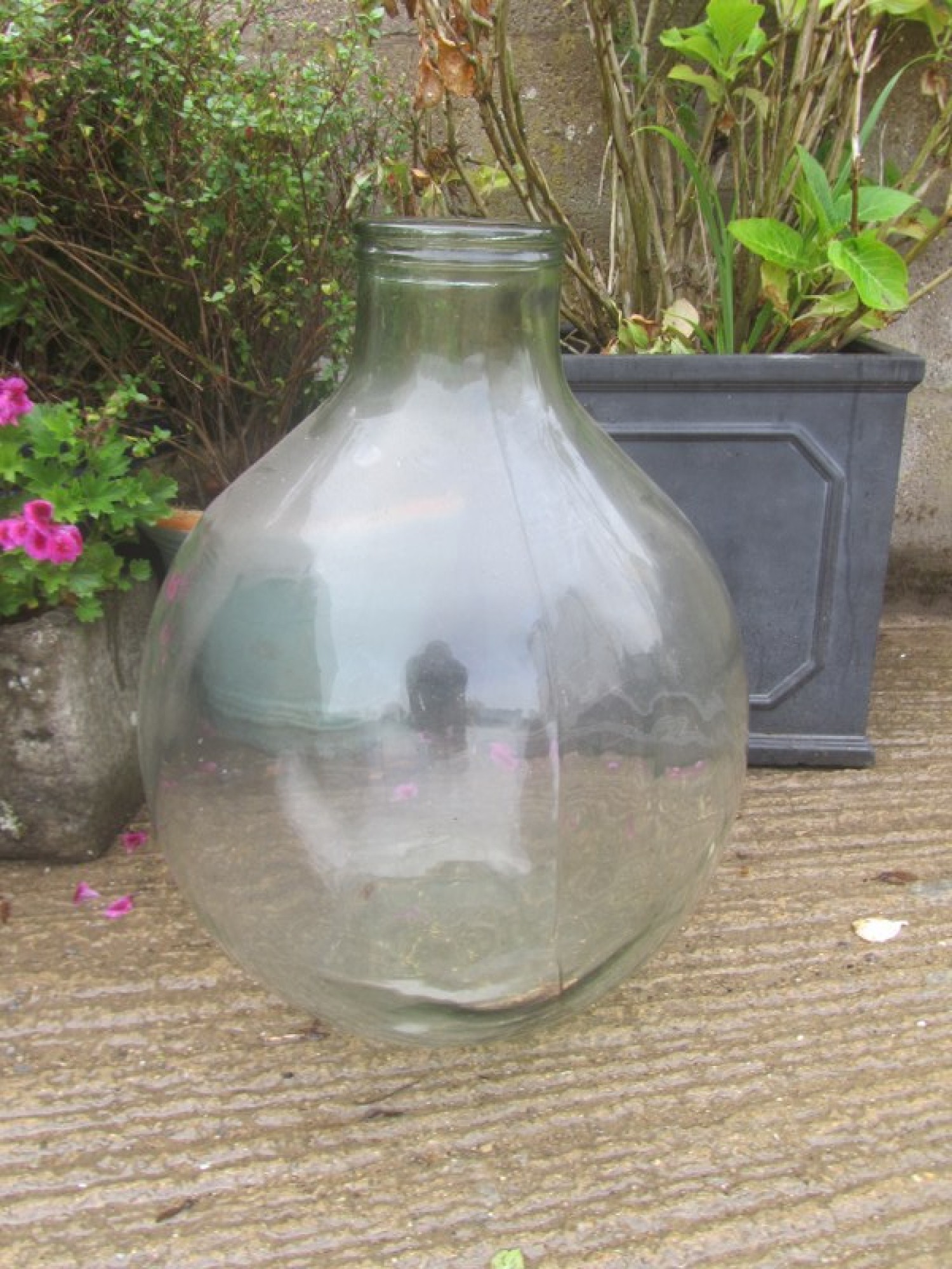 A GLASS BOTTLE, IDEAL FOR GROWING PLANTS IN, OR FOR COLLECTING LOOSE CHANGE, SHELLS, PEBBLES etc. A GREAT DECORATIVE ITEM.