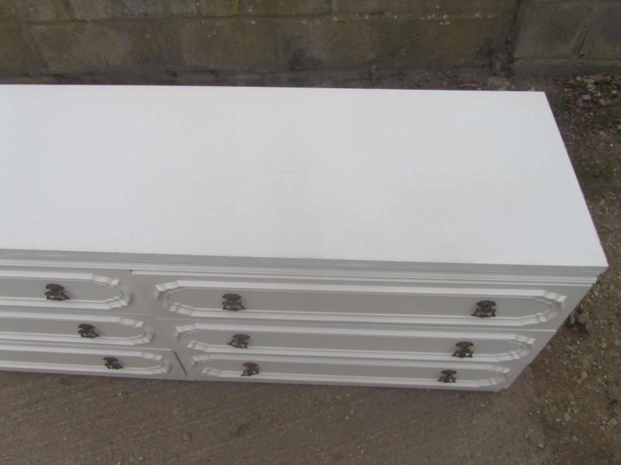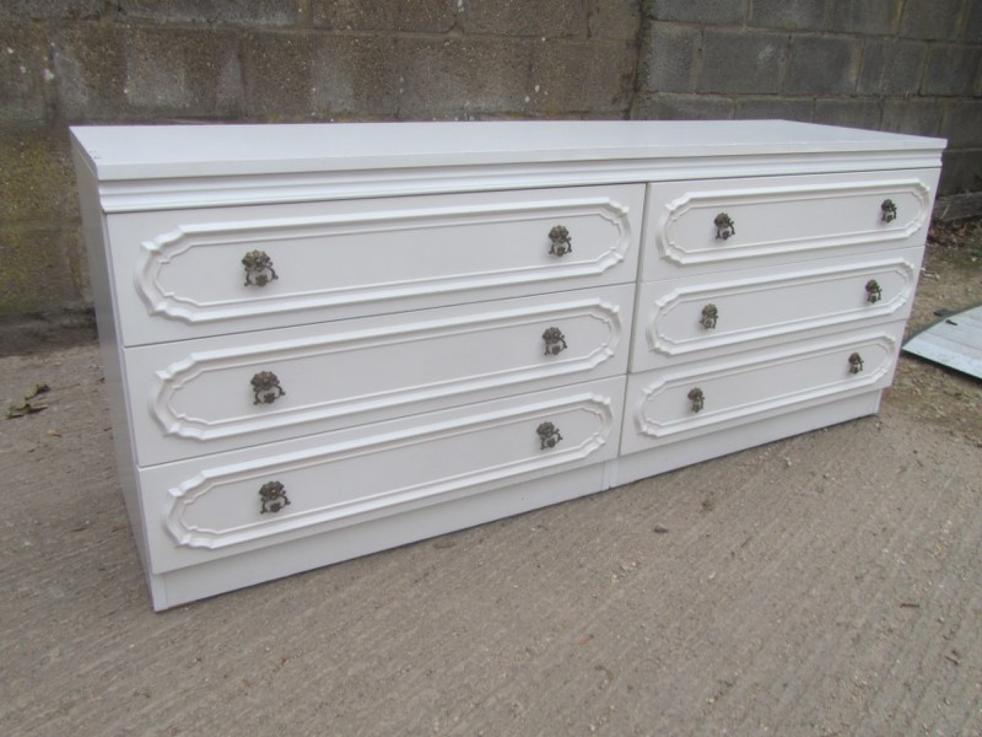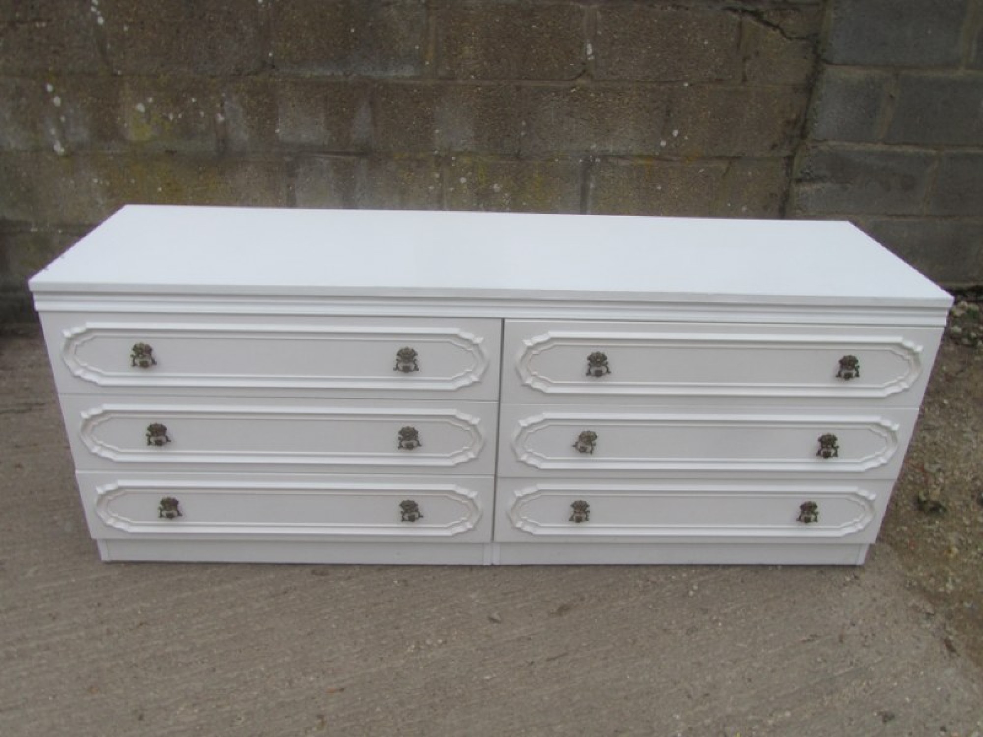 THIS IS A LARGE CHEST OF DRAWERS, IT IS WHITE GLOSSY MELAMINE. ORIGINAL HANDLES. IN AVERAGE CONDITION.