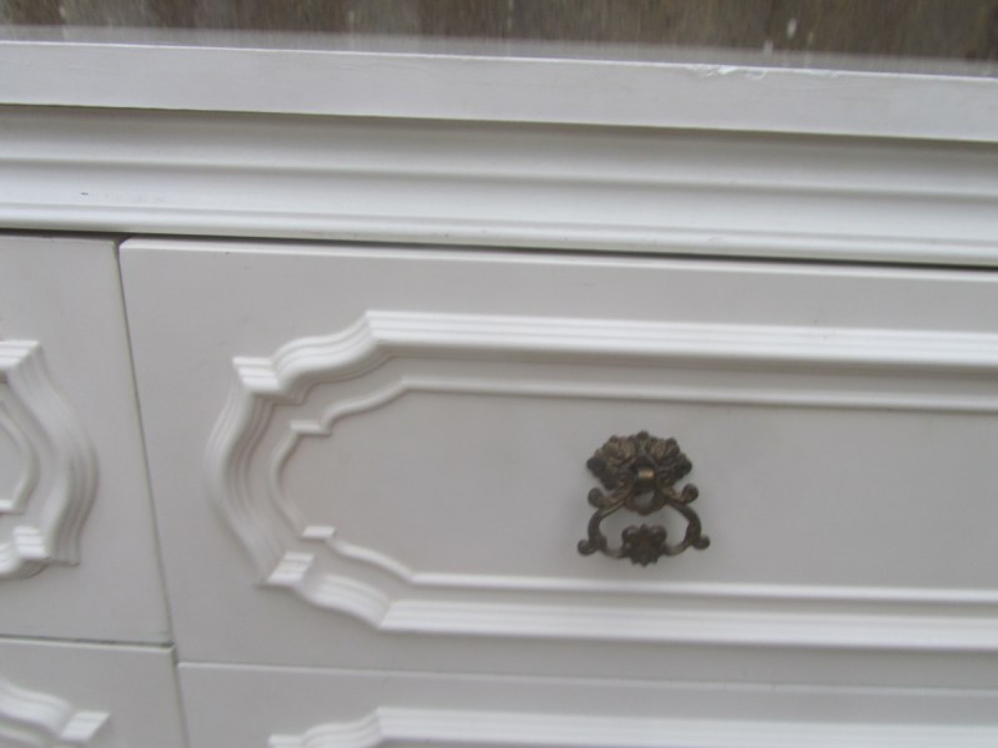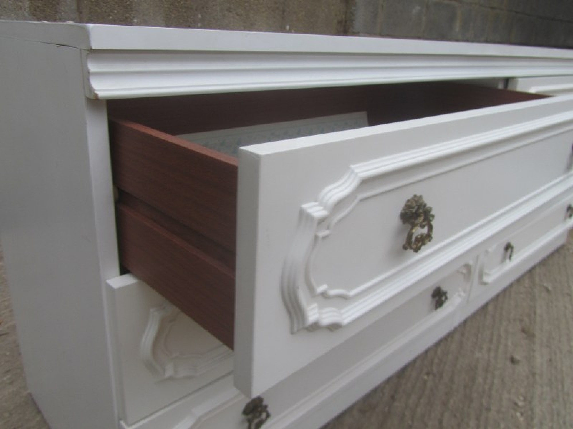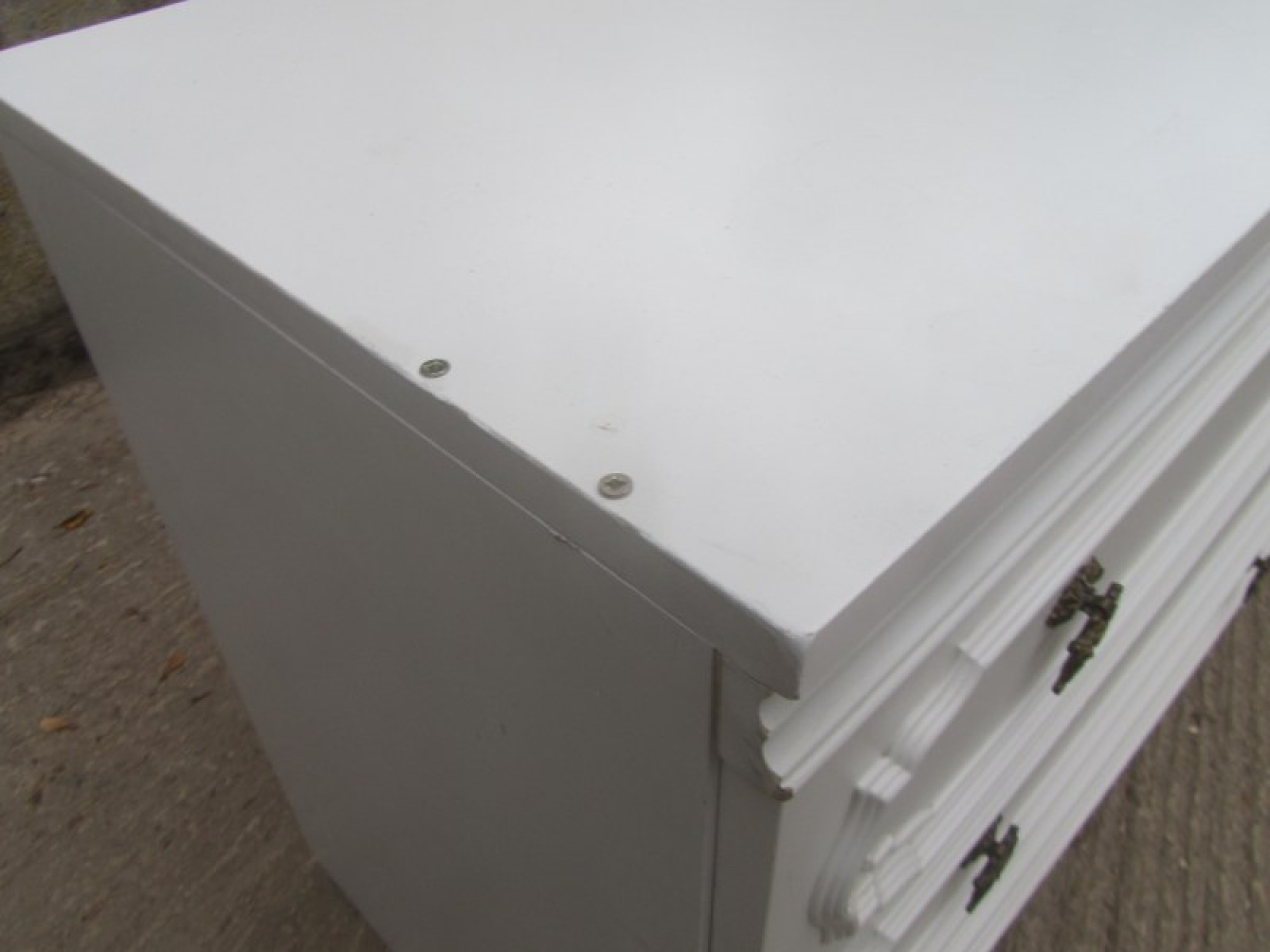 THIS IS A LARGE CHEST OF DRAWERS, IT IS WHITE GLOSSY MELAMINE. ORIGINAL HANDLES. IN AVERAGE CONDITION.
