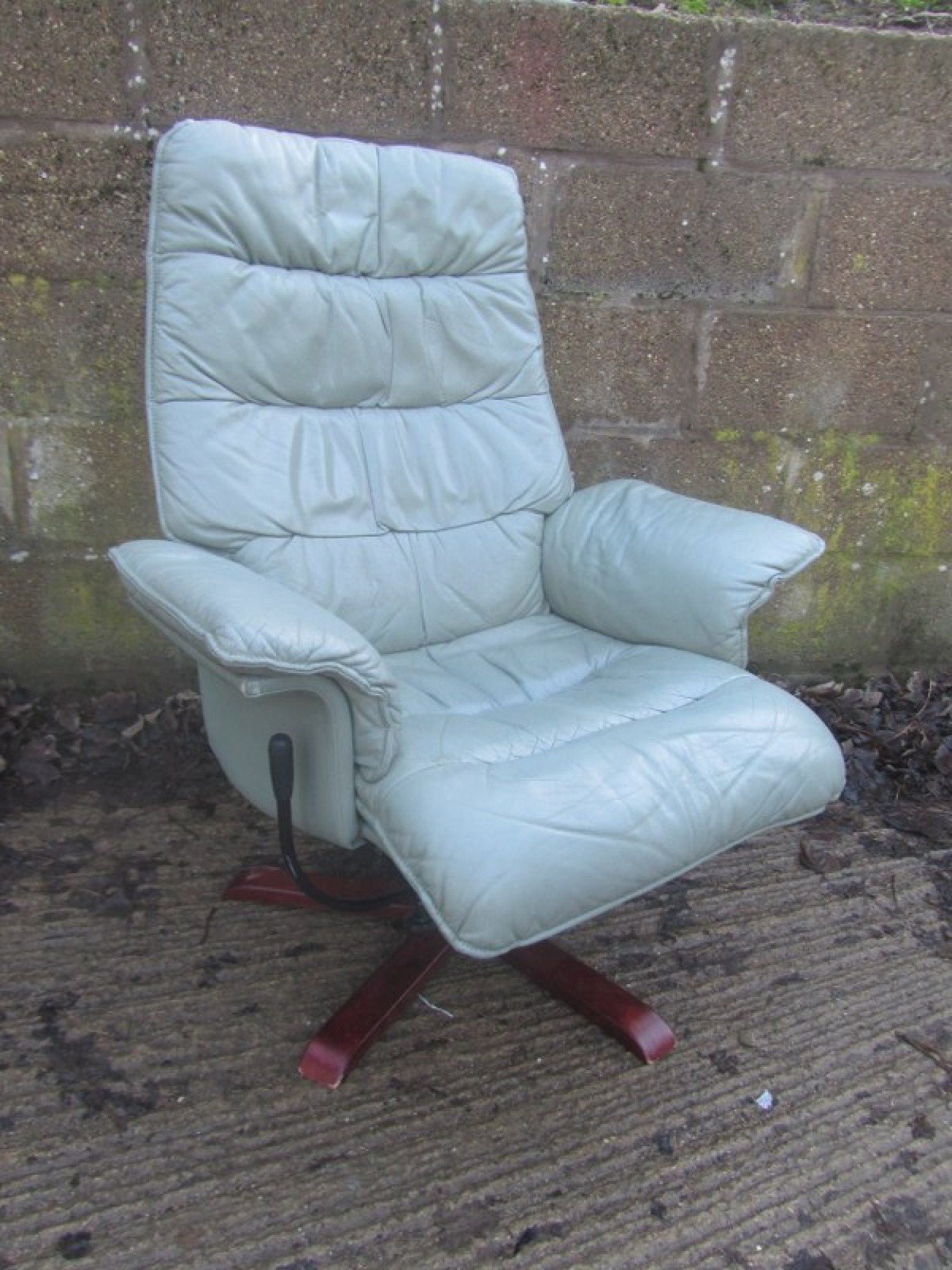 THIS IS AN ARMCHAIR IN LEATHER EFFECT. IT IS CLEAN AND COMFORTABLE. THE CHAIR SWIVELS AND RECLINES, THERE IS A FOOT STOOL THAT FITS NEATLY UP TO THE ARMCHAIR. A STYLISH CHAIR, COMFORTABLE. THERE IS SOME FADING AND WEAR.