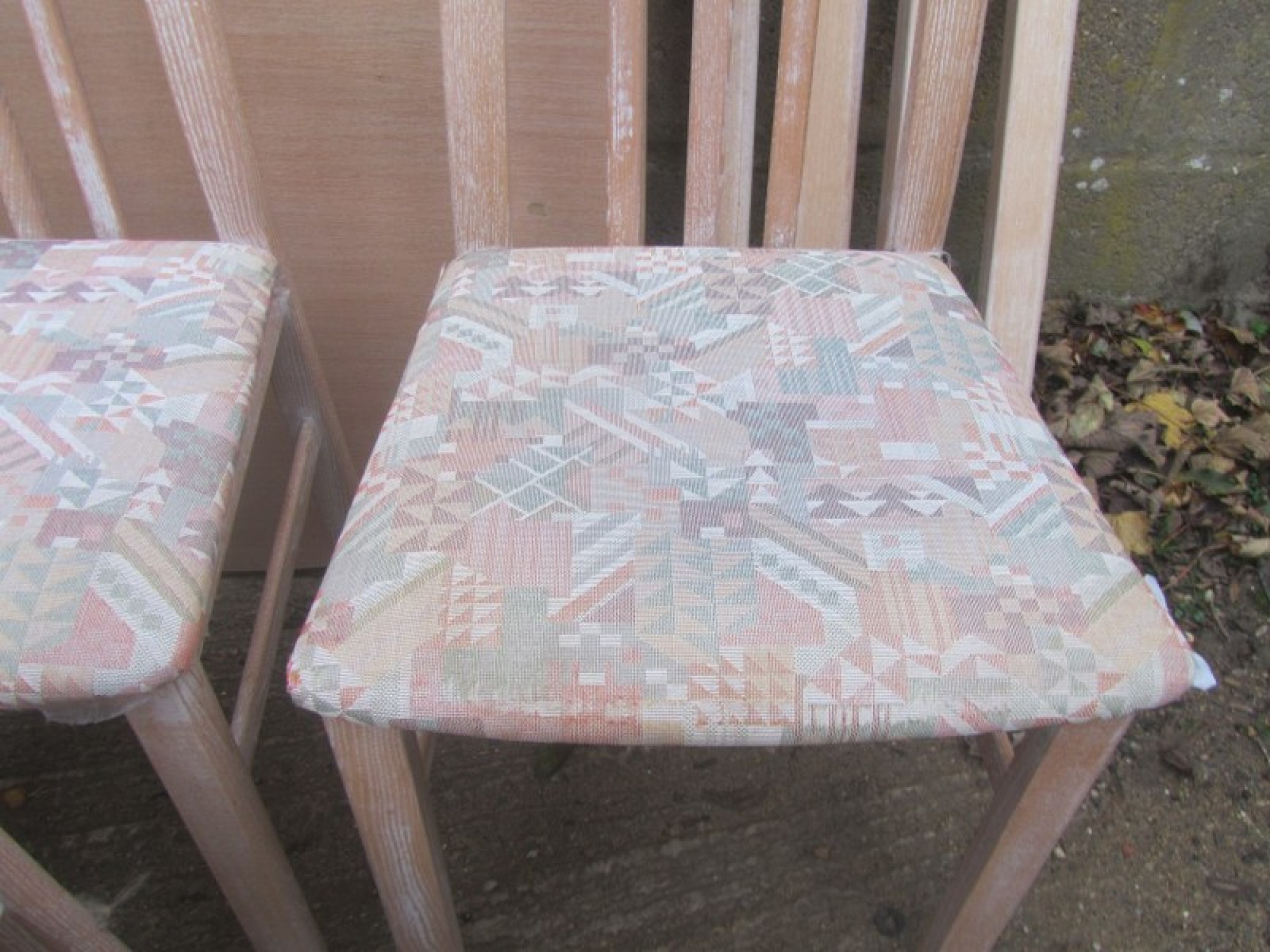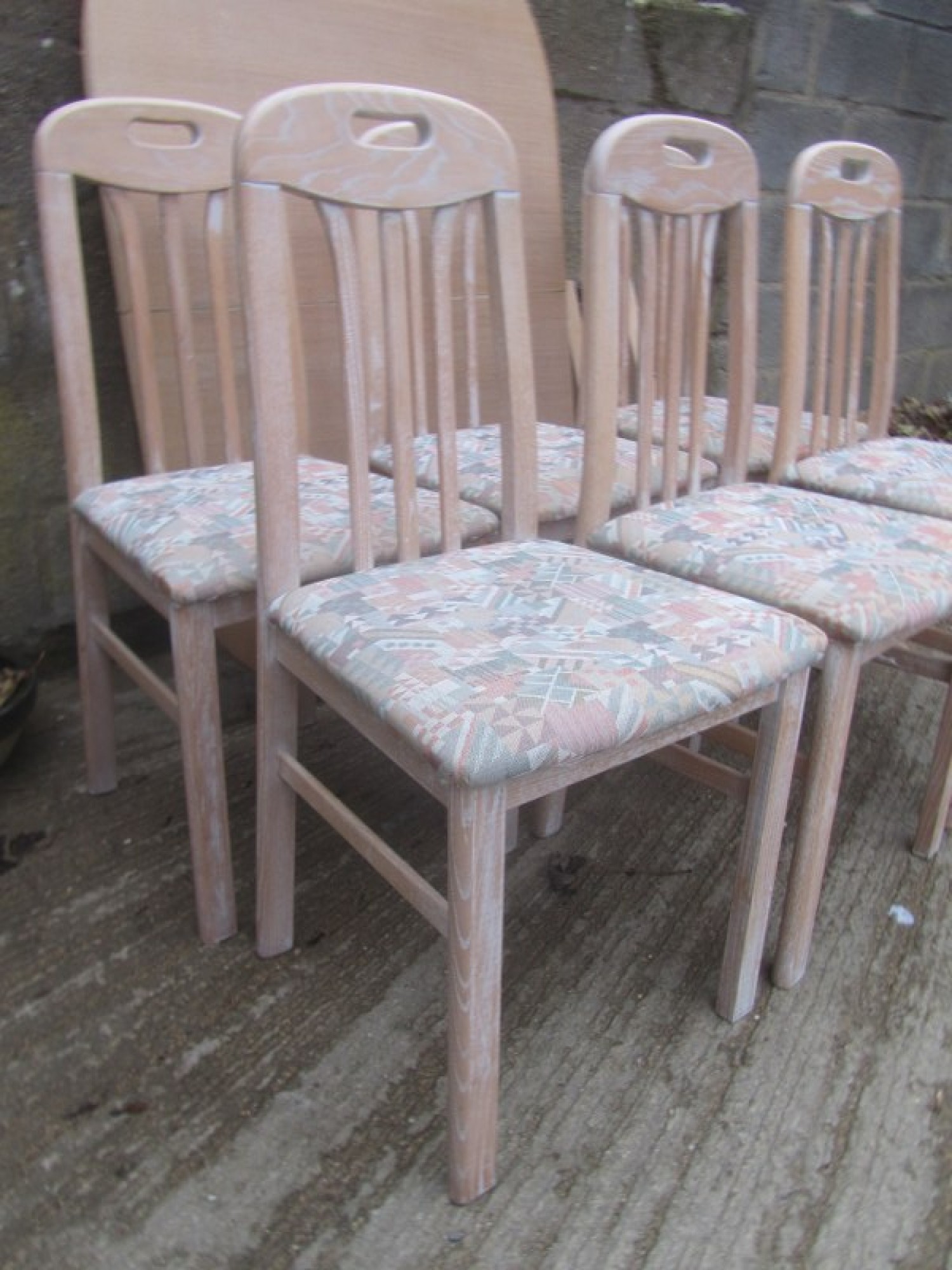 THIS IS A STRONG AND STURDY DINING TABLE WITH 6 CHAIRS. THE CHAIRS ARE SOLID BEECH IN A LIMED FINISH. THEY HAVE WOODEN BACKS AND PADDED SEATS. STRONG AND STURDY CHAIRS. SOME DISCOLOURATION TO SOME OF THE MATERIAL.