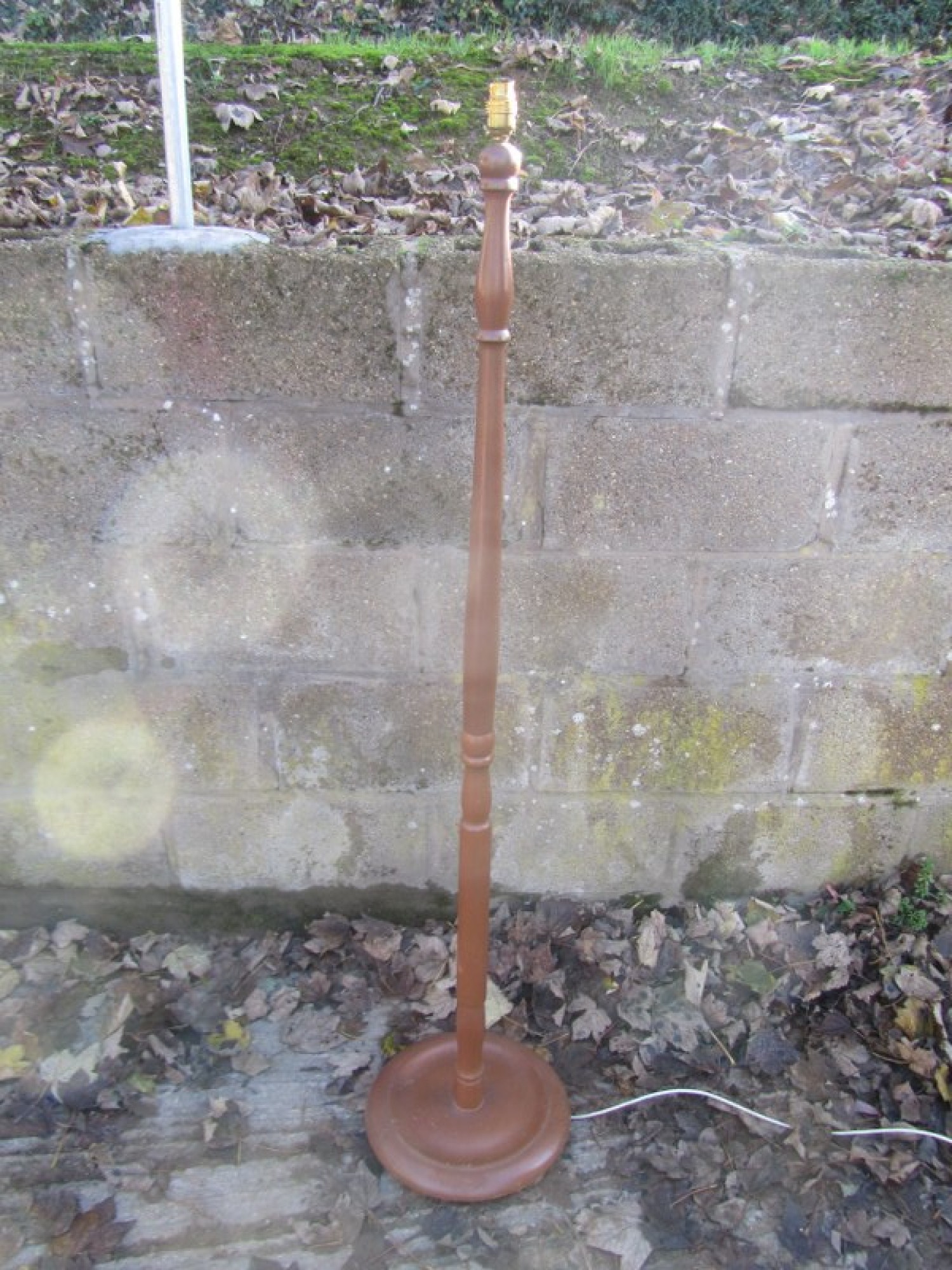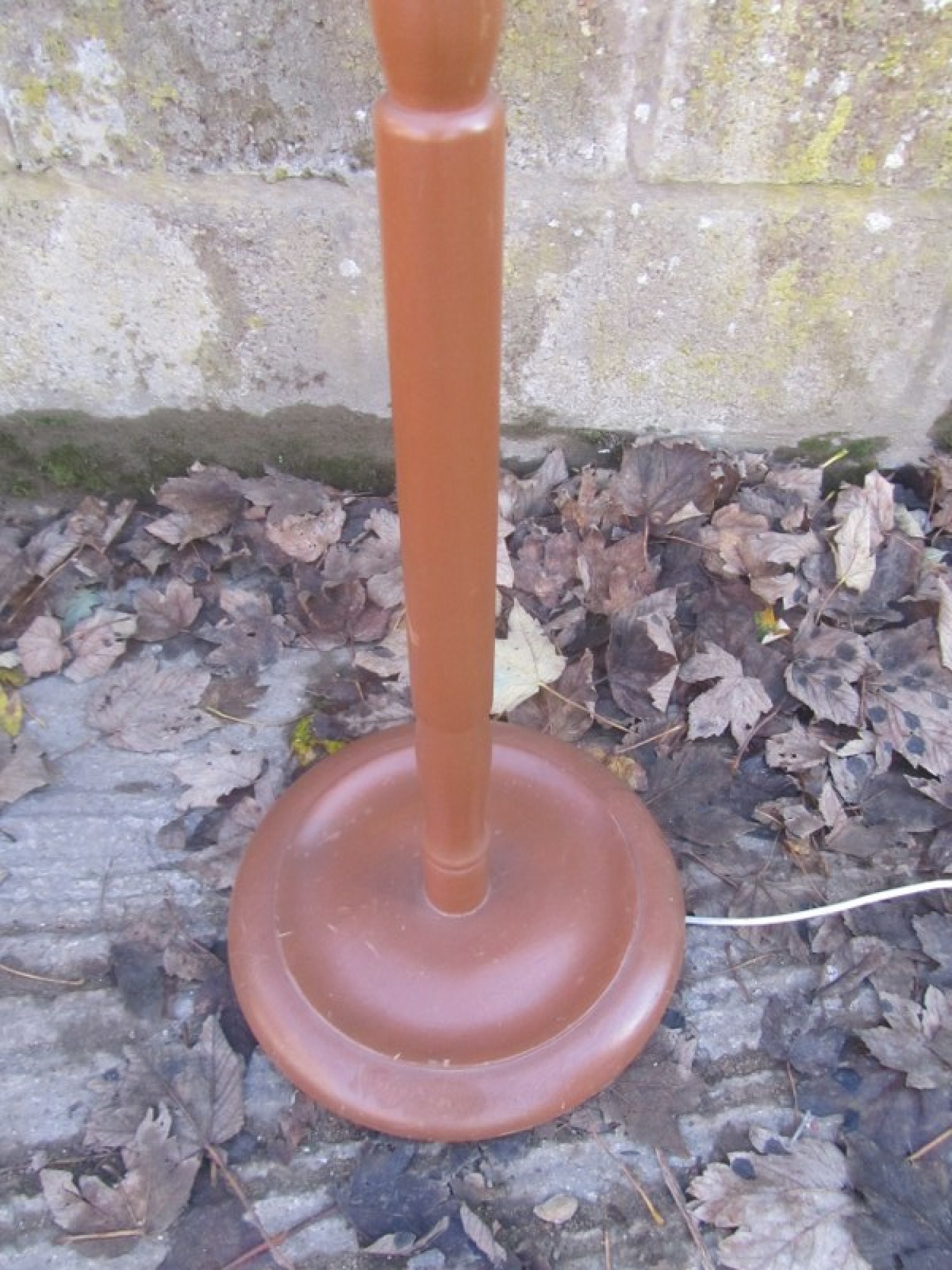 A TALL STANDARD LAMP IN A TEAK COLOUR, AN ATTRACTIVE AND STYLISH LAMP, IDEAL FOR ANYWHERE IN THE HOME. IT TAKES A STANDARD BULB.