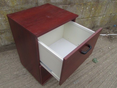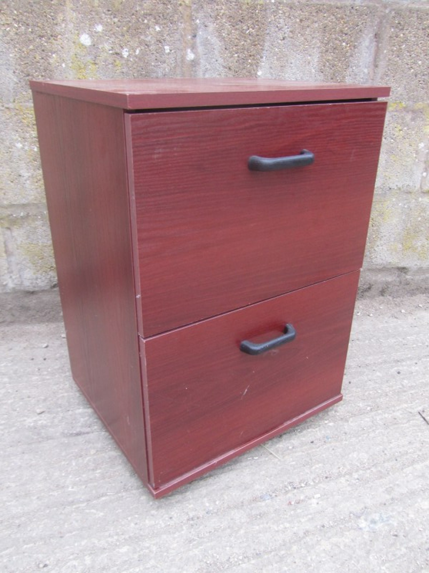 A 2 DRAWER FILING CABINET FOR THE HOME OR OFFICE. THE DRAWERS RUN WELL AND IT IS IN AVERAGE CONDITION. IT IS IN A MAHOGANY EFFECT VENEER, IT HAS SOME MINOR SCUFFS AND SCRATCHES.