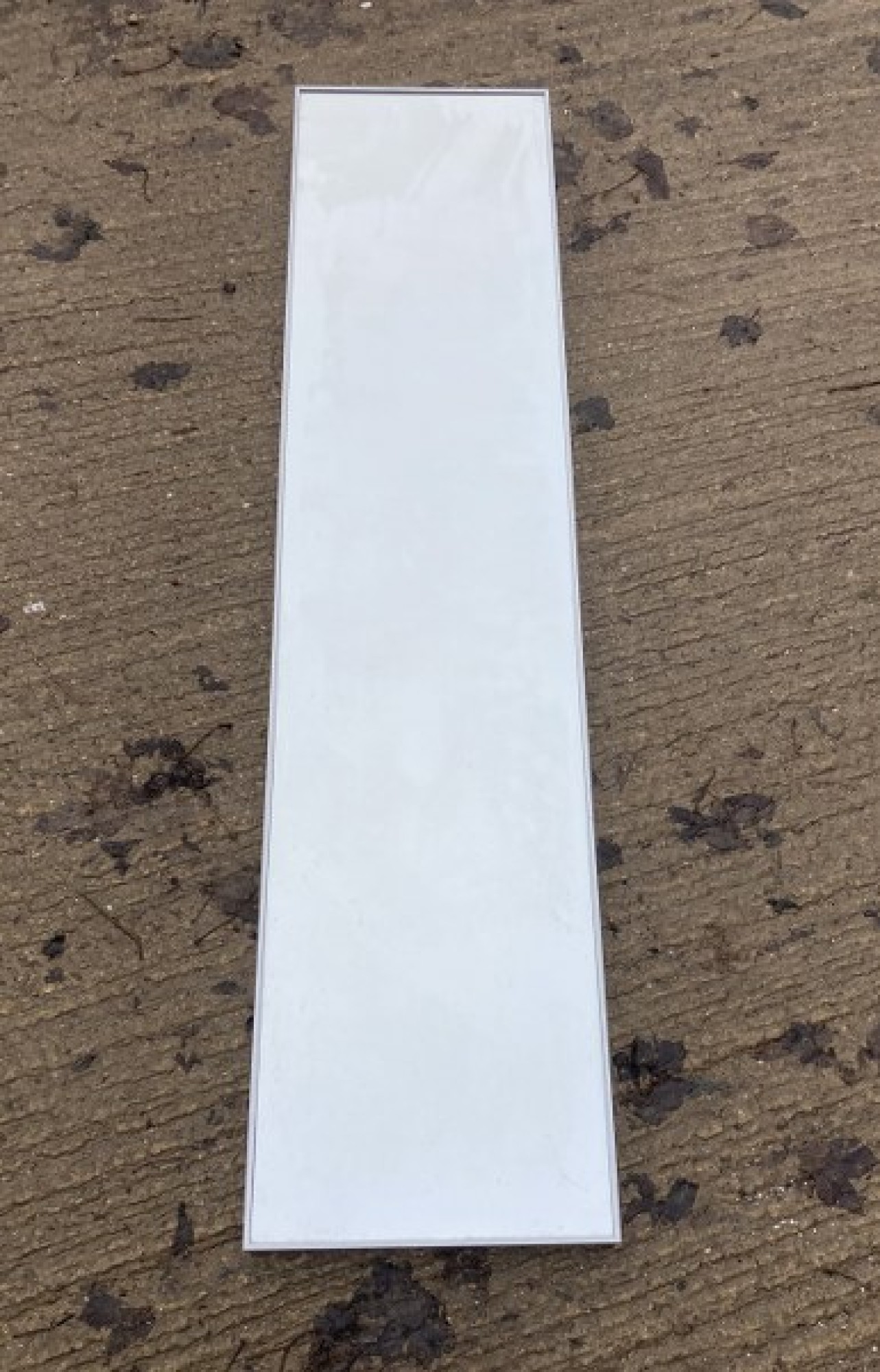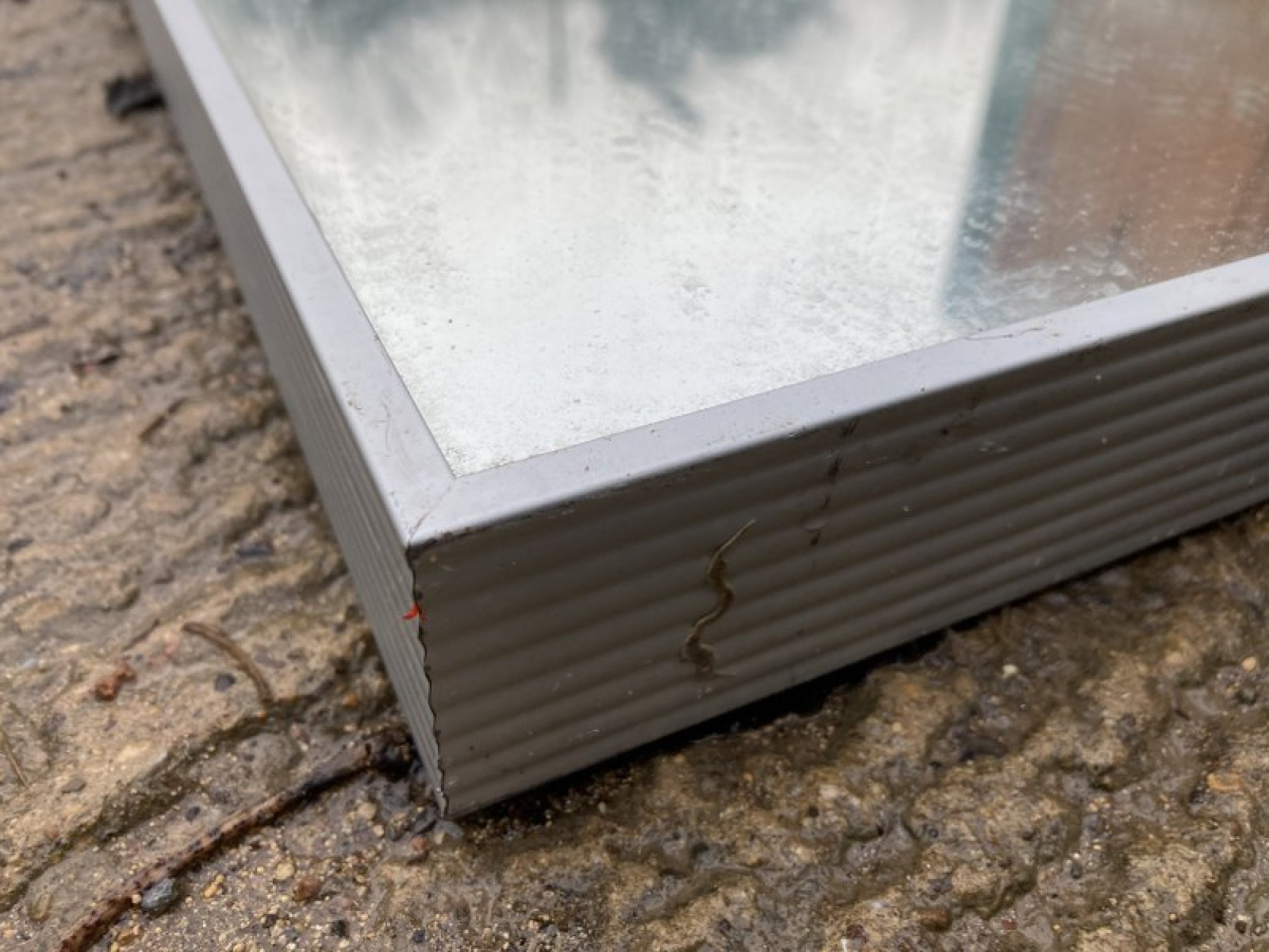 A TALL DRESSING MIRROR. THE MIRROR IS IN GOOD CONDITION. THE FRAME IS METAL.