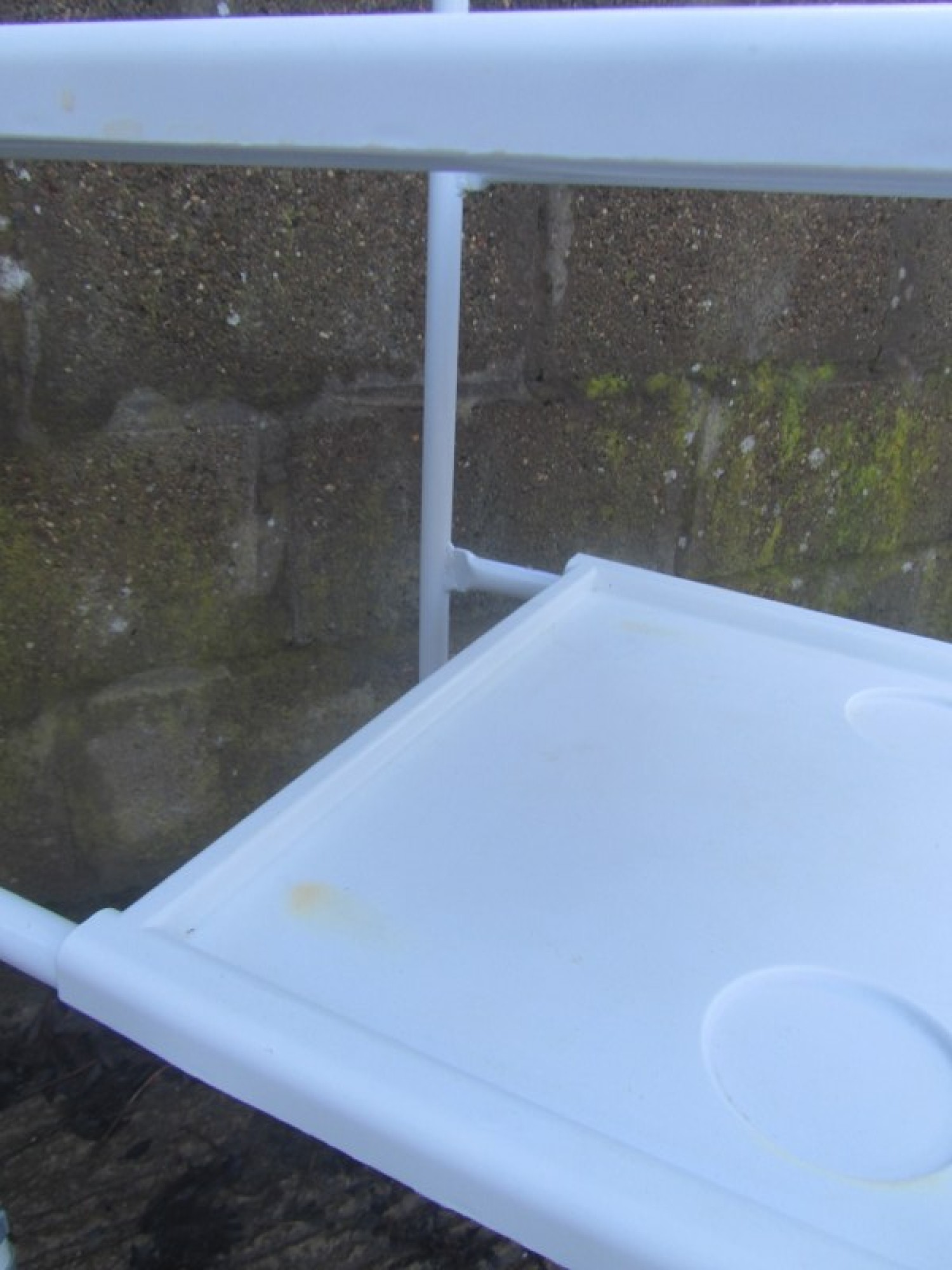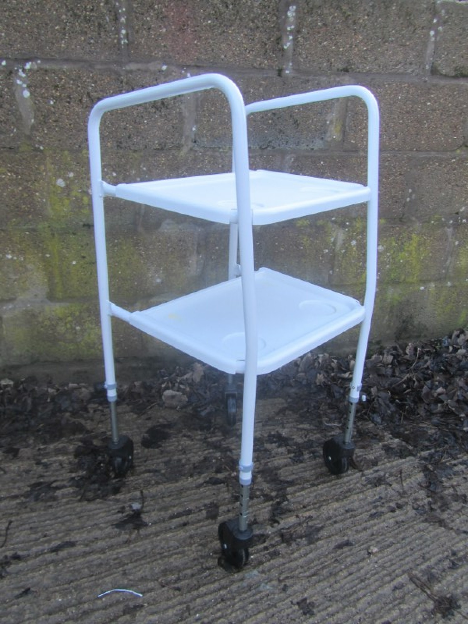 THIS IS A WHITE WALKER FRAME, IT HAS SWIVEL WHEELS AT THE FRONT AND BACK. SOME MARKS ON ONE TRAY. AVERAGE CONDITION. THERE ARE 2 TRAYS, IDEAL FOR MOVING FROM THE KITCHEN WITH MEALS etc. IT DOESN'T COLLAPSE FOR TRANSPORT / STORAGE. THE HEIGHT IS ADJUSTABLE.