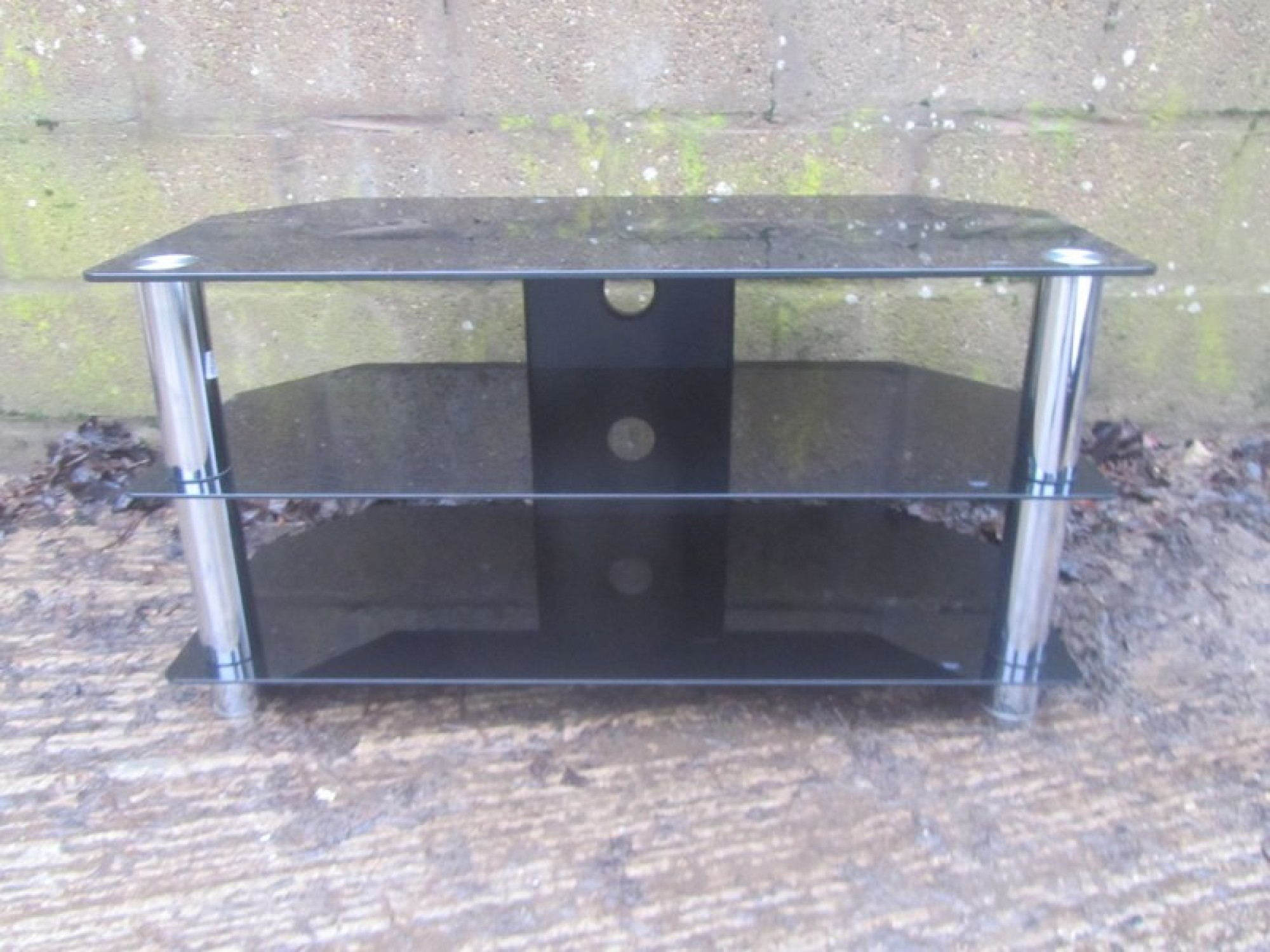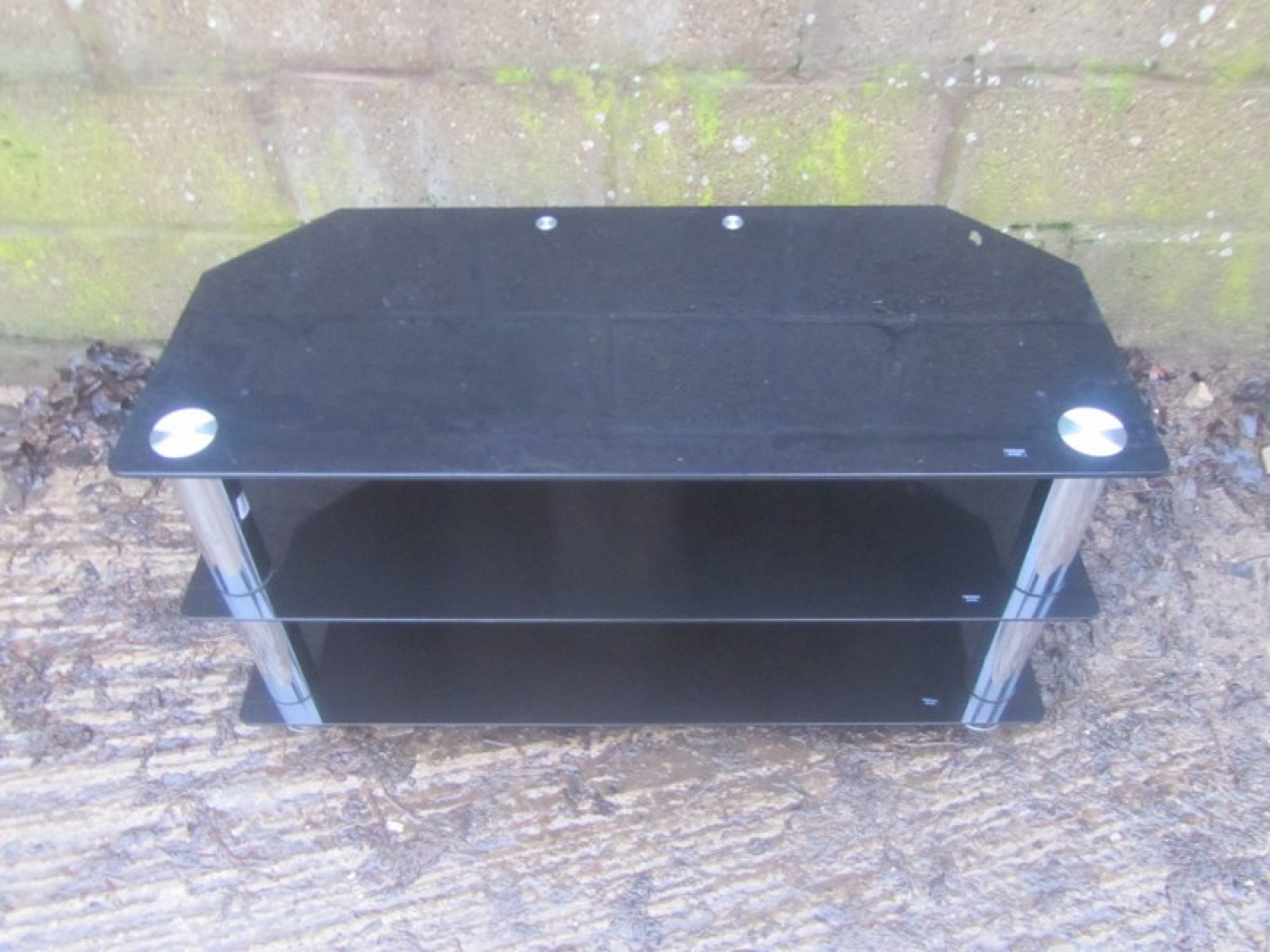 A TV STAND, IDEAL FOR SMALL MODERN TVs OR AS A COFFEE TABLE. MADE OF STRONG TOUGHENED BLACK GLASS. PLENTY OF SPACE FOR SKY BOX, DVD etc.