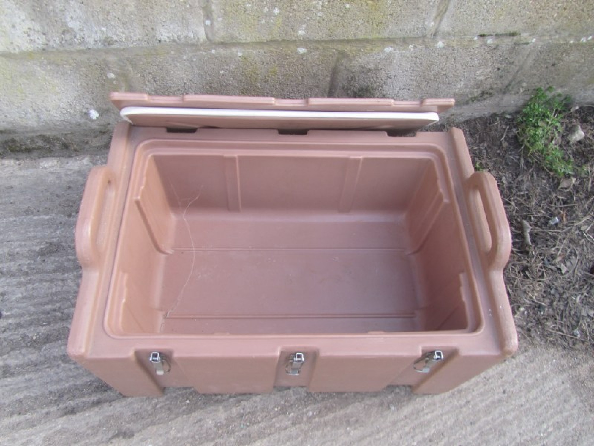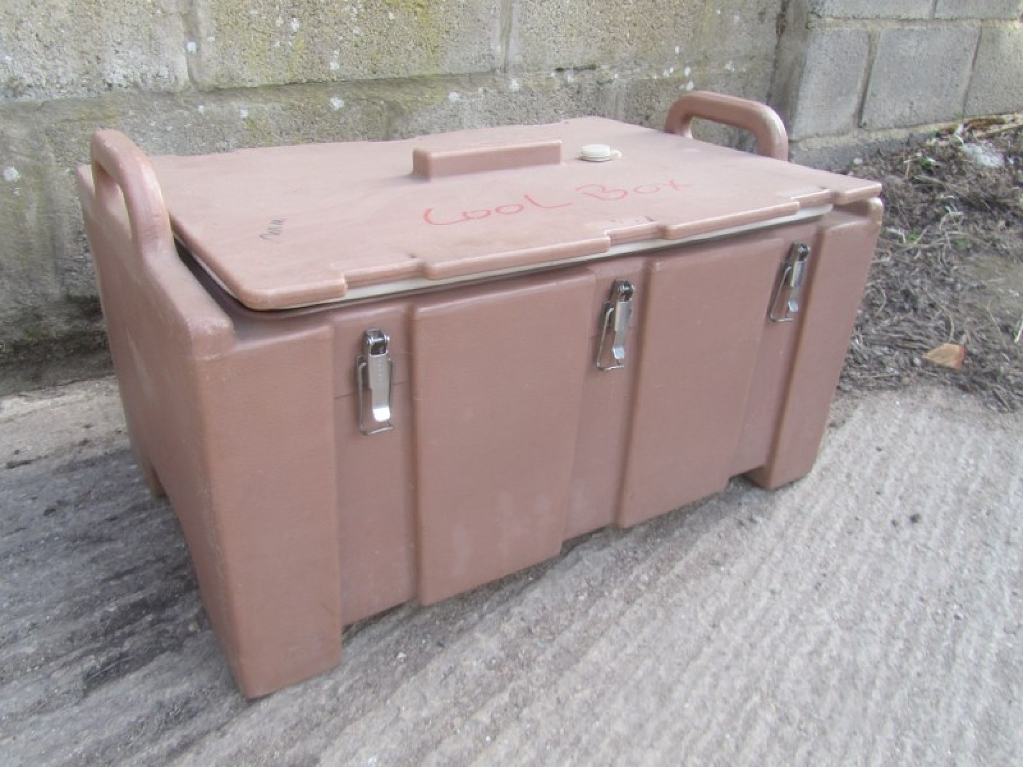AN INSULATED COOL BOX, IDEAL FOR TRANSPORTING OR STORING FOOD. CLIP ON TOP.